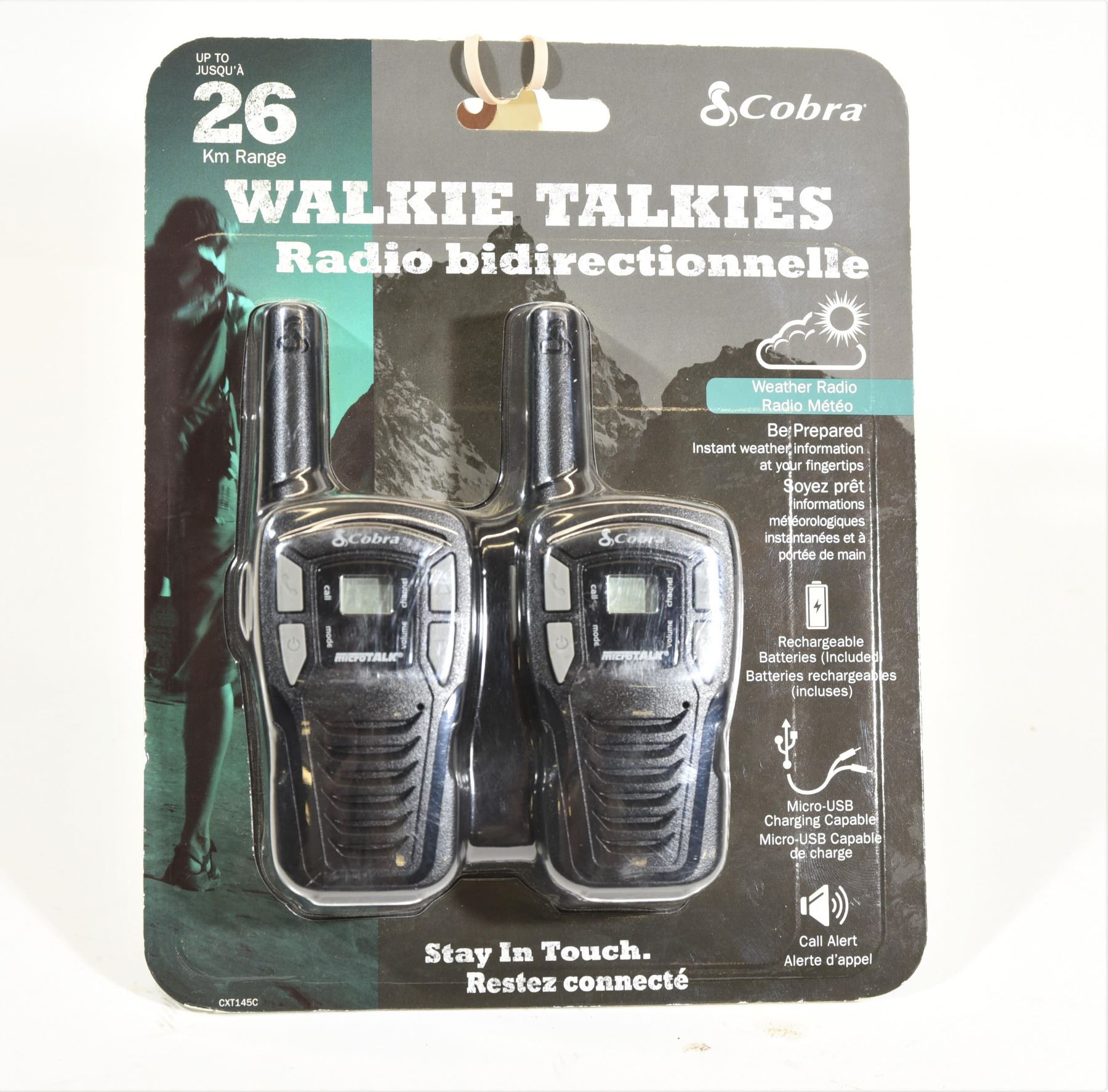 New in package, up to 26 km range, weather station, comes with rechargable batteries and usb charging cable