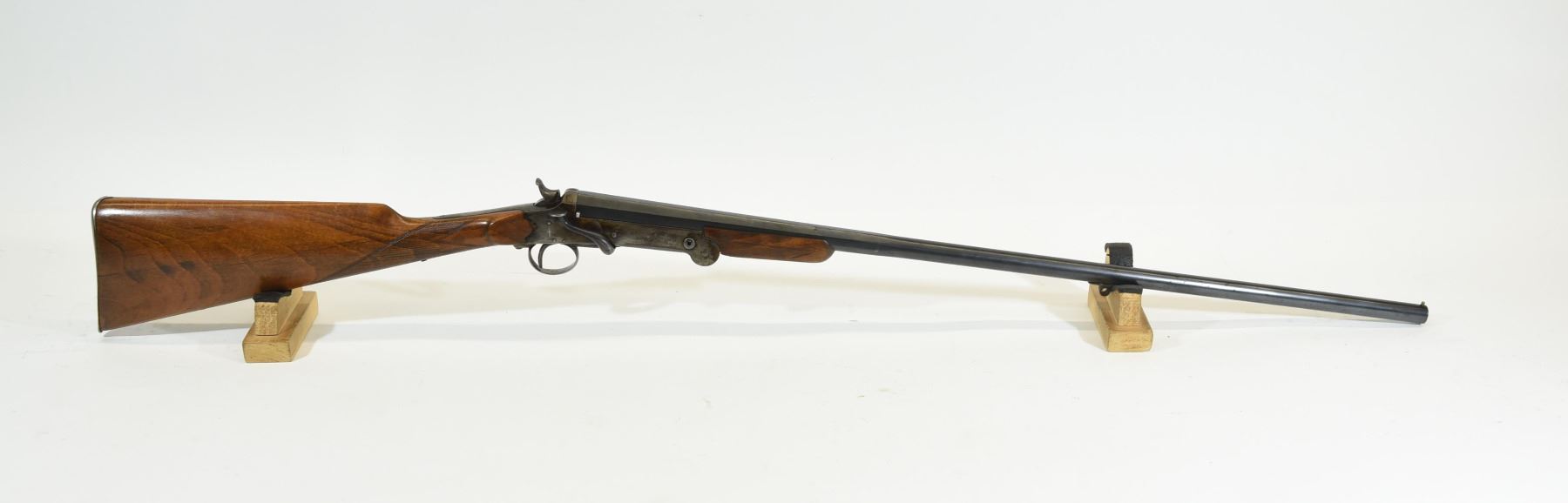 Non-restricted, single shot, 28Ga x 2 1/2", 28" half octagonal half round barrel, SN 222. Wood has been repaired through wrist, bluing is lightly pitted on barrel, receiver is grey with some case hardening evident, bore good.