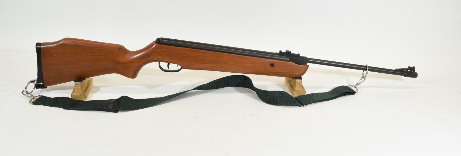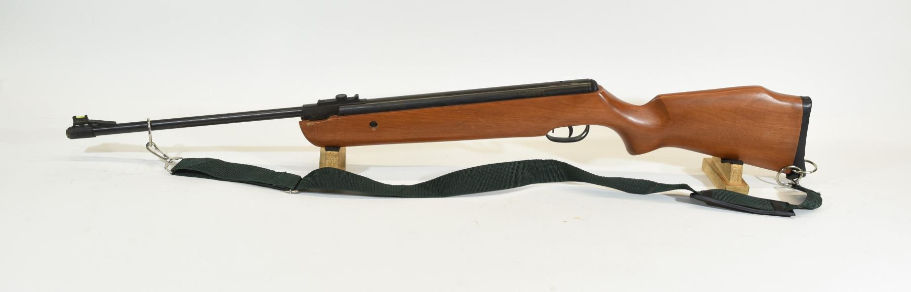 Under 500 FPS, 177 pellet, single shot. Wood hsa some dents, bluing lightly pitted, bore good SN C5M77X. Test fired with one pellet.