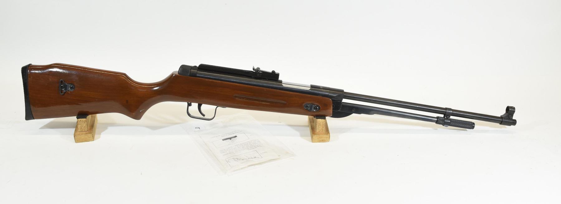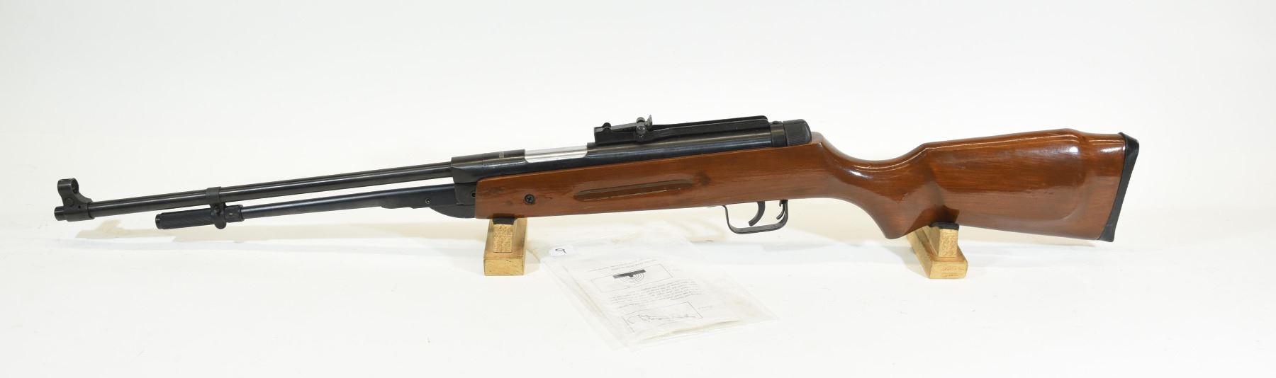 Pal required 600 fps, non restricted, under lever, 177 pellet, 18" barrel, SN none. Wood is in very good condition, bluing is very good, bore is very good. While cocking the unit fires. Needs seal work.