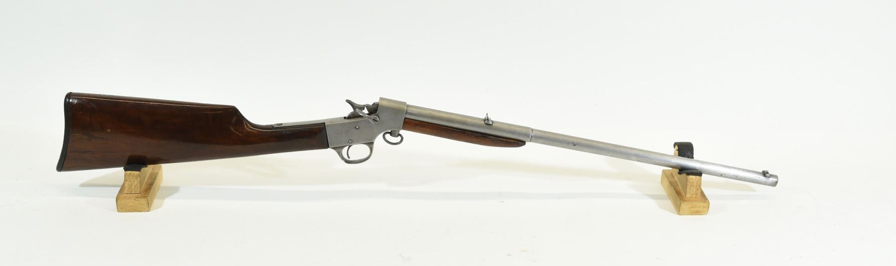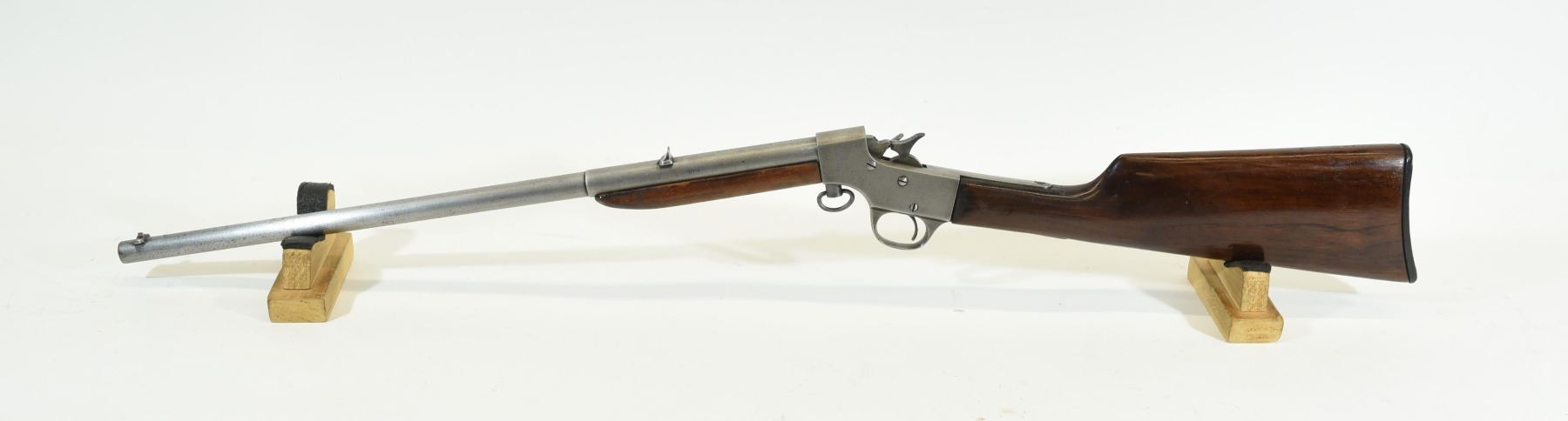 Non-restricted, single shot, 22LR, 20" barrel, SN F639. Wood cracked behind upper tang, bluing completely gone, bore very poor. Parts gun.