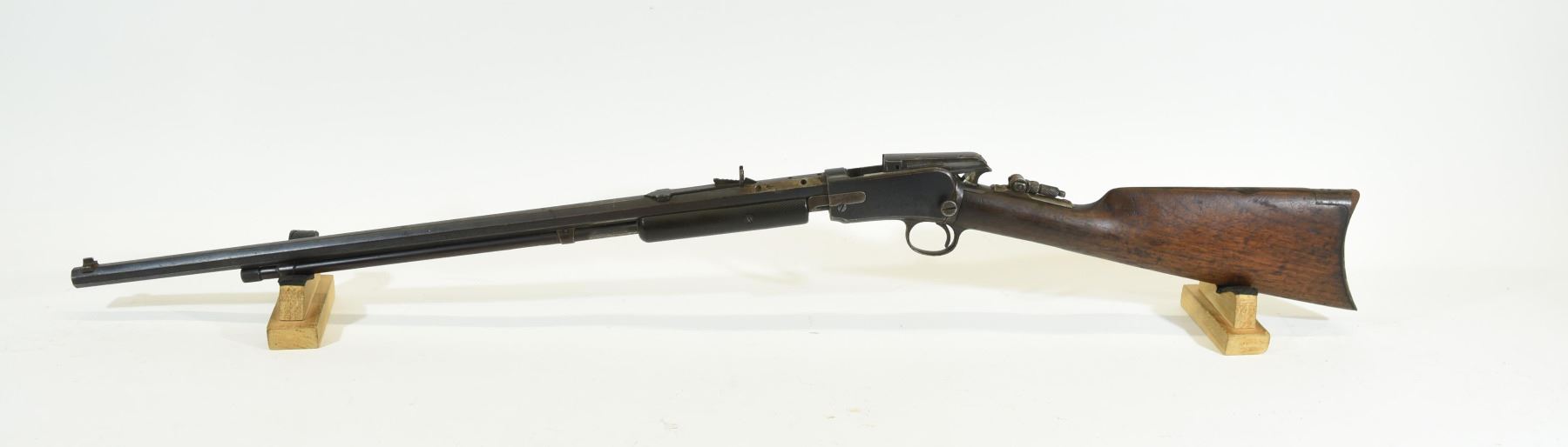 Non-restricted, pump action, 22LR, 23 1/2" octagonal barrel, SN 253553. Wood has dents, gouges and marks, bluing is brown, barrel drill in six spots, bore good. Lyman tang peep.