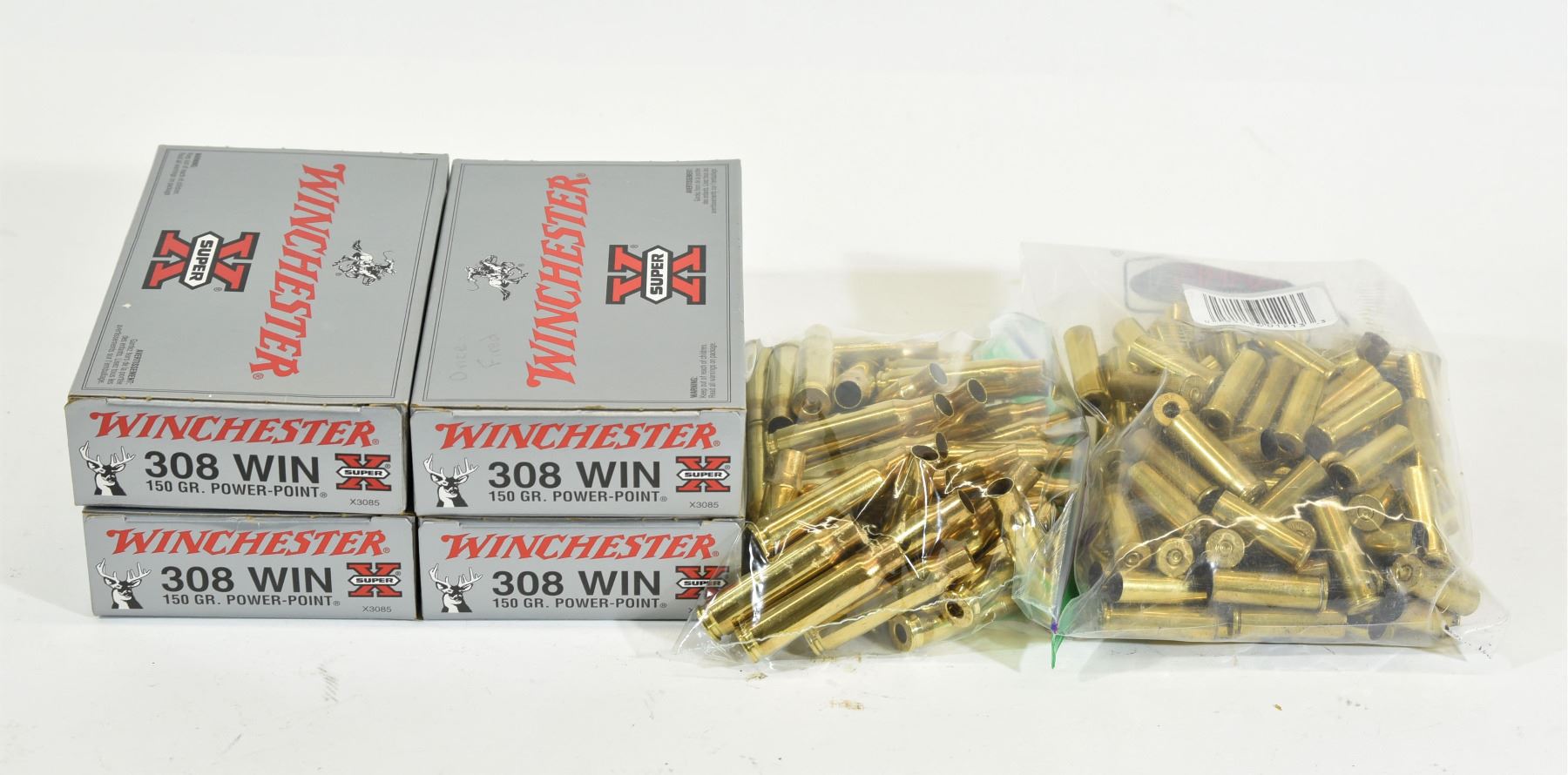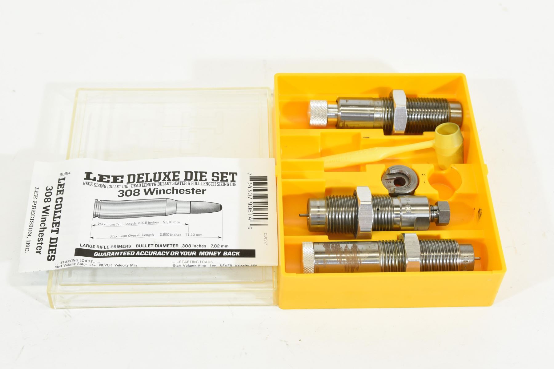 1) 308 Lee deluxe 3 pc. die set with shell holder and measurer, 308 Lee factory crimp die, 2) 60 pcs once fired brass, 20 pcs used brass and 49 pcs of new un primed brass 3) A mix of 120 pcs of new and used 38/357 brass