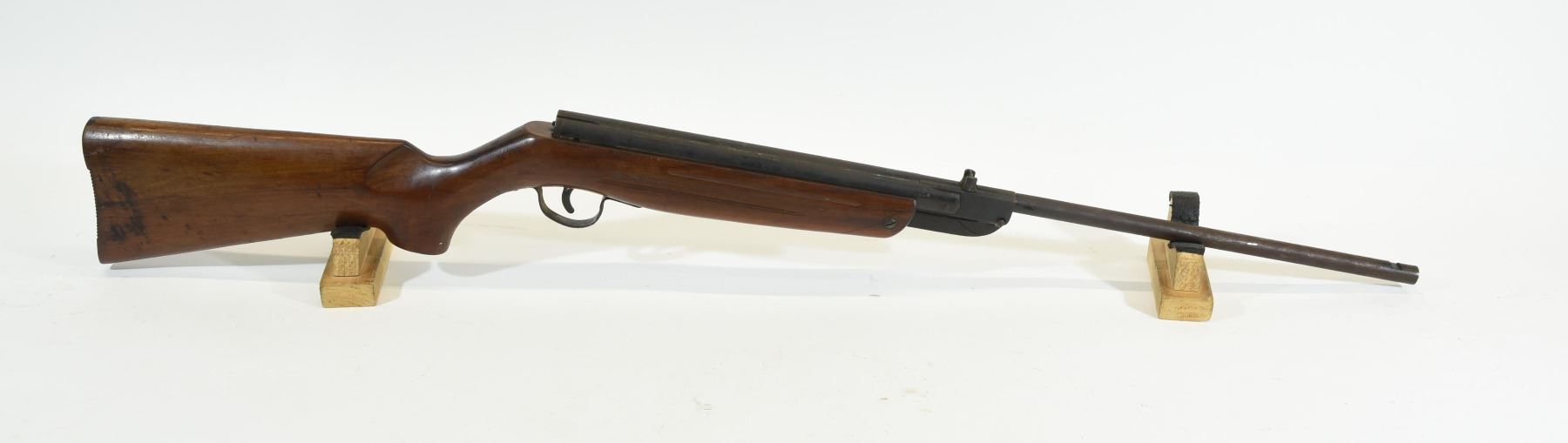 Under 500 FPS, 177 cal, 14 3/4" barrel, SN 22. Wood has a crack and some marks, bluing has light pitting all over, bore has some pit marks. Test fired with one pellet, pellet did not exit, suspect seal problem.
