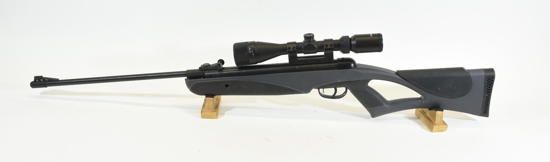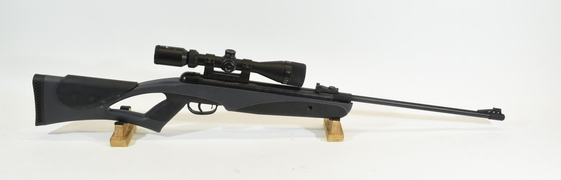 Non-restricted, single shot, 177 pellet, 18 1/2" barrel, SN 308DD0474. Synthetic stock has some marks, bluing good, bore very good. Comes with 3-9 x 40 AO scope. Test fired OK with one pellet.