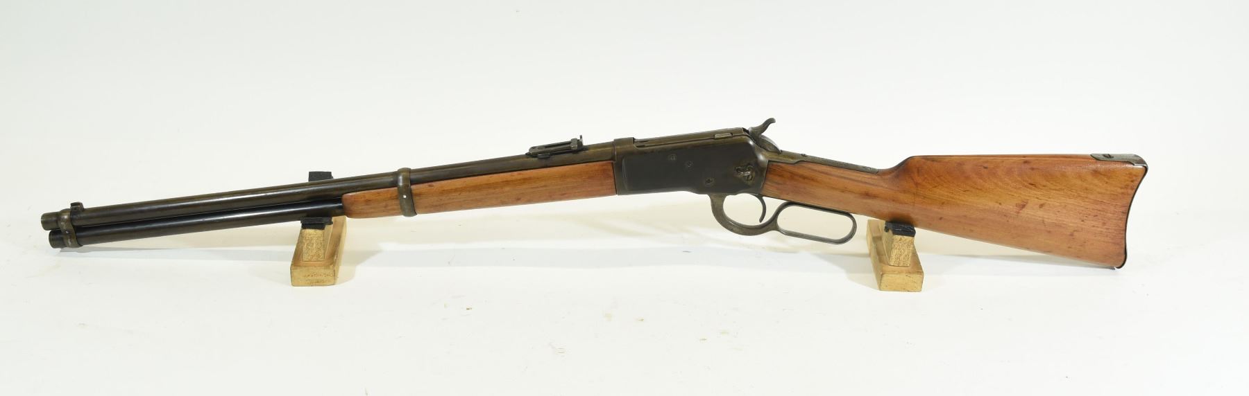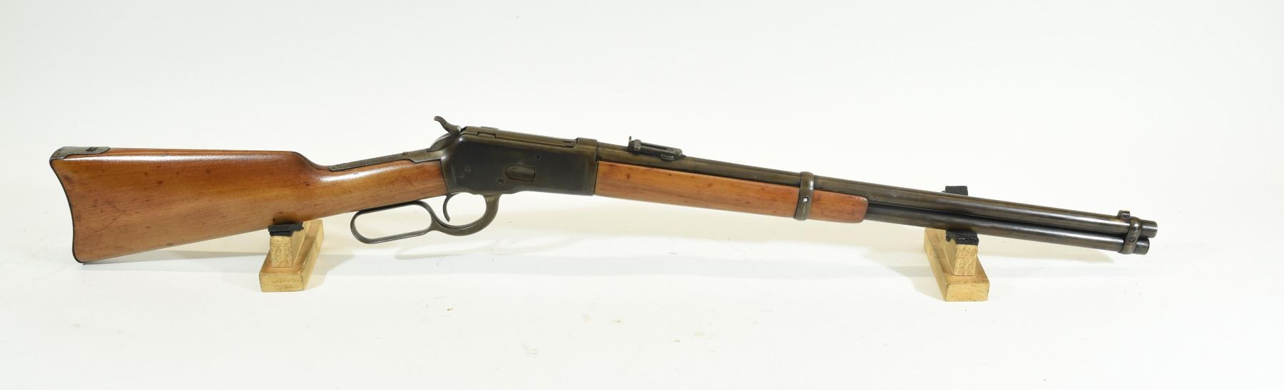 Non-restricted, lever action, 44 WCF, 20" barrel, SN 336528. Wood refinished and over sanded, bluing is brown, bore pitted.