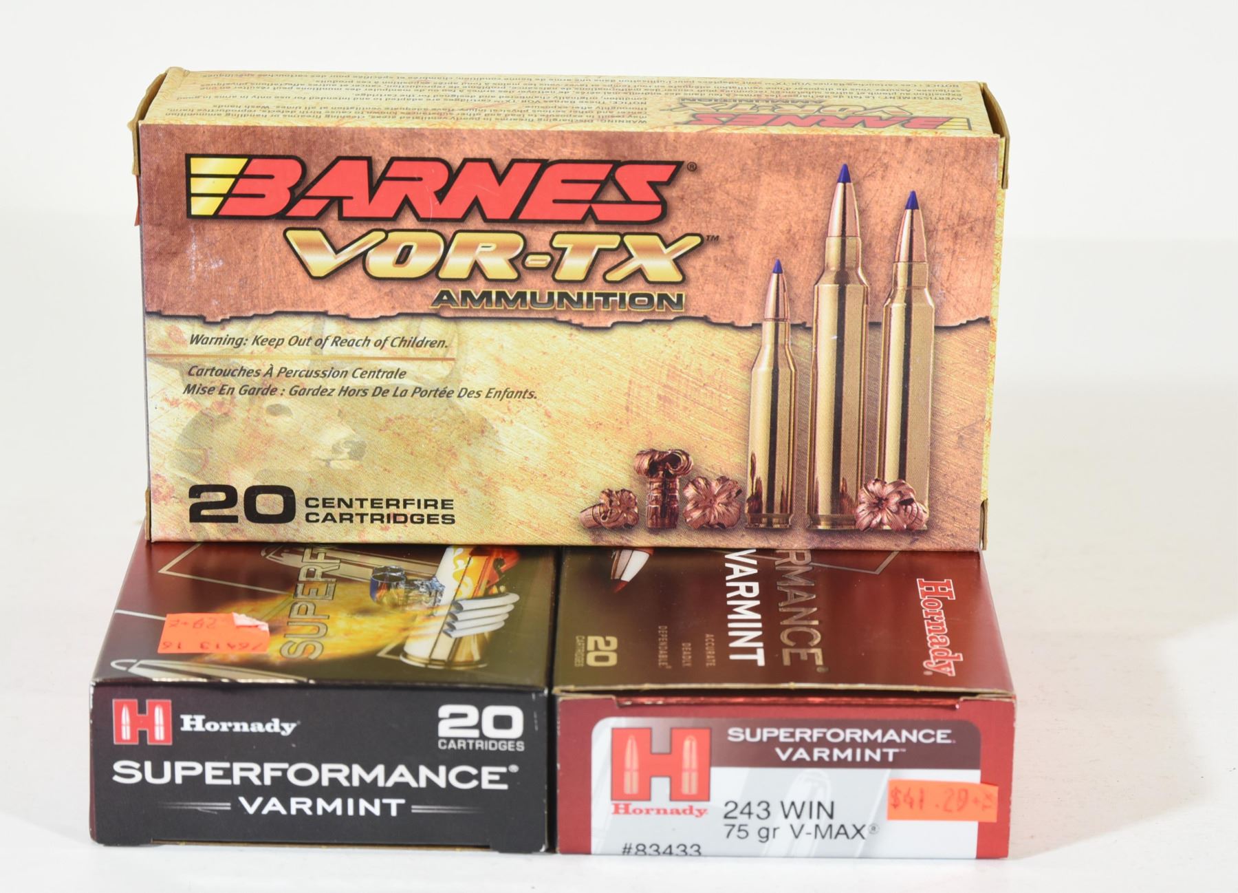 40 Rnds Hornady 75grn VMAX and 20 Rnds Barnes 80grn TSX BT.