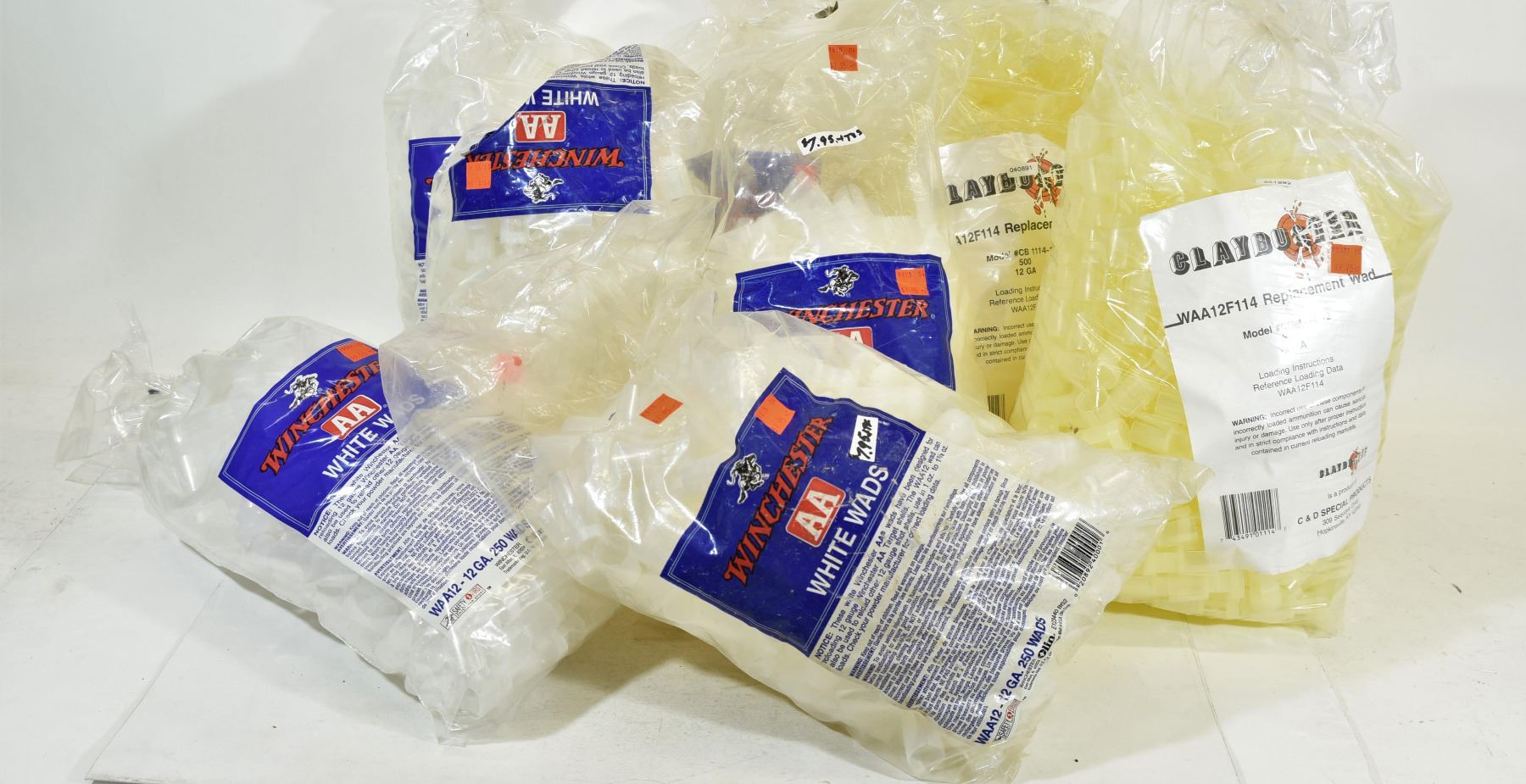 Two bags of 500 Claybuster AA 12GA Wads Yellow Six bags of 250 Claybuster AA 12GA Wads White