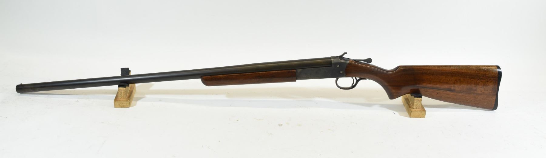 Non-restricted, single shot, 12Ga x 2 3/4", 30" barrel with fixed full choke, SN 23800. Wood butt stock cracked full length, bluing is brown with some case hardening evident on receiver, bore very good.