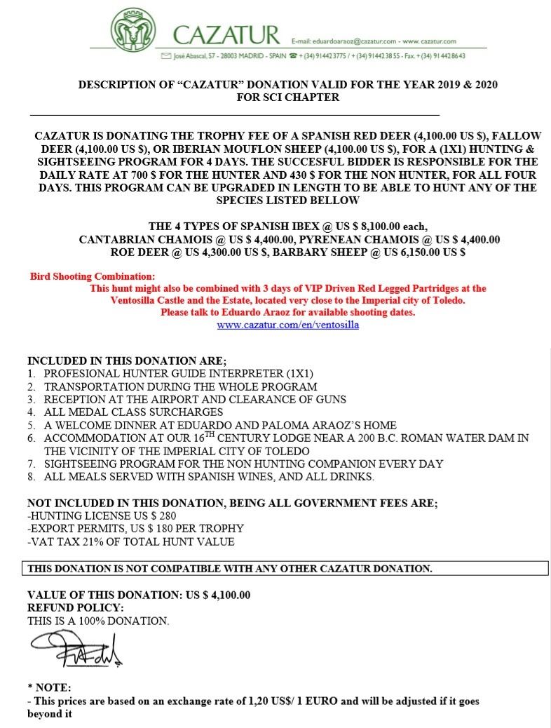 Eduardo de Araoz and Cazatur is donating the trophy fee ($4100) for hunter’s choice of Iberian Red Deer, Fallow Deer or Iberian Mouflon Sheep. The successful bidder is responsible for the daily rate of $700 for the hunter and $430 for the non-hunter for all four days. Hunt can be ungraded in length for hunter to hunt additional animals at trophy fees listed: 4 types of Spanish Ibex ($8100 each), Cantabrian Chamois ($4400), Pyrenean Chamois ($4400), Roe Deer ($4300), Barbary Sheep ($6150). This hunt may also be combined with 3 days of VIP Driven Red Legged Partridges at the Ventosilla Castle and the Estate, which is located very close to the Imperial city of Toledo. Contact the outfitter for available shooting dates. Hunt to be taken 2019 or 2020. Includes: Accommodations and meals, 1x1 professional hunter/guide/interpreter, transportation during hunt, reception at airport and clearance of guns, all medal class surcharges, welcome dinner at Eduardo & Paloma Araoz’s home, and sightseeing program for the non-hunting companion each day. Not Included: Government fees – hunting license ($280), export permits ($180 per trophy), VAT Tax (21% of total hunt value). Tel: +34 914 423 775 eduardoaraoz@cazatur.com www.cazatur.com