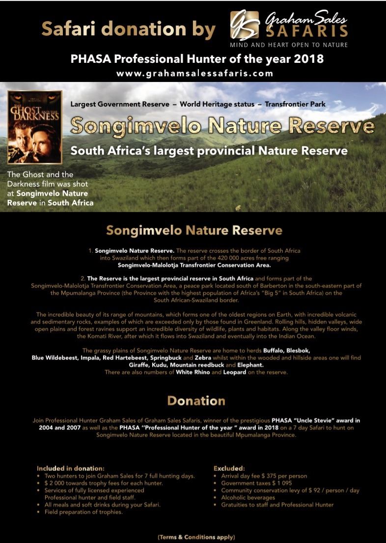Join Professional Hunter Graham Sales, recipient of the PHASA “Hunter of the Year Award” for 2018, on this 7 day safari for 2 hunters on Songimvelo Nature Reserve located in the beautiful Mpumalanga Province. The Reserve is home to a wide variety of plains game as well as Giraffe, Kudu and Elephant. The hunt includes a $2000 credit toward trophy fees for each hunter, a professional hunter and field staff, field preparation of trophies and all meals and soft drinks. Not included are arrival day fee ($375/person), Govt. taxes ($1095), conservation levy ($92/person/day), gratuities and alcoholic beverages. Species available on quota are Blesbuck, Blue Wildebeest, Cape Buffalo, Cape Eland, Giraffe, Impala, Kudu, Mountain Reedbuck, Nyala, Red Hartebeest, Waterbuck and Zebra. Valid for: 2019 or 2020 (OR 2021 upon agreement by Outfitter). www.grahamsalessafaris.com