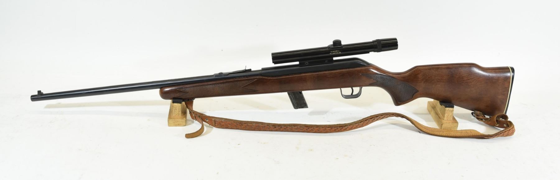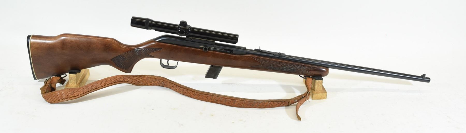 Non restricted, semi auto, .22 lr, 20 1/4" barrel, SN CA124381, wood is very good with just a few light marks, bluing is good, bore is excellent, comes with sling, Bushnell 4X custom .22 scope and one mag