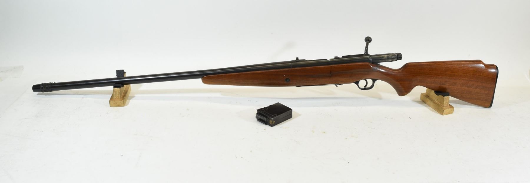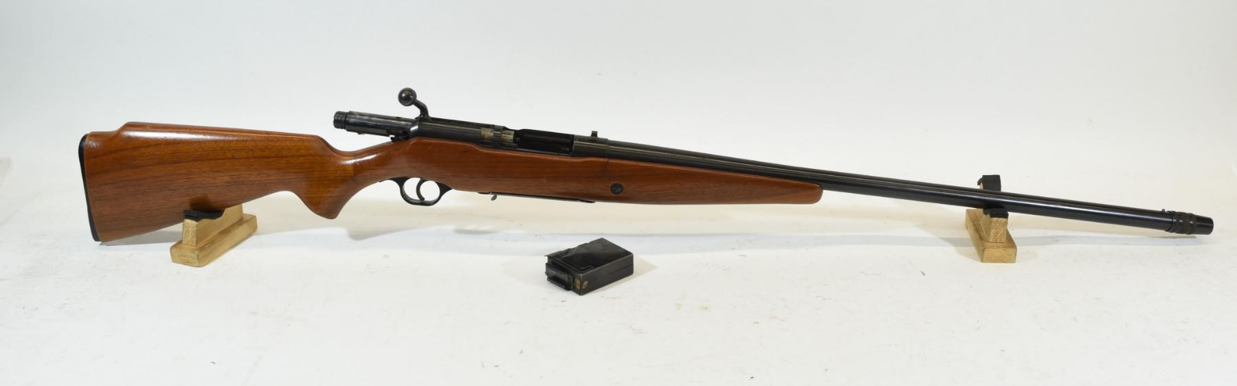 Non restricted, bolt action, 12 ga. 2 3/4", 28" barrel with a full screw on choke , SN none, wood has a bad crack on left side from back of receiver running toward rear sight about 8" long and a bad crack on the right side where barrel meets the receiver, bore is good