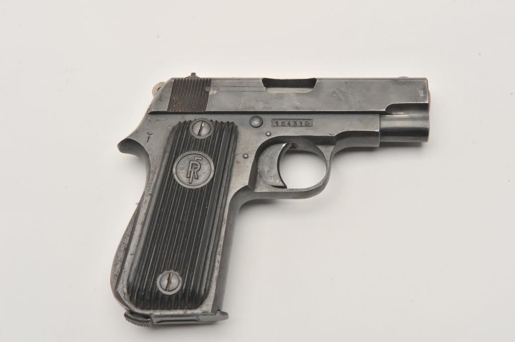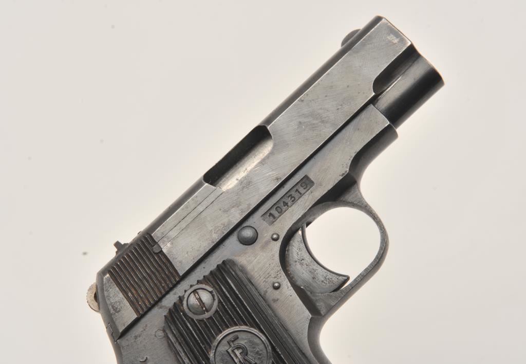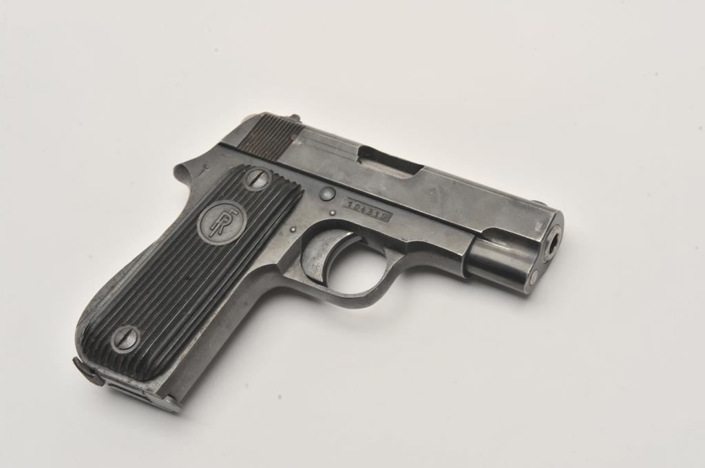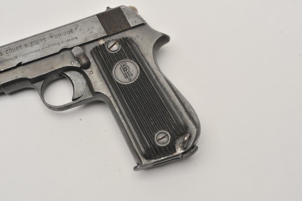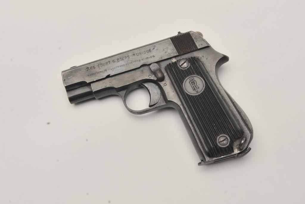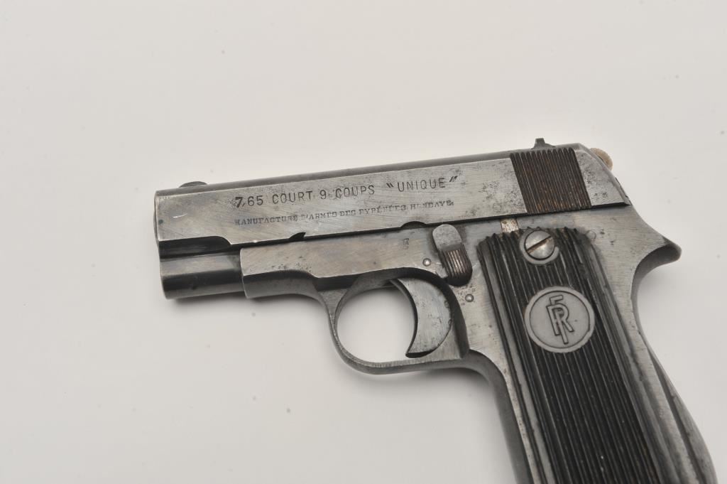 French Unique semi-automatic pistol, .32 caliber, Serial #104319. The pistol is in very good overall condition with a 3” barrel. The metal surfaces retain the majority of their blue finish with holster wear at the muzzle, scratches and mars from carry and use. The ridged plastic grips are in good condition showing small mars and scratches. There is a lanyard ring at the butt of the pistol. The lot includes one, magazine with non-matching serial #. The bore is good, the action is crisp and the marks are sharp on this French pre-war pistol with no import marks. Est.: $125-$250. (C+R).