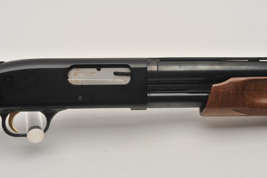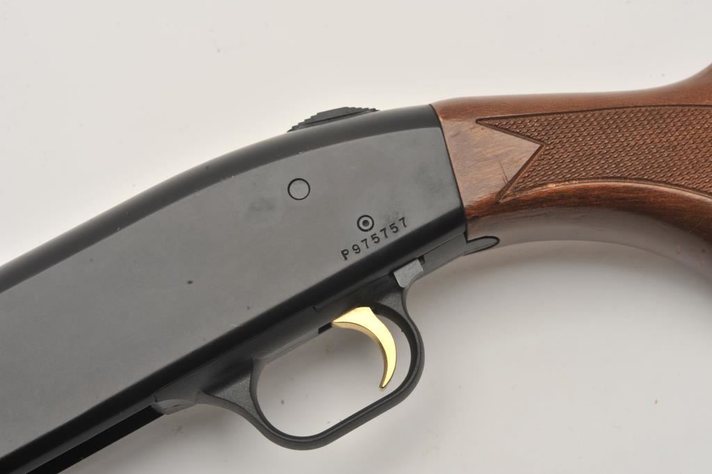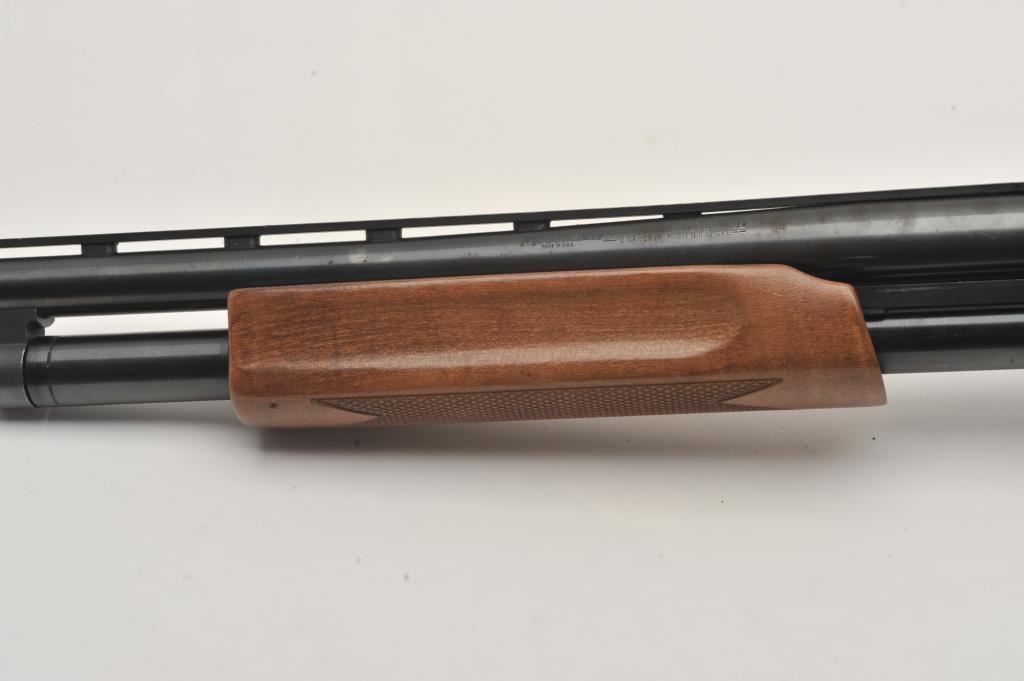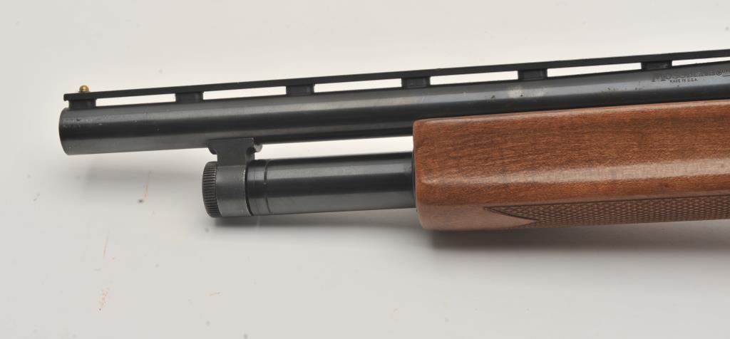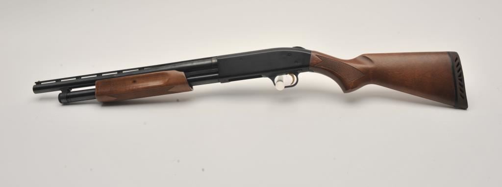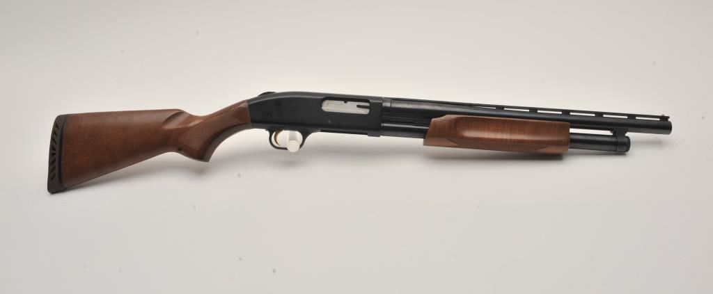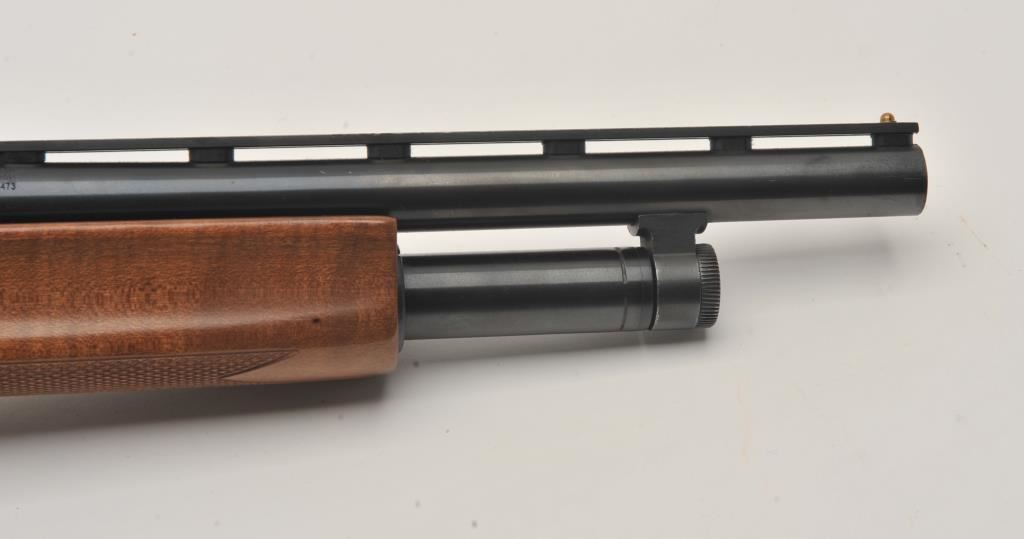 Mossberg 500A pump shotgun, 12 gauge, Serial #P97557. The shotgun is in very good overall condition with a shortened 18” barrel with a full-length ventilated rib. The metal surfaces retain the majority of their blue finish with small mars from carry and use and the top of the receiver has been drilled and tapped. The barrel has been shortened to 18” and the brass bead front sight re-positioned. The checkered wood stocks are in good condition and the butt stock ends with a rubber ventilated pad providing a 14” LOP. The bore is good, the action crisp and markings are sharp. Est.: $200-$400. (Modern).