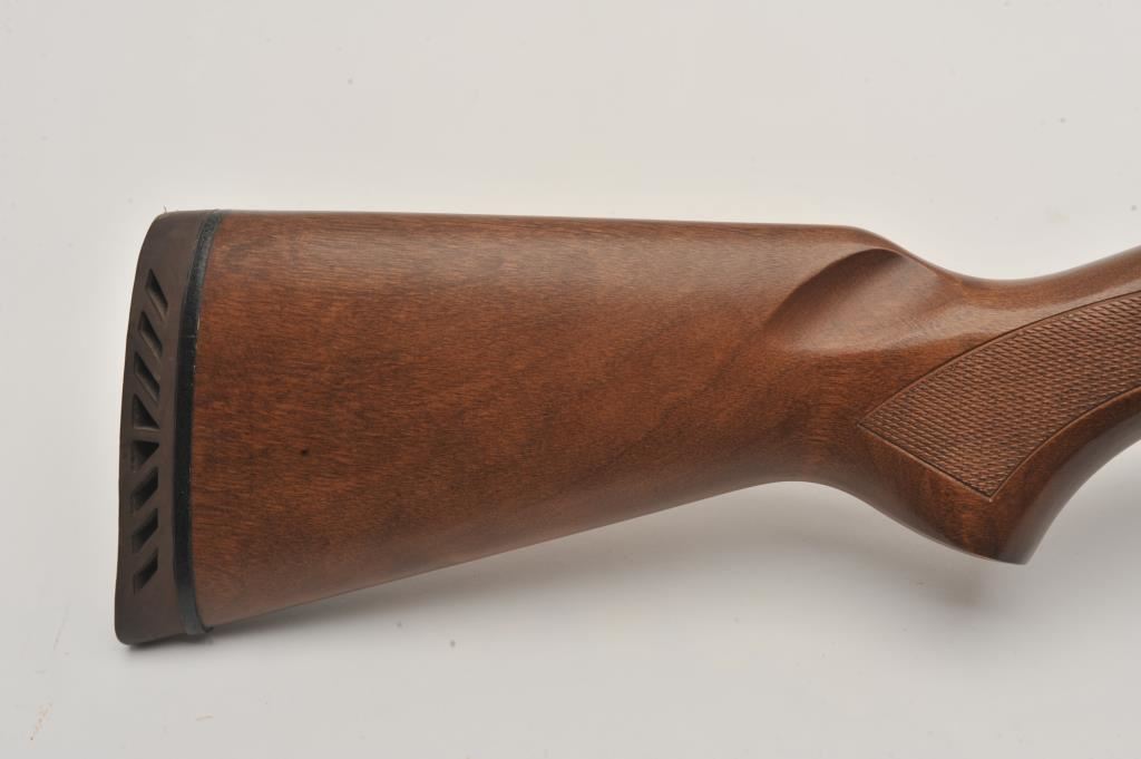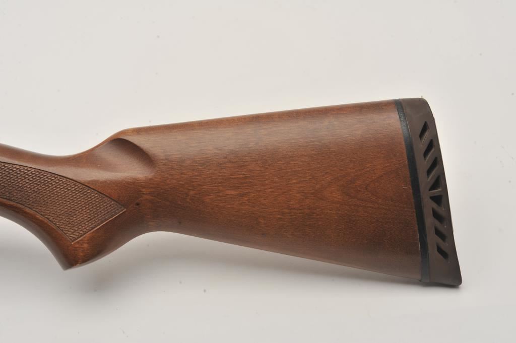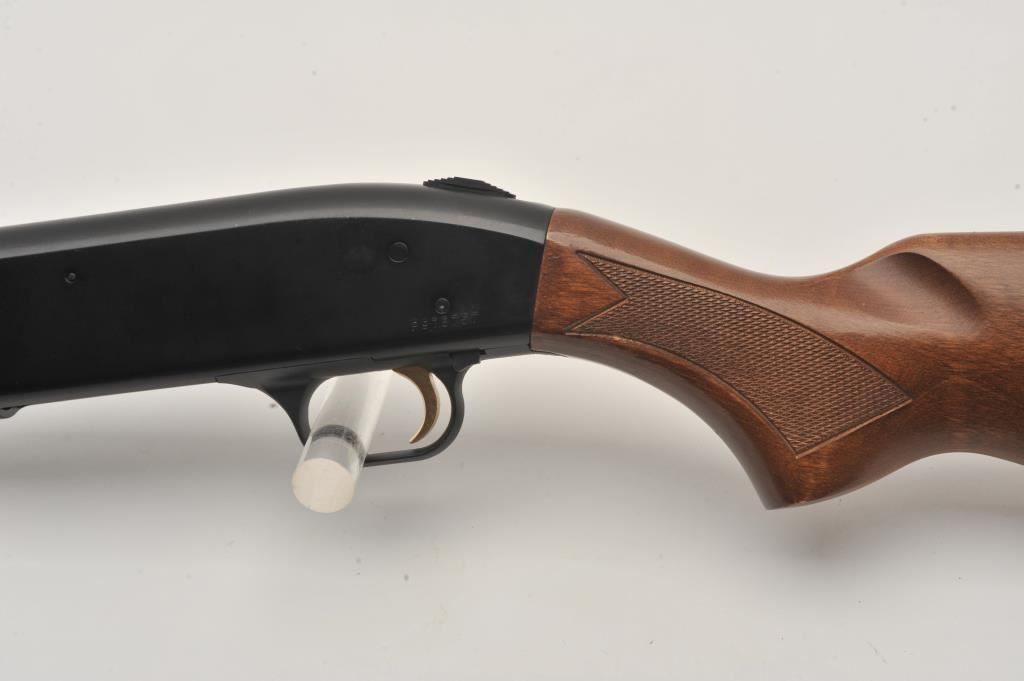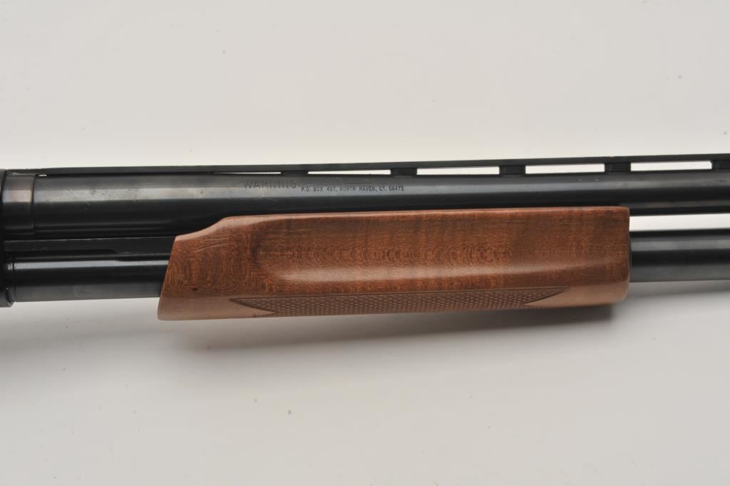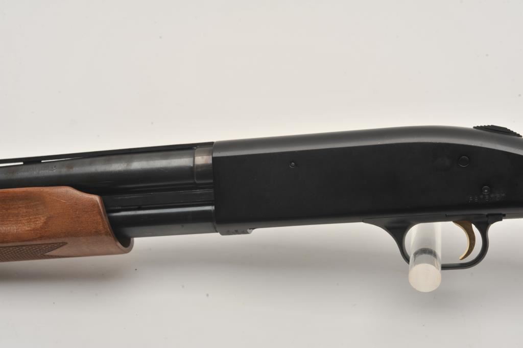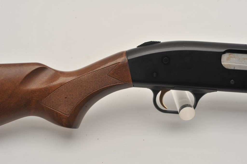 Mossberg 500A pump shotgun, 12 gauge, Serial #P97557. The shotgun is in very good overall condition with a shortened 18” barrel with a full-length ventilated rib. The metal surfaces retain the majority of their blue finish with small mars from carry and use and the top of the receiver has been drilled and tapped. The barrel has been shortened to 18” and the brass bead front sight re-positioned. The checkered wood stocks are in good condition and the butt stock ends with a rubber ventilated pad providing a 14” LOP. The bore is good, the action crisp and markings are sharp. Est.: $200-$400. (Modern).