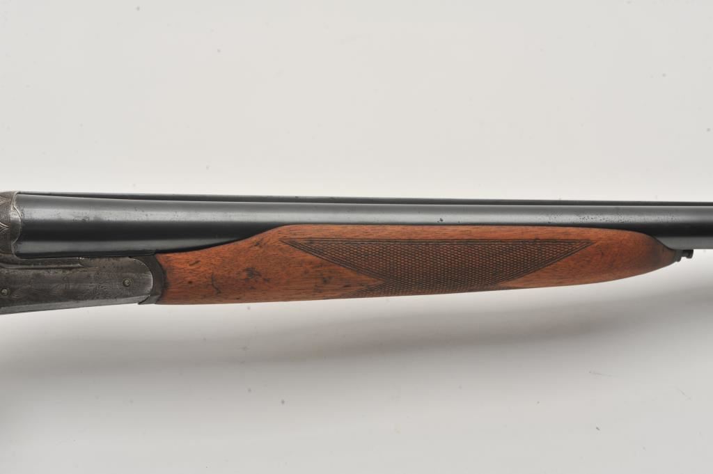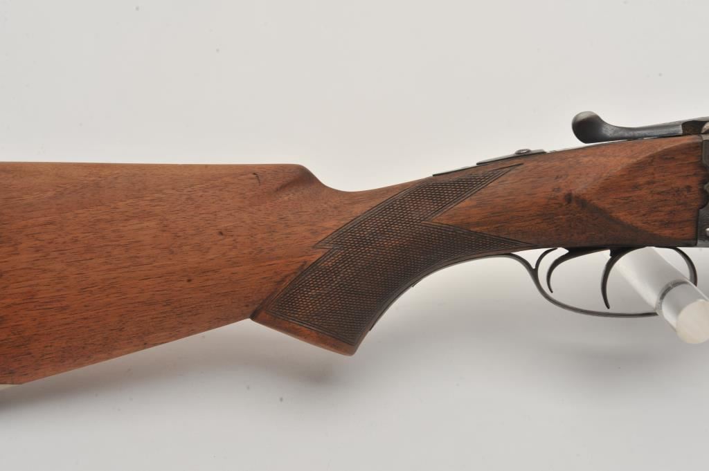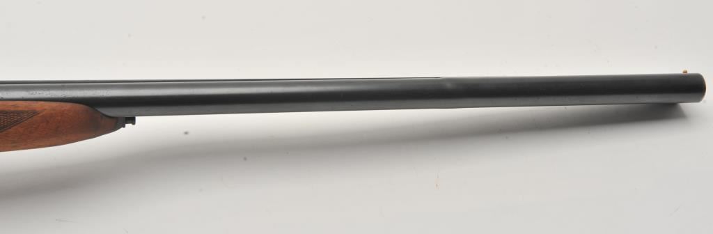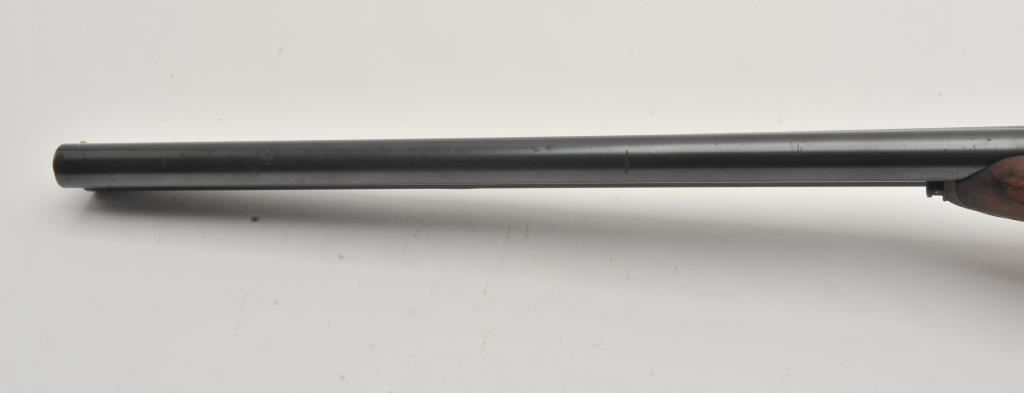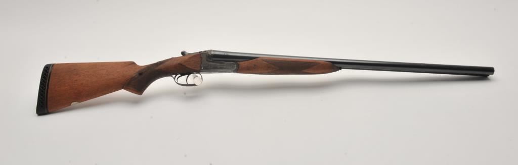 Stoeger Arms Model Zephyr Woodlander S x S shotgun, 12 gauge, Serial #124159. The shotgun is in good overall condition with 27 ½” barrels with an ivory bead front sight and full-length filed rib. The barrels retain the majority of their blue finish with a dent and bulge approximately 7” from the muzzle on the right barrel. The receiver shows old toned case hardening and tasteful game scene engraving. The shotgun is marked, “MADE IN SPAIN” at the rear of the trigger guard. The checkered wood stocks are in good condition having been sanded down. The shotgun features a beavertail fore end and the butt ends with a ventilated rubber pad providing a 14 ½” LOP. The bores are fair, the action functions and the markings are sharp. Est.: $175-$350. (C+R).