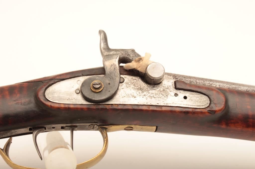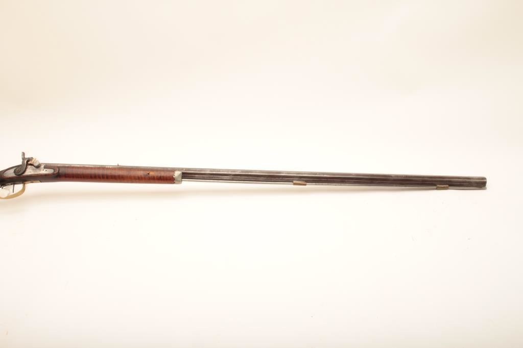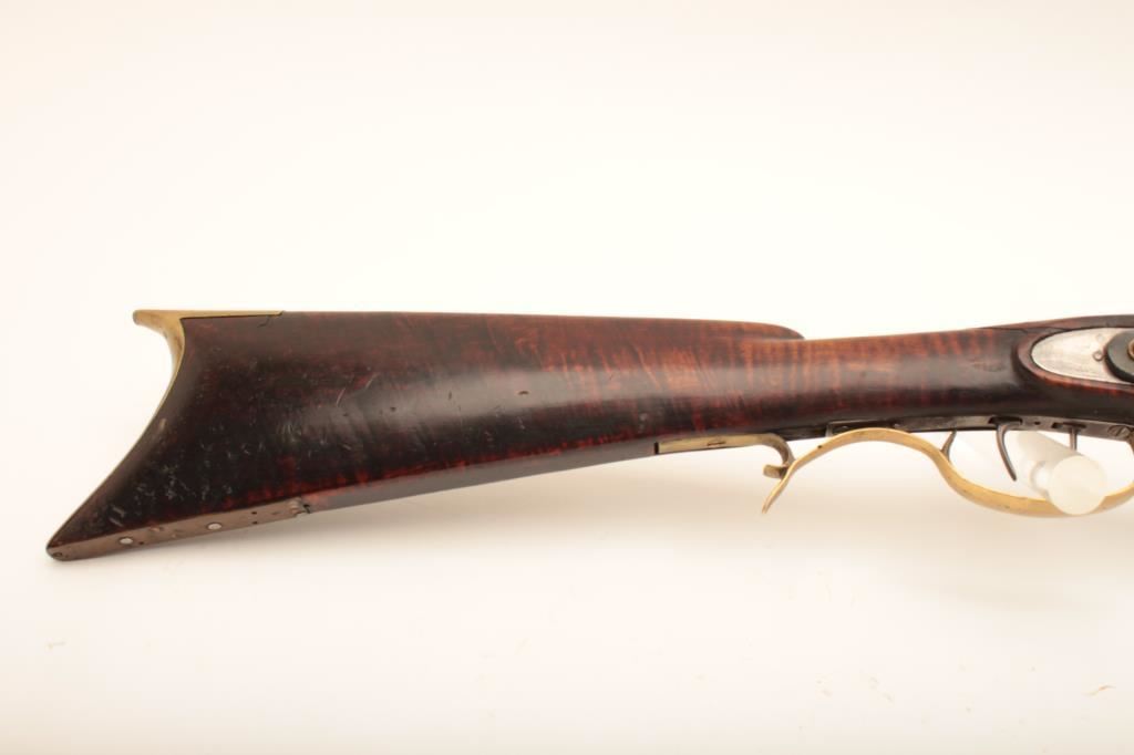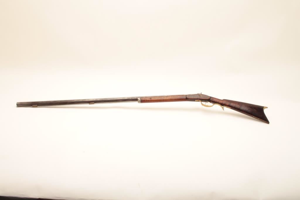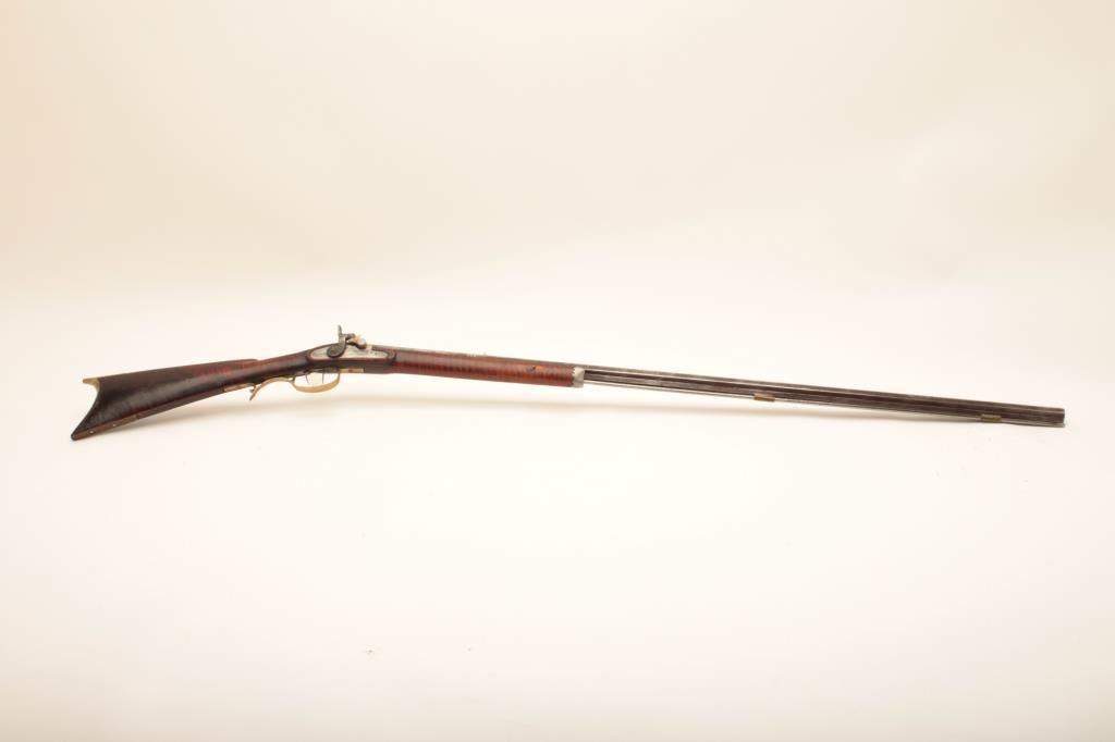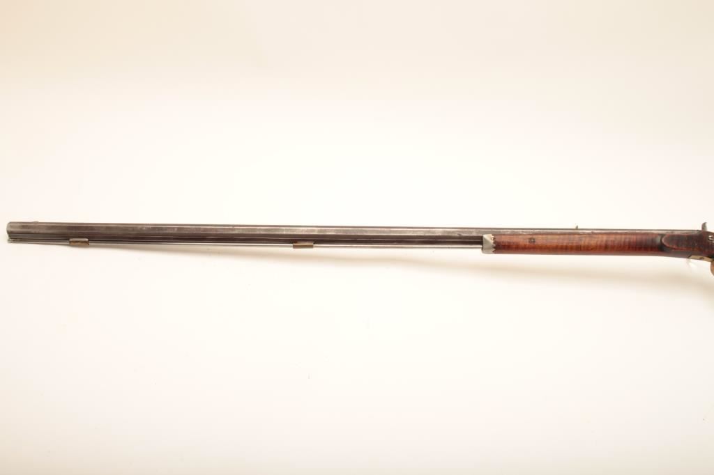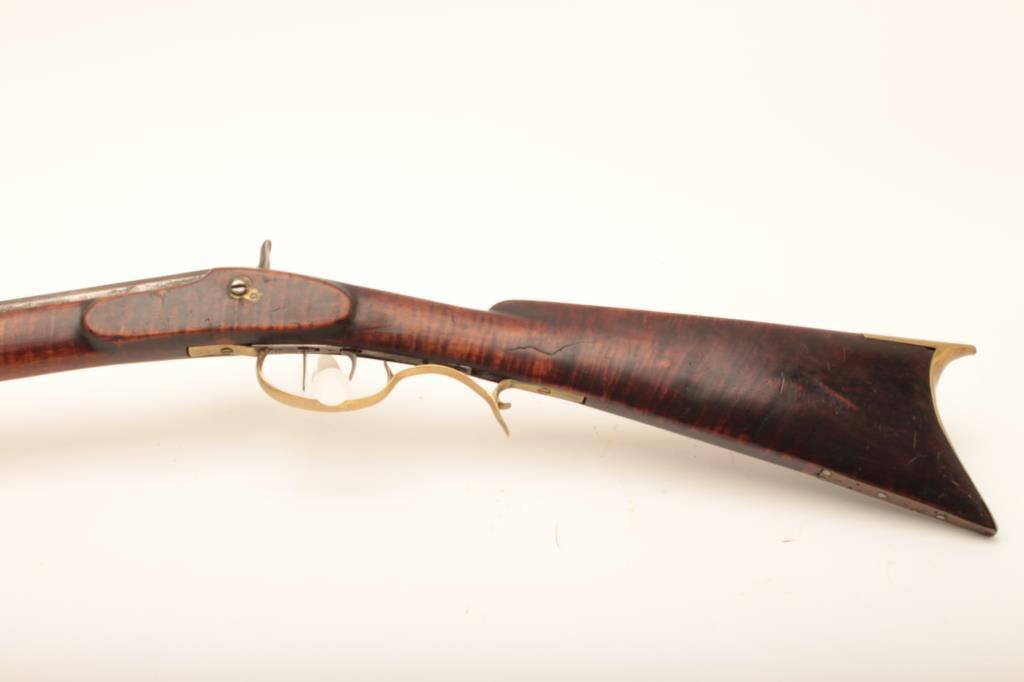 Small bore half stock percussion rifle, approx. .32 caliber, 42” octagon barrel, brown patina with moderate old pitting around breech area of rifle, double set triggers (working at time of description), brass trigger guard and butt plate, pewter forend cap, wood stock; overall fair to good condition with old repair to right side of top wrist area behind hammer and a chip on right side forend area at barrel retaining pin. (Percussion). Est.: $300-$600.