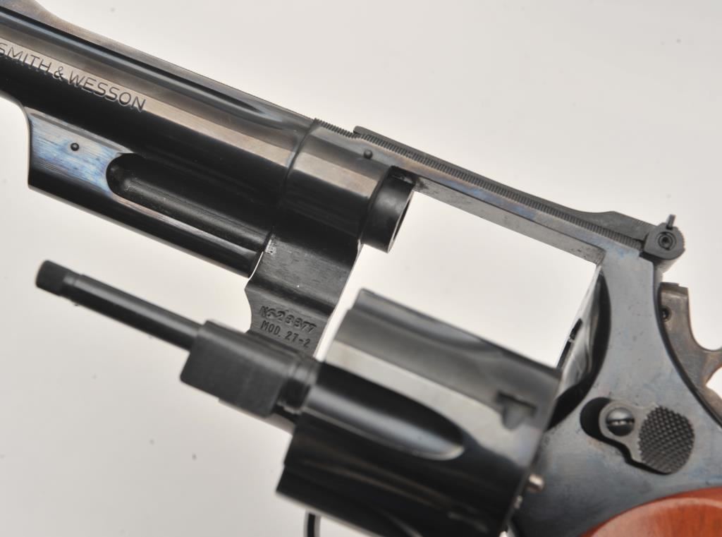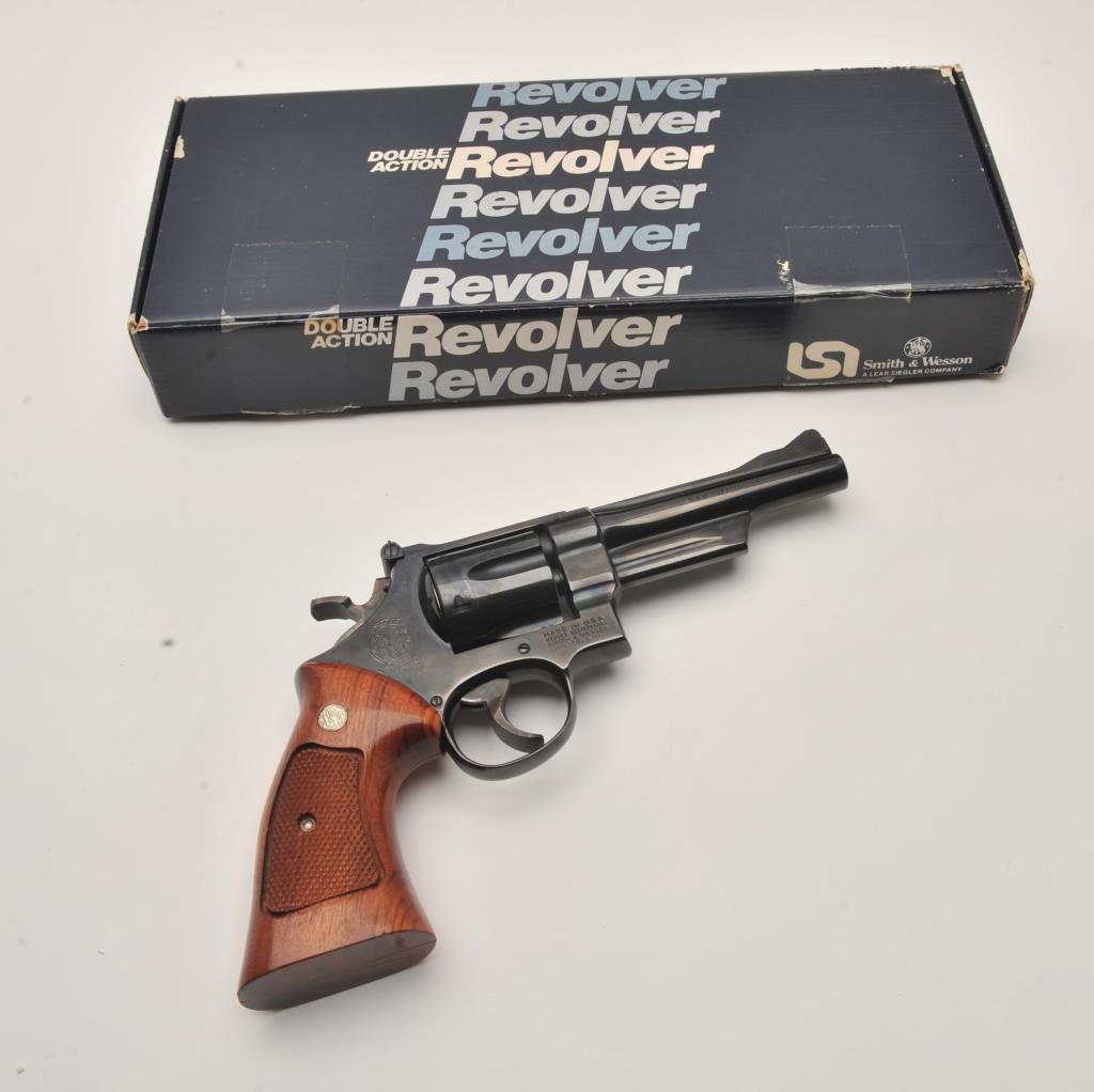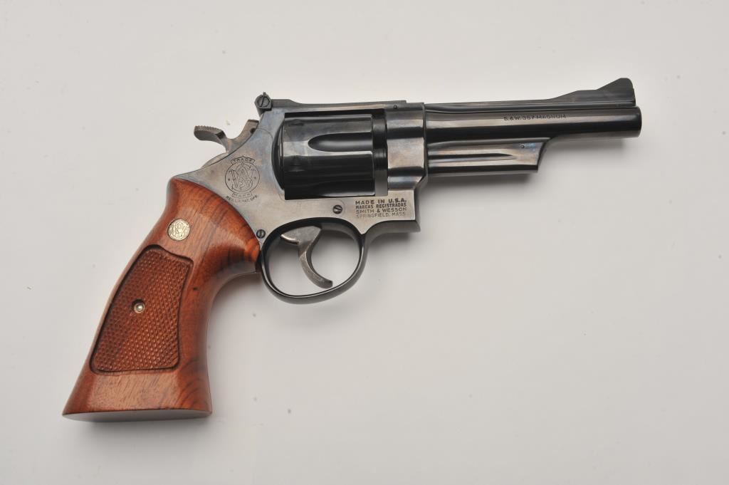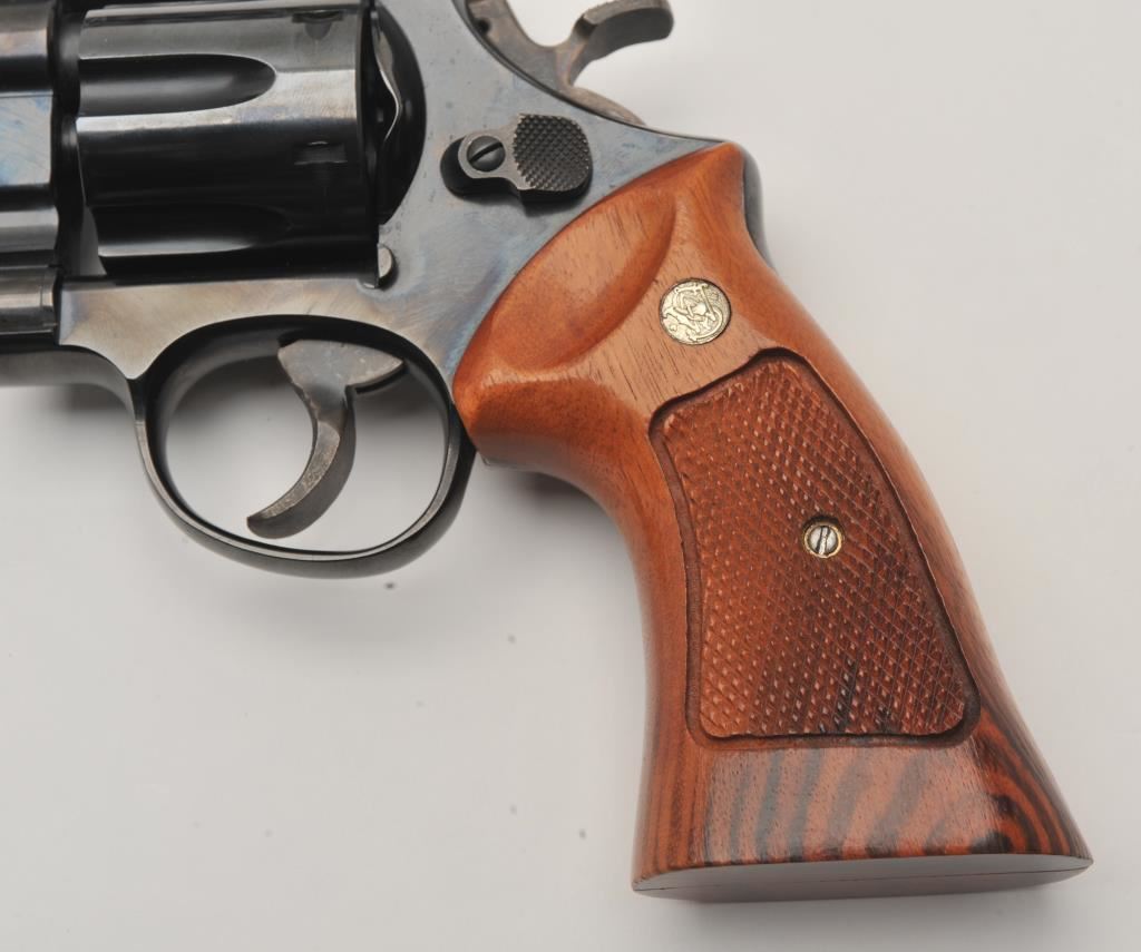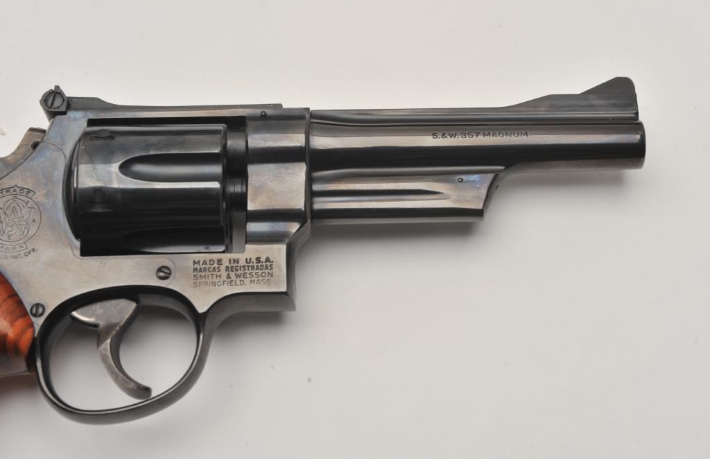 Smith & Wesson Model 27-2 revolver, .357 Magnum caliber, Serial #N628877. The pistol is in fine overall condition with a 5” barrel with a ramped blade front and adjustable rear sights. The pistol retains nearly all of its blue finish with handling marks and light drag line on the cylinder. The hammer and trigger shows vivid case hardening. The checkered wood gold medallion grips are in very good condition showing little use. The bore is good, the action is crisp and markings are sharp. The lot includes a non-matching, factory Smith & Wesson blue cardboard box. Est.: $300-$600. (C+R/PPT).
