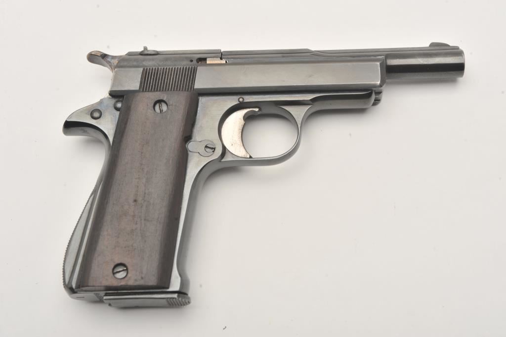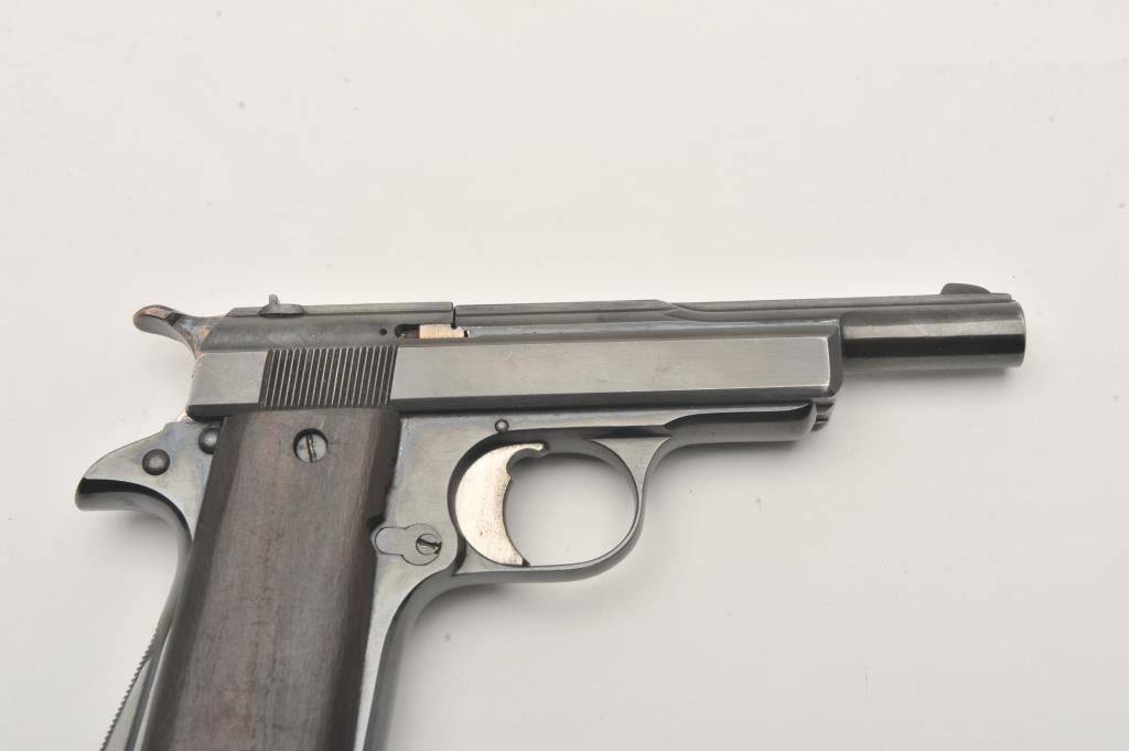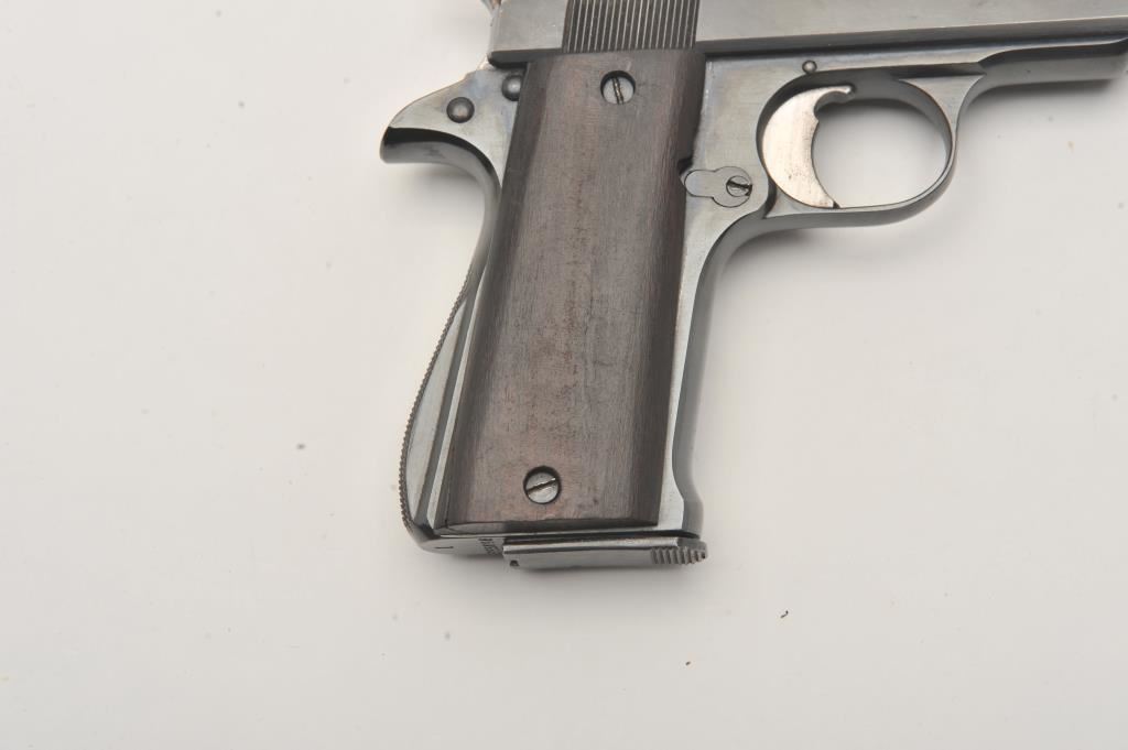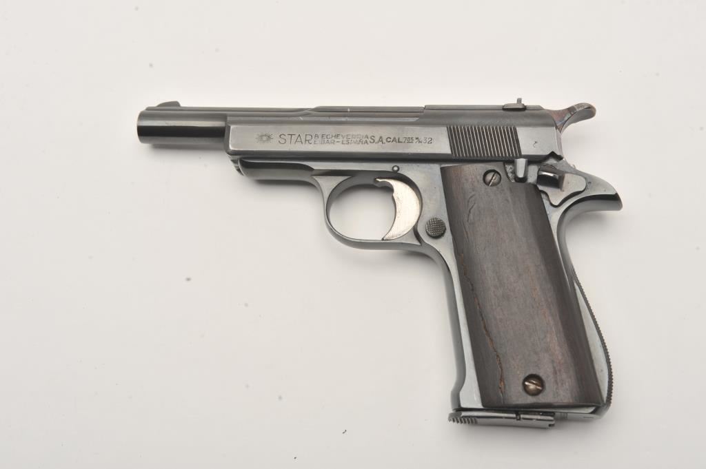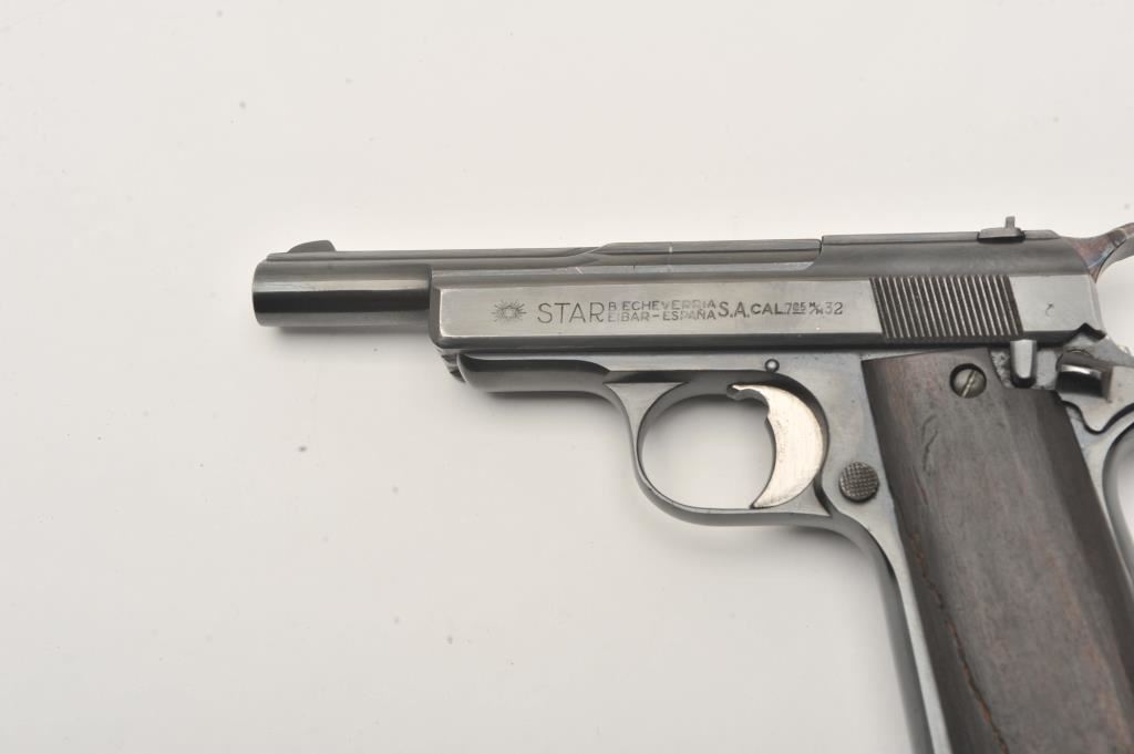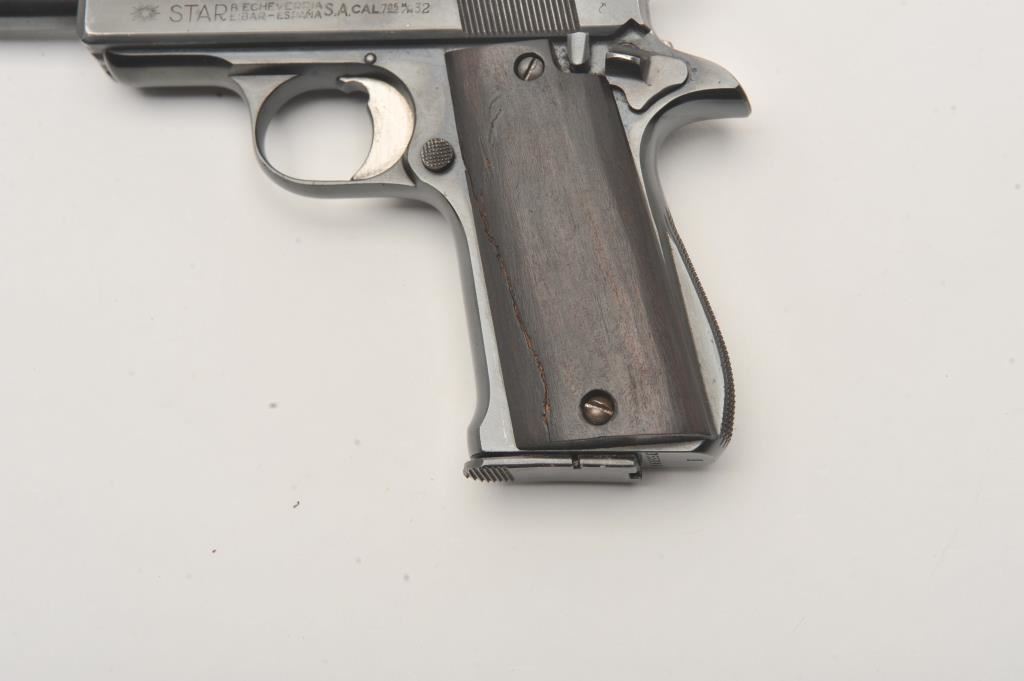 Star Model IR semi-automatic pistol, .32 caliber, Serial #355896. The pistol is in good overall condition as re-blued with a 4 ½” barrel. The pistol retains the majority of an old, quality re-blue. The smooth wood grips are in fair condition with a full-length crack on the left panel. The bore is fair, the action functions and the markings are legible. The lot includes one correct magazine. Est.: $150-$300. (Modern/PPT).
