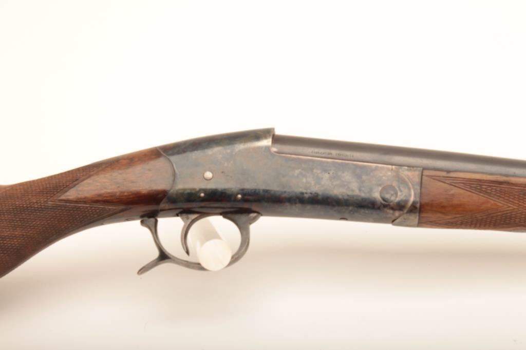 Vintage French single barrel 12GA shotgun marked “Brevete S.G.D.G Epreuve Arme Finie”, S/N 114333. Release in trigger guard, blue and case hardened finish, and light colored checkered wood stock. Barrels measure 27 ½”, choked full with 14” pull and case colored steel butt plate. Good quality with classic design and sling swivels. Circa about 1950-60s. The blue and case colors are about 90%-95% and almost fine. The wood is very good with wear and use to finish and could be refinished nicely. A quality arms with good lock up and bright. (C&R) Est.: $175-$350