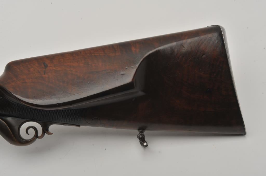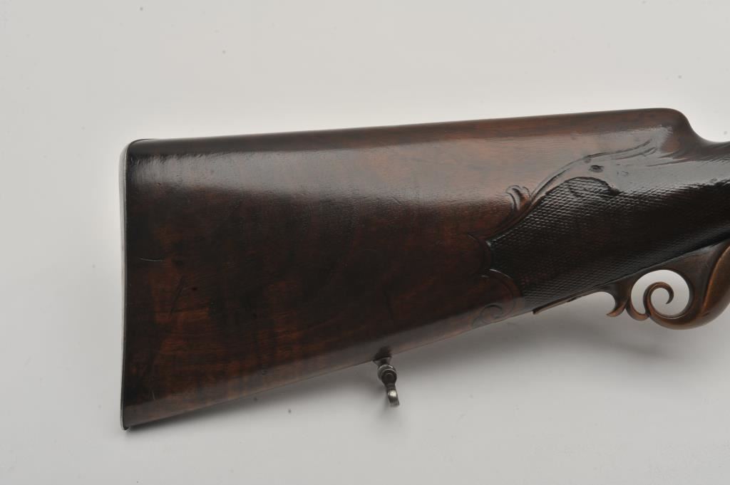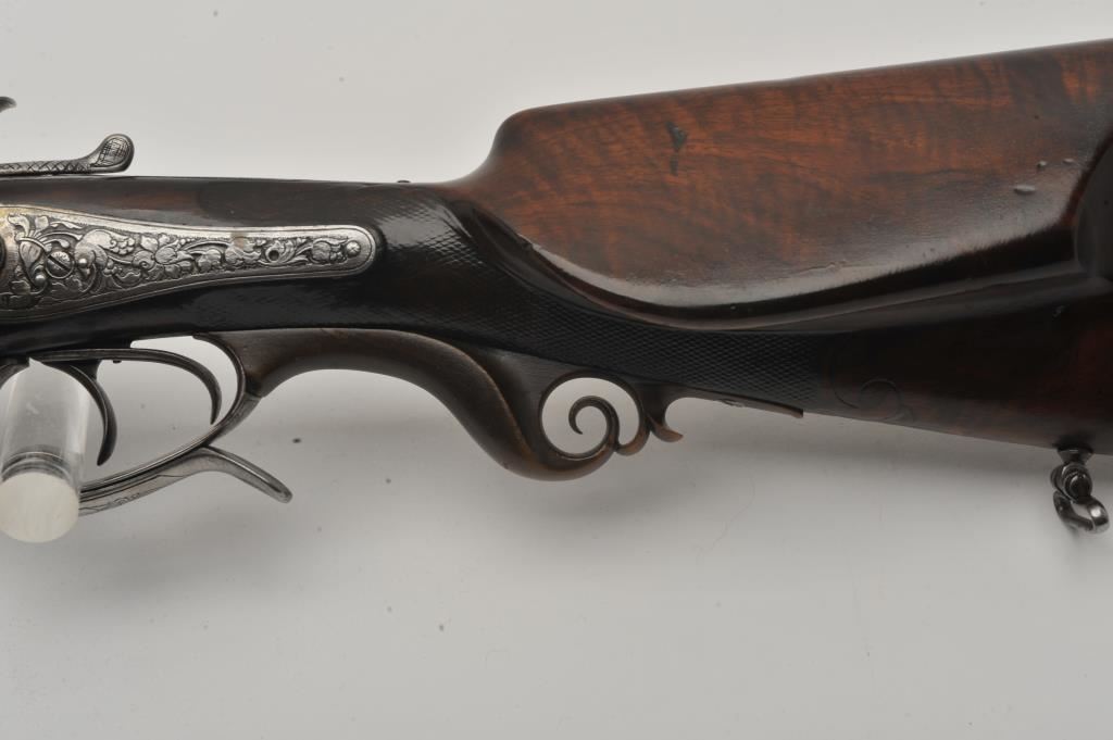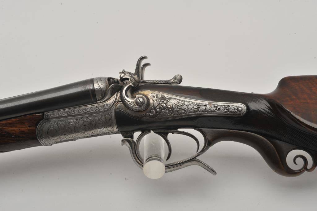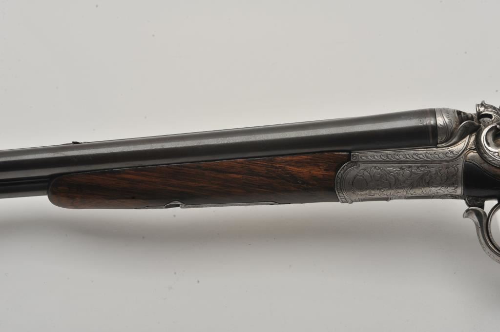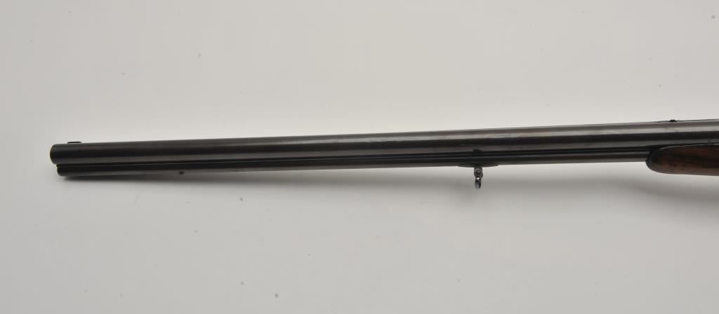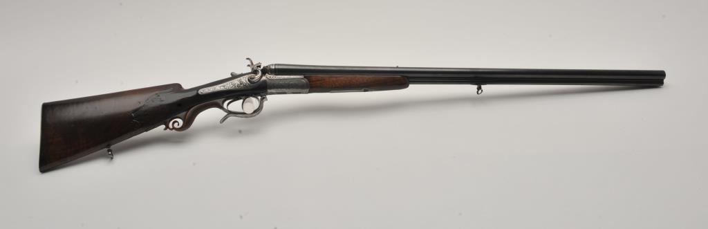 High quality Drilling rifle, 8 x 57mm Mauser rifle under SxS 16 gauge shotgun, 29.5” barrels marked “Krupp Essen” and “Fluss Stahl”; old re-blued finish to barrels, finely engraved receiver and back action lock plates, flip-up tang sight and flip-up rear sight, checkered wood butt stock (both butt stock and forend appear to have been nicely re-finished some time ago); sling swivels, crisp actions, overall good bores. (Antique). Est.: $900-$1,800.