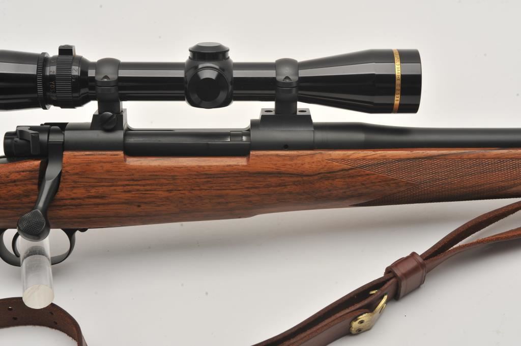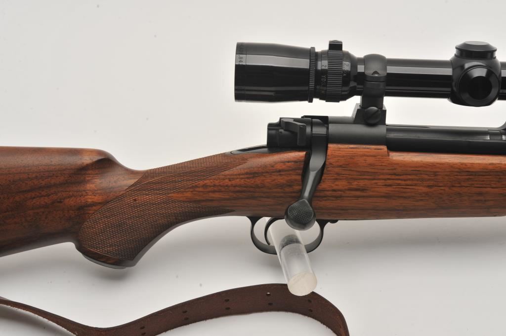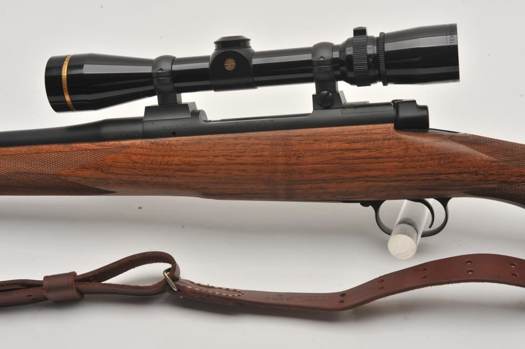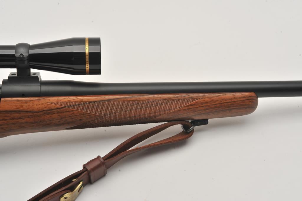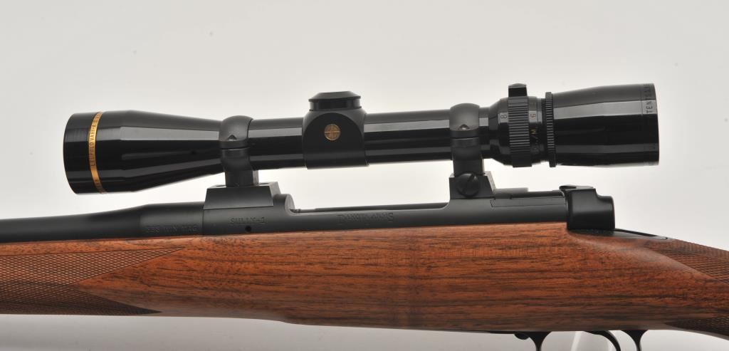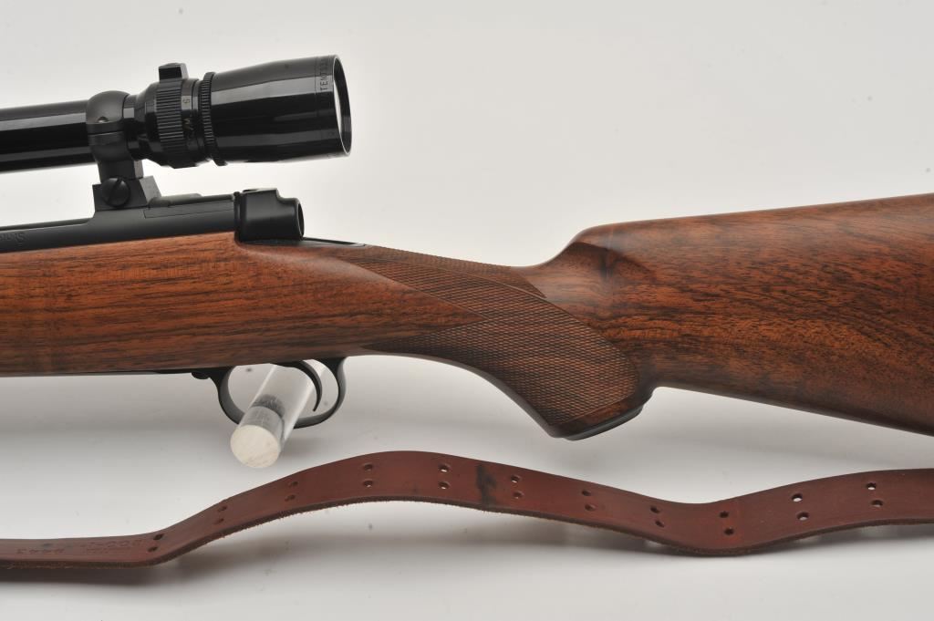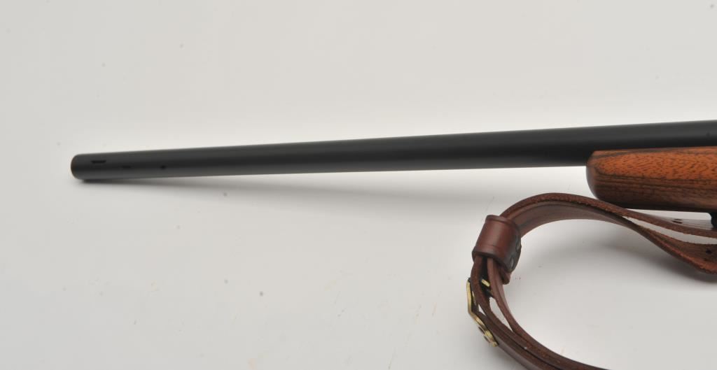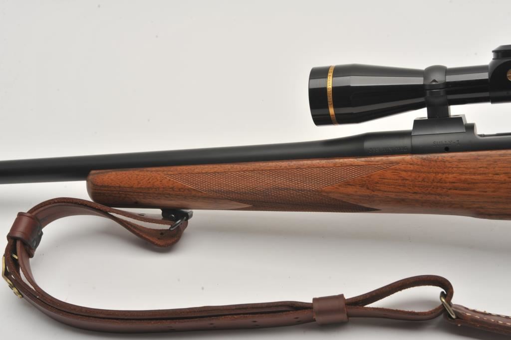 Dakota Arms Model 76 bolt action rifle, .338 Winchester Magnum caliber, Serial #SULLY-1. The rifle is in fine overall condition with a 24” ported barrel. The metal surfaces retain nearly all of their matte black finish with only light handling marks noted. The finely checkered Walnut stock features outstanding fit and finish with striking figure to the wood. The butt ends with a solid rubber pad providing a 13 ¾” LOP. The rifle is topped with a Leupold Vari X-III 2.5 x 8 variable power rifle scope with clear, crisp optics. The lot includes sling swivels and leather, military style rifle sling. The bore is good, the action crisp and markings are sharp on this outstanding Dakota sporting rifle. Est.: $1,400-$2,800. (Modern).
