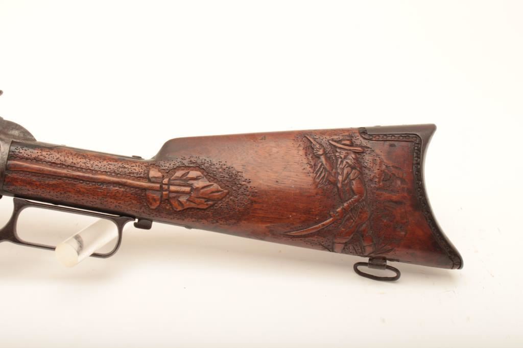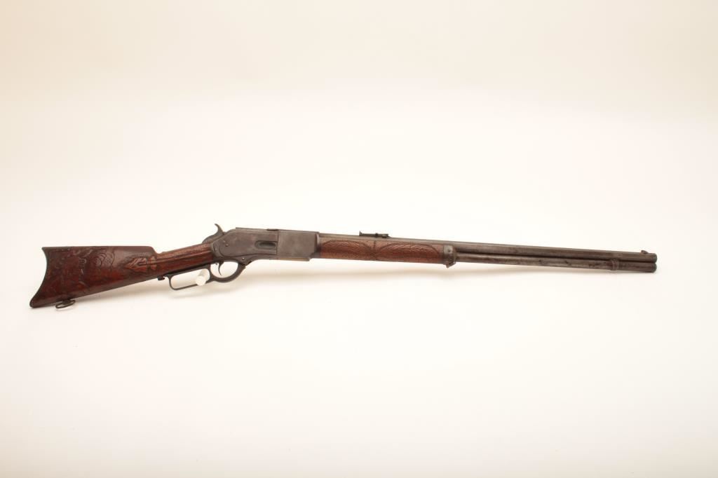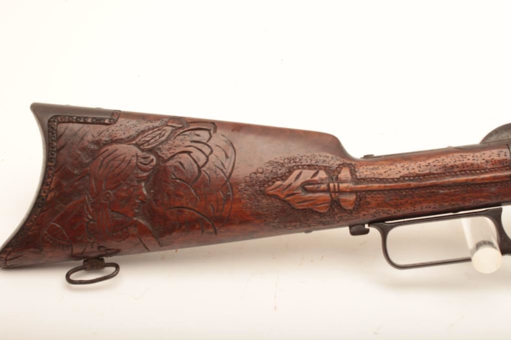 Winchester Model 1876 lever action rifle, .45-60 caliber, 28” octagon barrel, set trigger, uncleaned dark patina to metal surfaces, carved wood stocks, S/N 20065; overall good condition with a fair to good bore, crisp action, good markings and carved spread eagle and feathers on forend; carved arrow and Indian brave on right side of butt stock, carving of General Custer on left side of butt stock. (Antique). Est.: $3,000-$6,000.