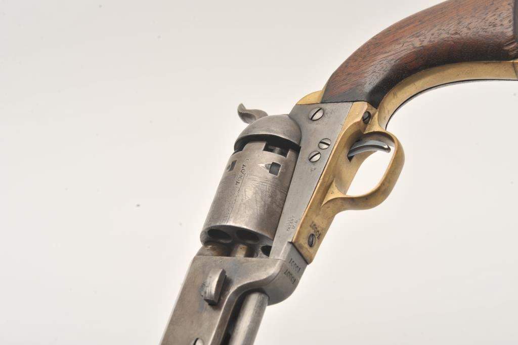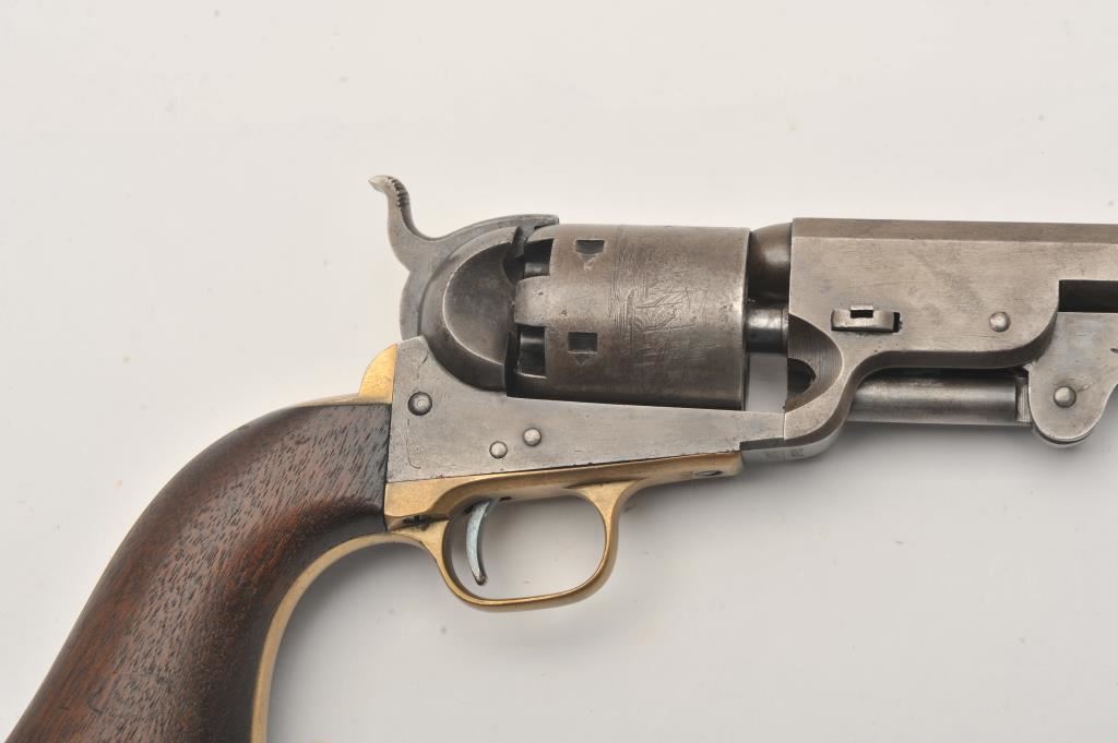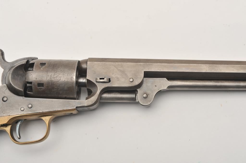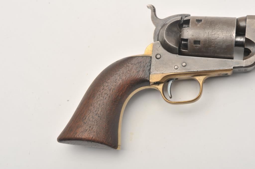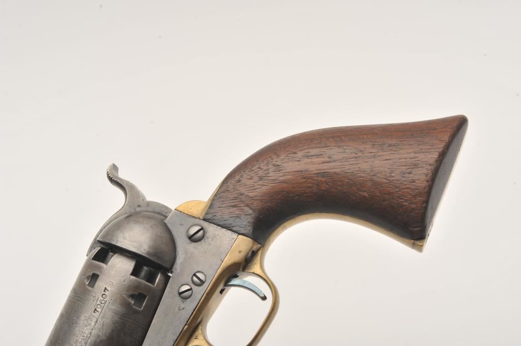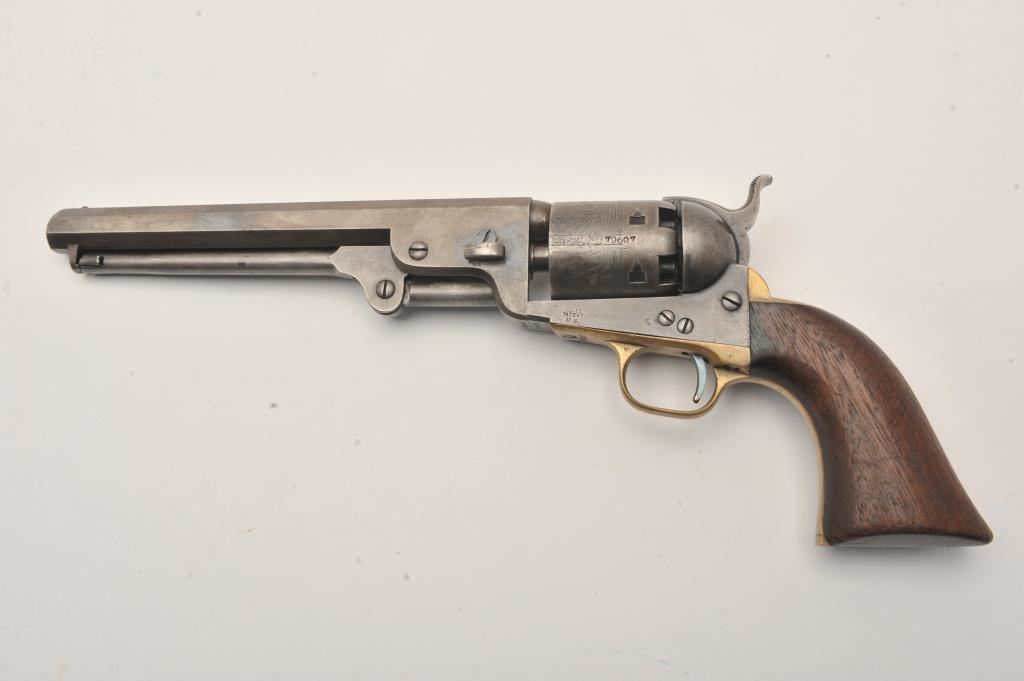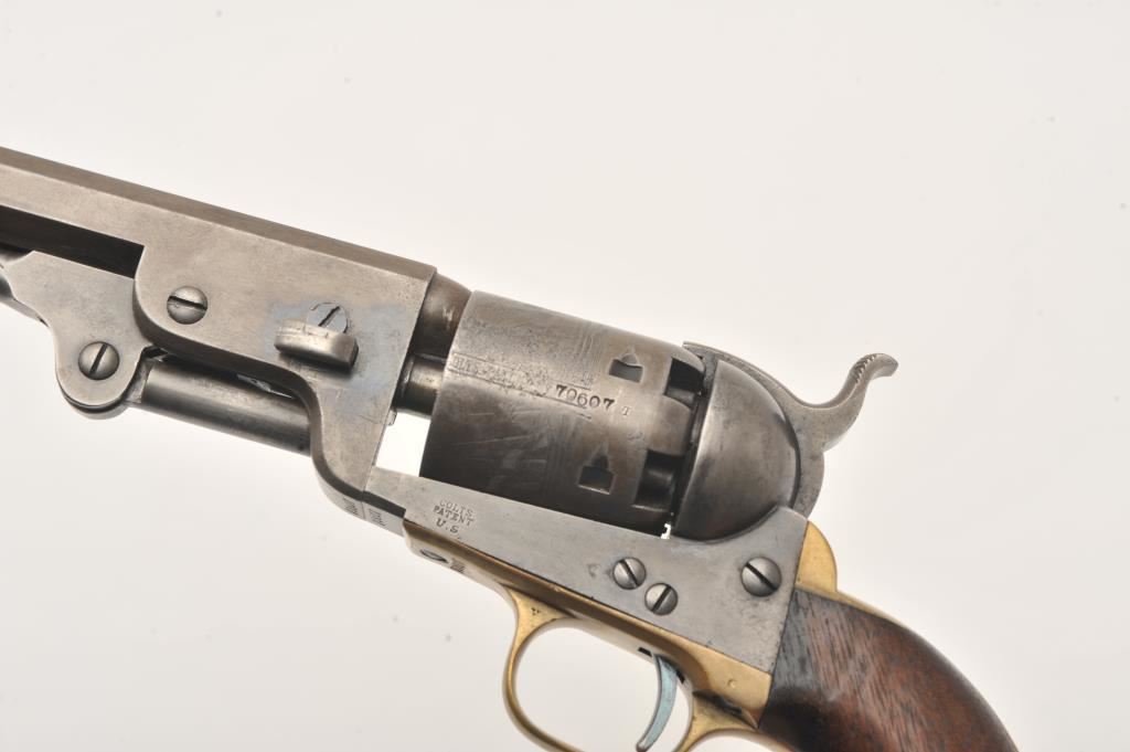 Colt Model 1851 Navy percussion revolver, U.S.-marked, .36 caliber, 7.5” octagon barrel, grey patina, wood grips, brass straps, S/N 70607; overall very good condition with majority of cylinder scene remaining, crisp action, sharp markings and very good grips displaying remnants of inspector cartouche; classic old holster wear to left upper area of muzzle, wedge screw may be a replacement. (Antique). Est.: $2,000-$4,000.