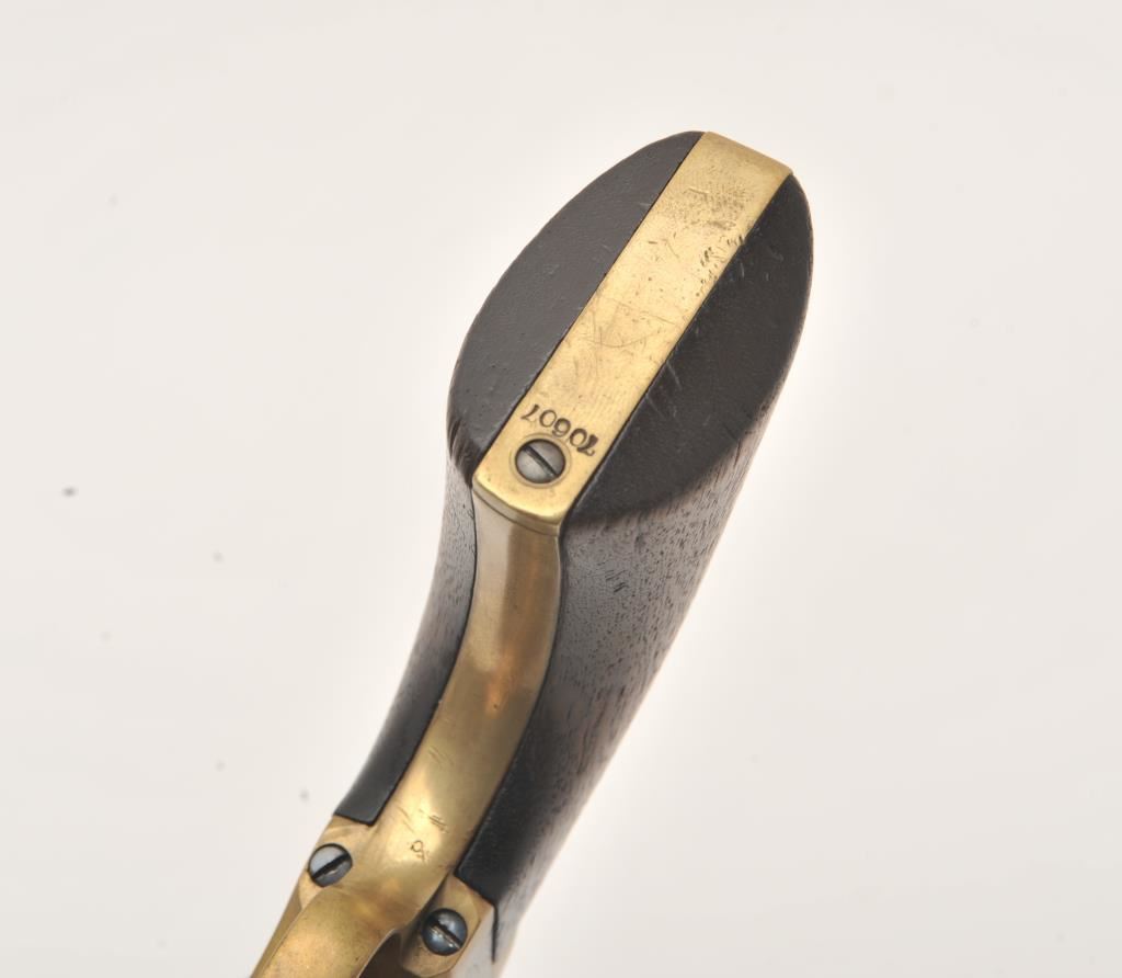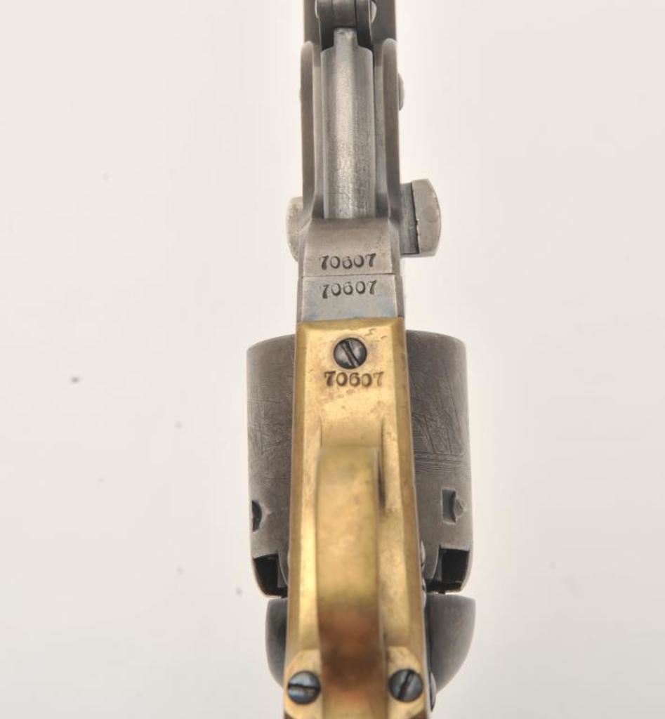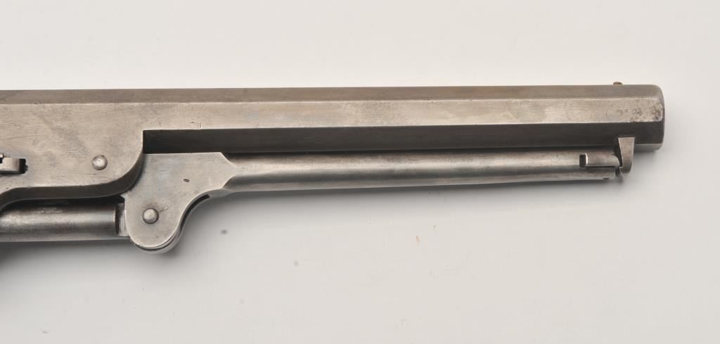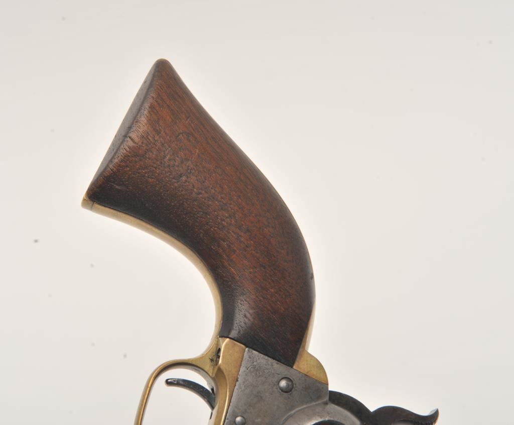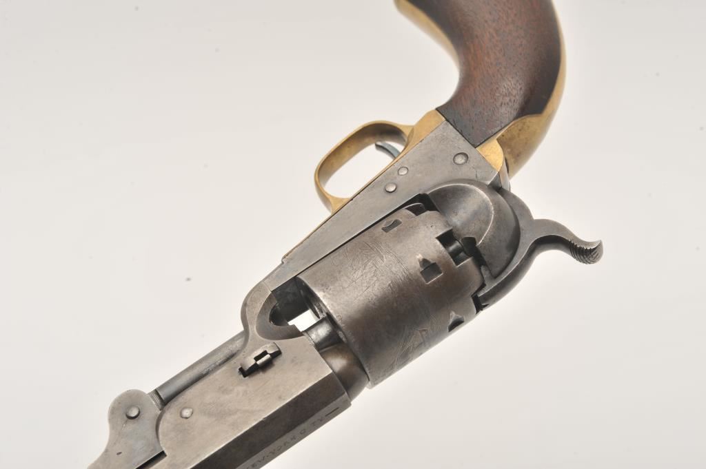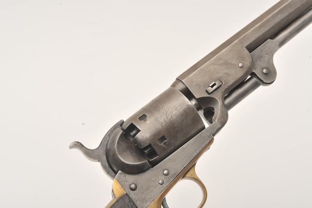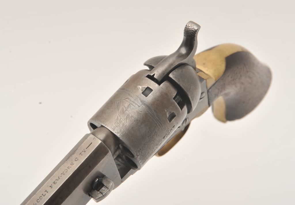 Colt Model 1851 Navy percussion revolver, U.S.-marked, .36 caliber, 7.5” octagon barrel, grey patina, wood grips, brass straps, S/N 70607; overall very good condition with majority of cylinder scene remaining, crisp action, sharp markings and very good grips displaying remnants of inspector cartouche; classic old holster wear to left upper area of muzzle, wedge screw may be a replacement. (Antique). Est.: $2,000-$4,000.