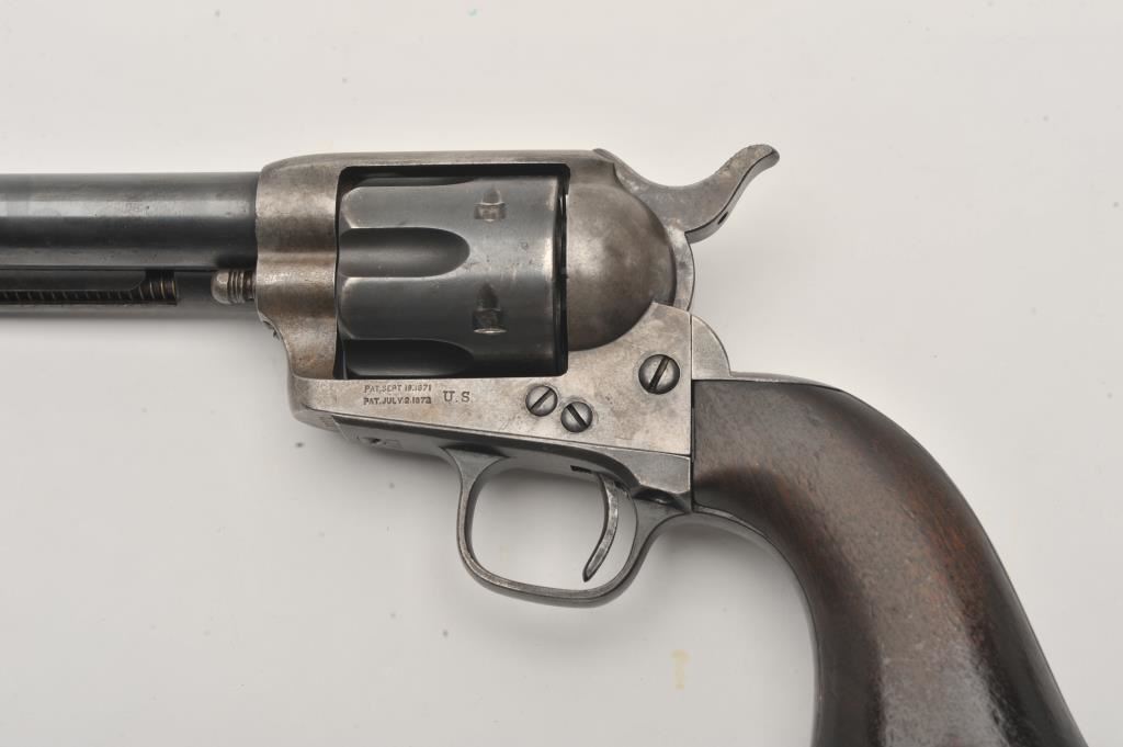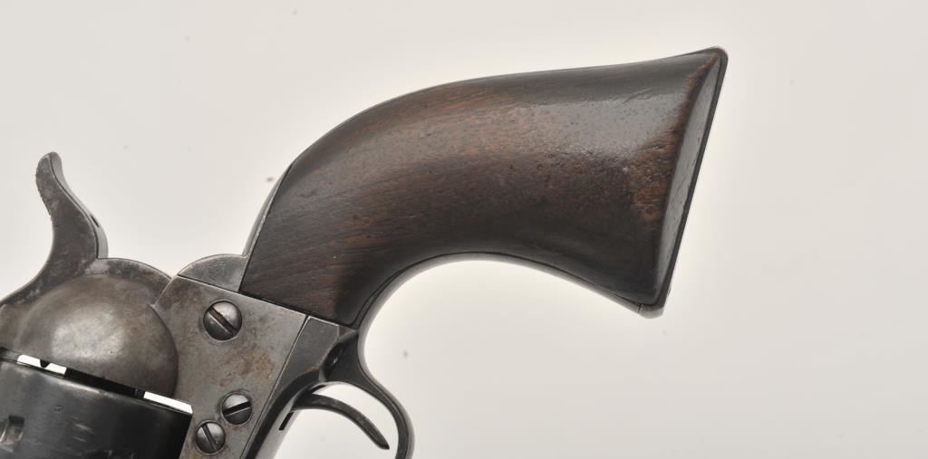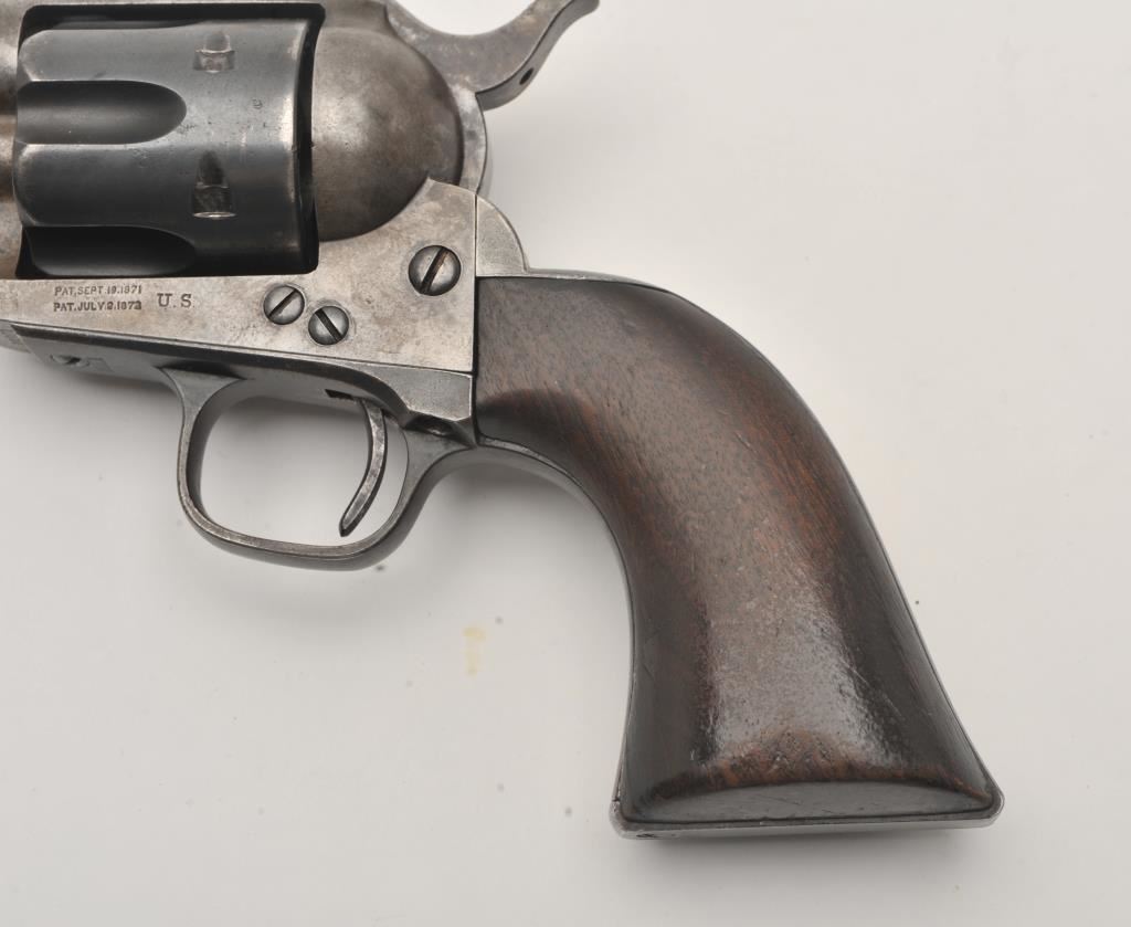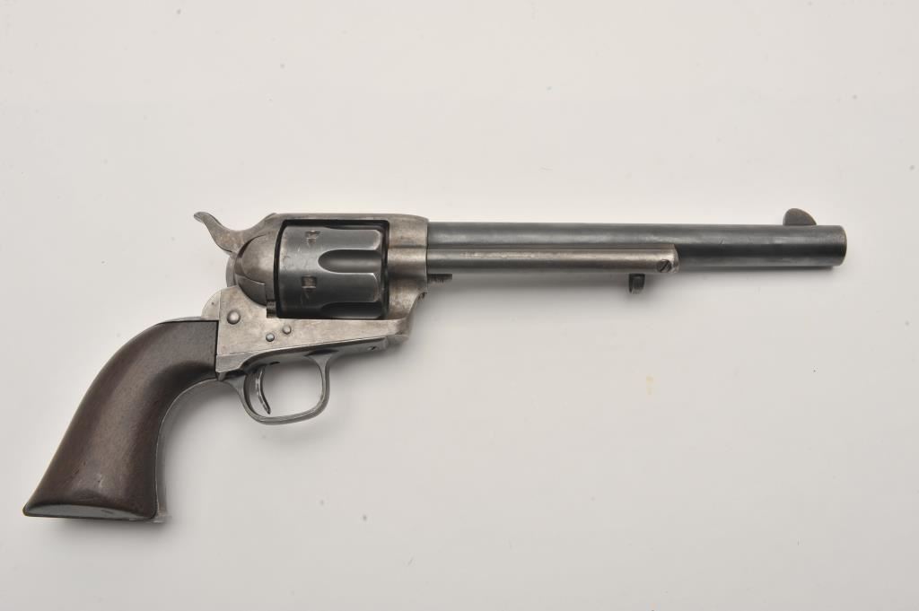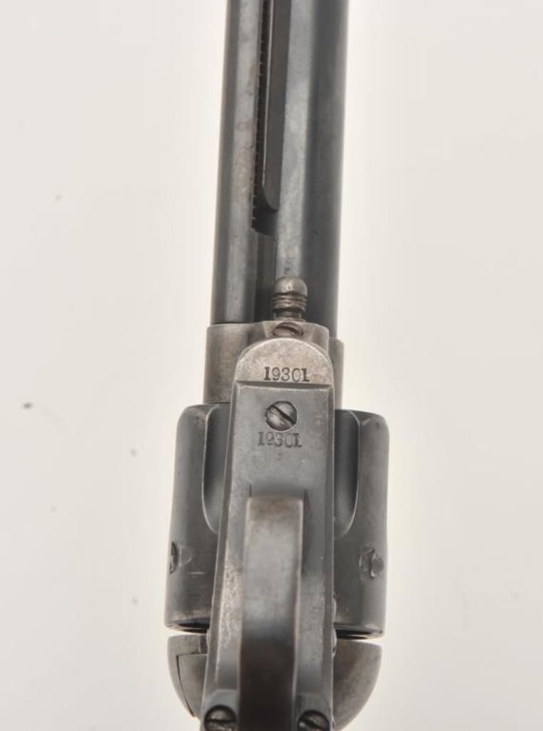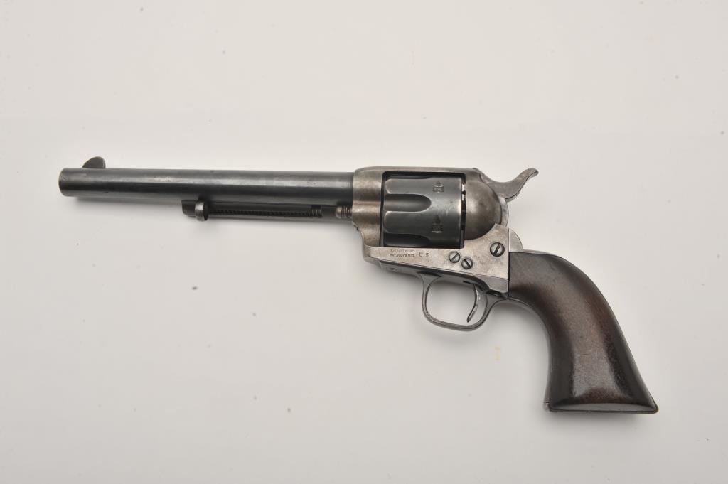 Colt U.S. Cavalry SAA revolver, .45 caliber, 7.5” barrel, blued and case hardened finish, wood grips, S/N 19301; overall very good condition with muted blued finish on barrel assembly, cylinder and straps, grey patina on frame with faint traces of case color in protected areas; very good bore, very good markings and very good grips. (Antique). Est.: $4,000-$8,000.