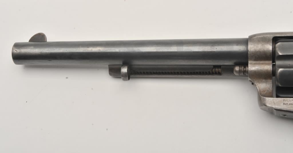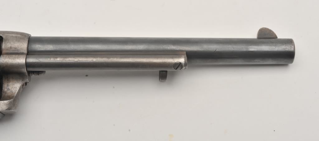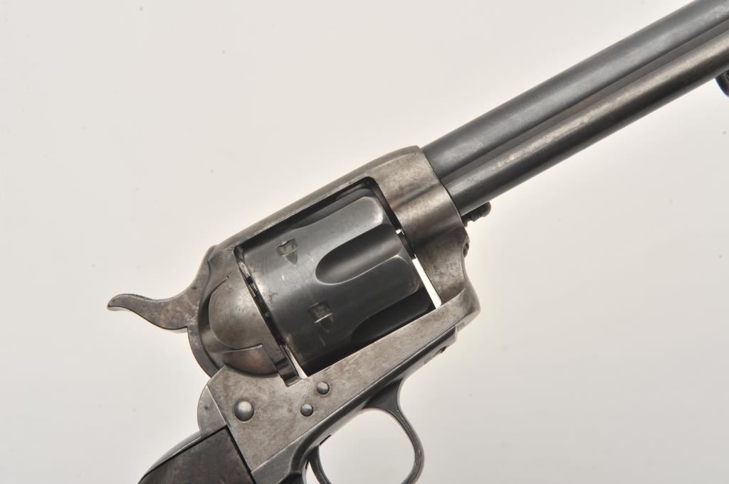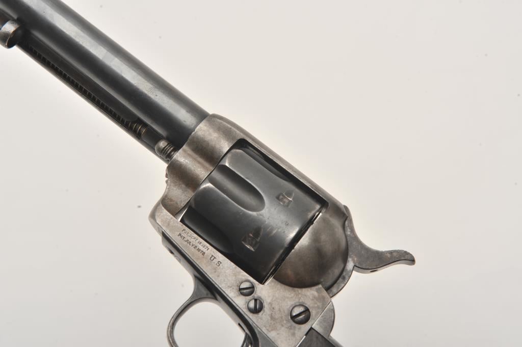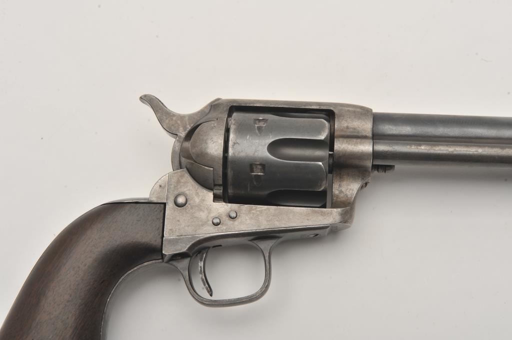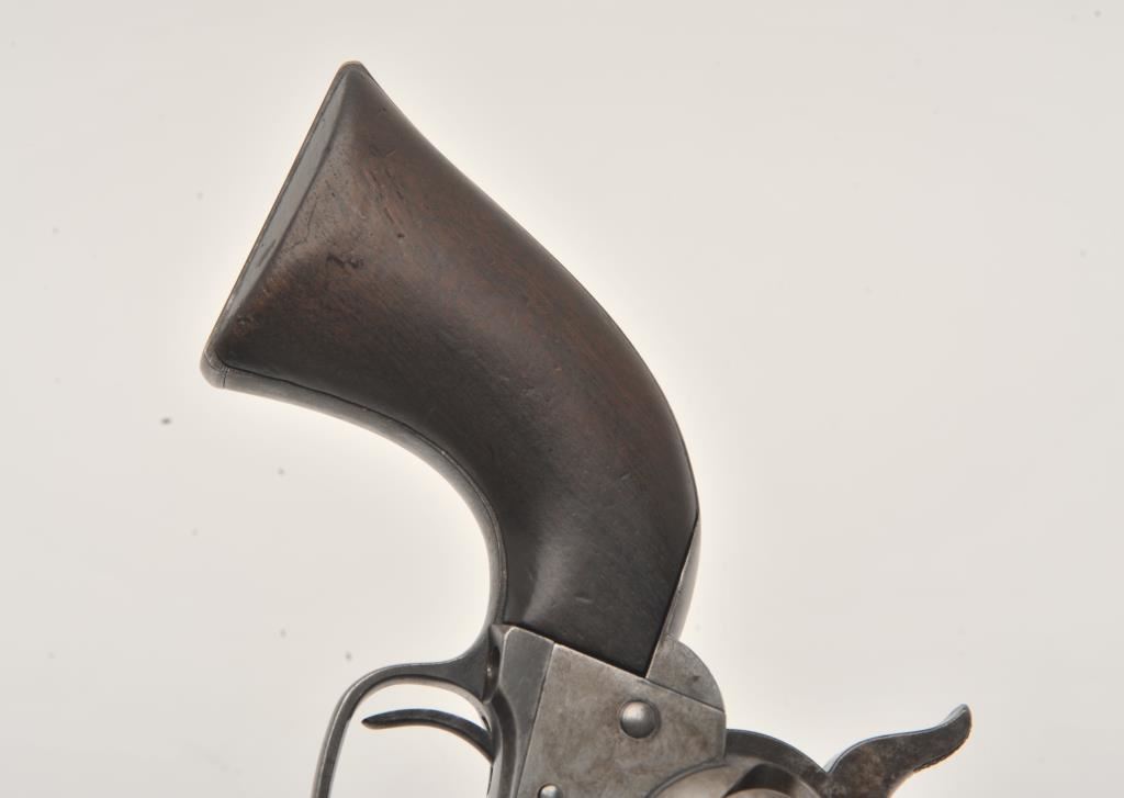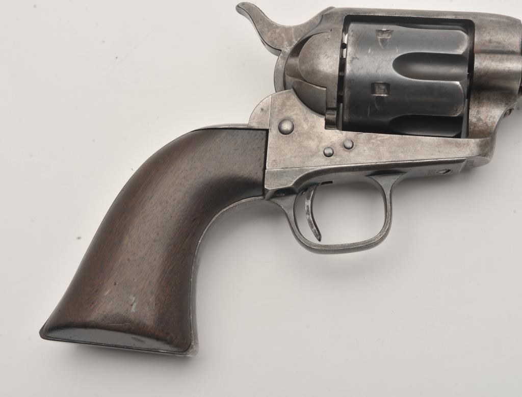Colt U.S. Cavalry SAA revolver, .45 caliber, 7.5” barrel, blued and case hardened finish, wood grips, S/N 19301; overall very good condition with muted blued finish on barrel assembly, cylinder and straps, grey patina on frame with faint traces of case color in protected areas; very good bore, very good markings and very good grips. (Antique). Est.: $4,000-$8,000.