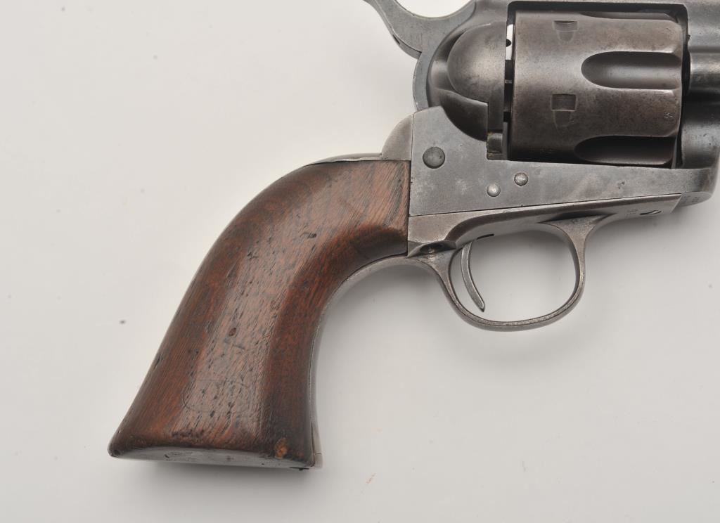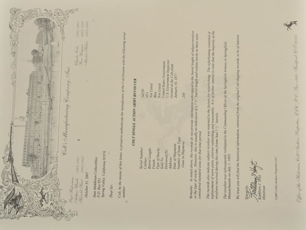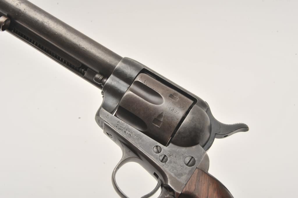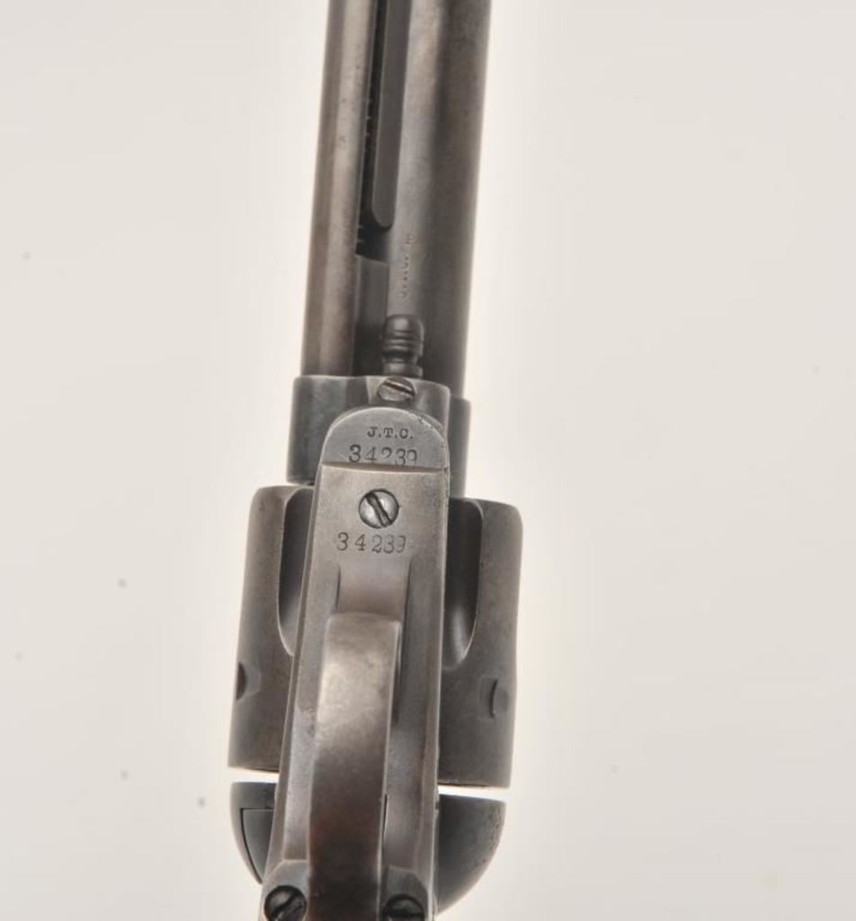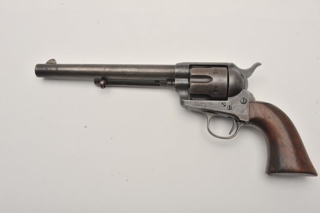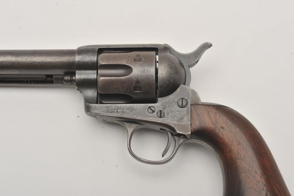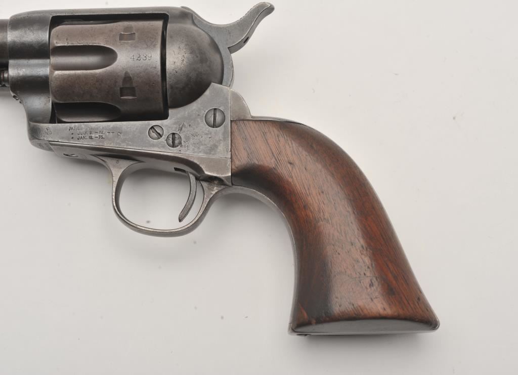 Colt U.S. Cavalry SAA revolver, .45 caliber, 7.5” barrel, dark patina to metal surfaces, wood grips, S/N 34239 (with J.T.C. inspection stamps); overall very good condition with a good bore, crisp action, very good markings and grips showing remnants of both inspectors’ cartouches on grips; accompanied by a Colt factory letter indicating .45 caliber, blue finish, barrel length and type of stocks “Not Listed”, sold to U.S. Government, delivered to the U.S. Government Inspector at the Colt plant on January 10, 1877 in a shipment of 200 guns. Also with this Colt is a Kopec letter presenting interesting information including his comment that “historically, we could not locate this revolver’s serial number in the National Archives records available to us. We do however note that the revolver #34262 (a closely related example) had belonged to ‘Troop C, 5th Cavalry’ as of August 17, 1886”. Also he notes “. . . assuming that this revolver had also been originally issued to the 5th Cavalry, we have checked some of the battle entries for this unit which
