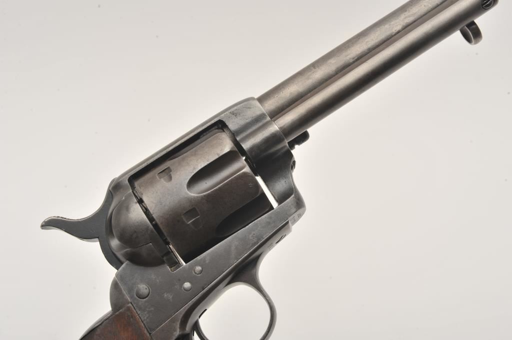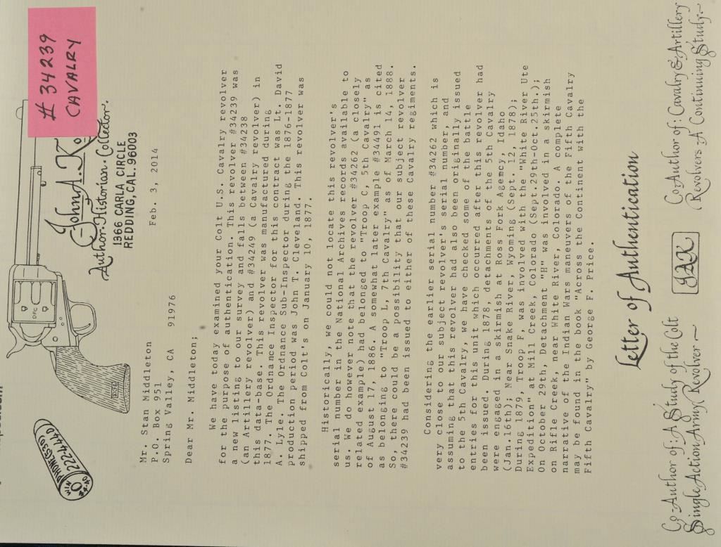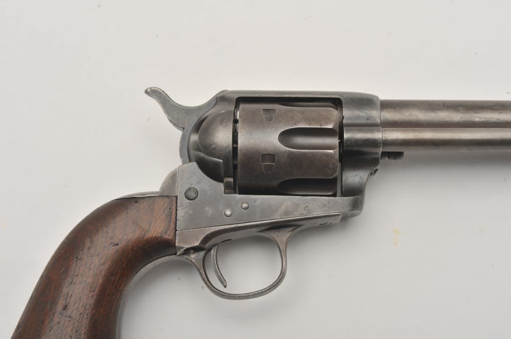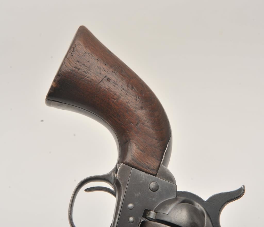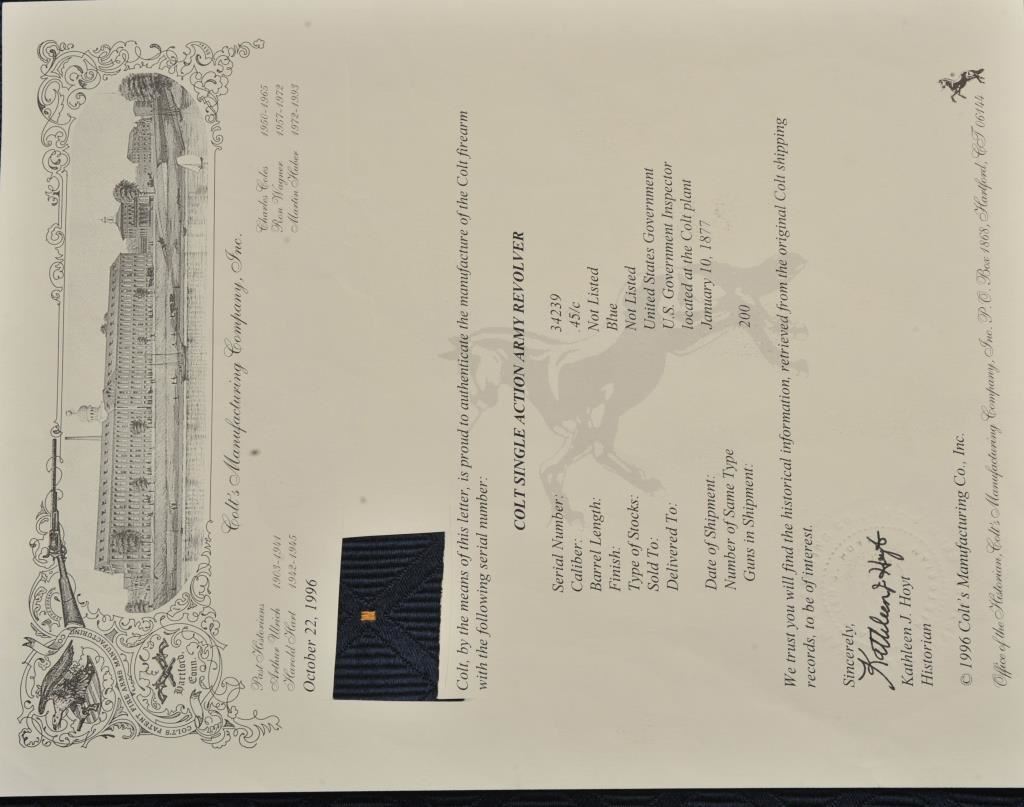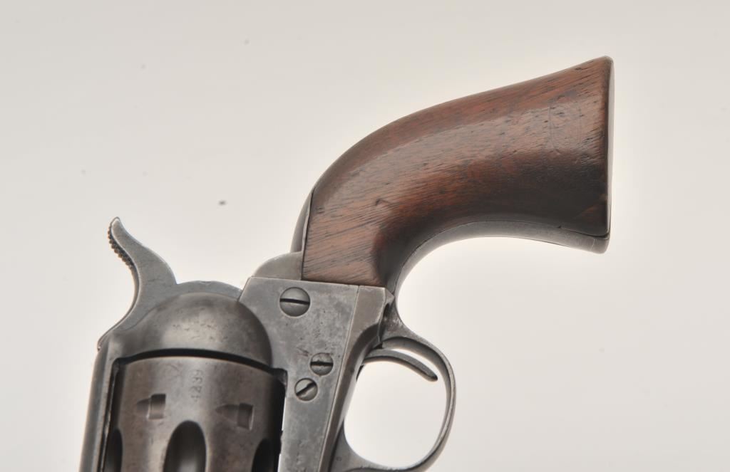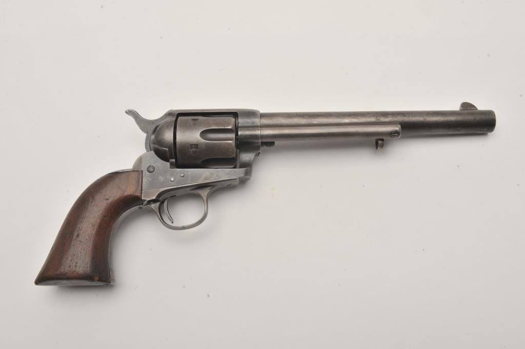 Colt U.S. Cavalry SAA revolver, .45 caliber, 7.5” barrel, dark patina to metal surfaces, wood grips, S/N 34239 (with J.T.C. inspection stamps); overall very good condition with a good bore, crisp action, very good markings and grips showing remnants of both inspectors’ cartouches on grips; accompanied by a Colt factory letter indicating .45 caliber, blue finish, barrel length and type of stocks “Not Listed”, sold to U.S. Government, delivered to the U.S. Government Inspector at the Colt plant on January 10, 1877 in a shipment of 200 guns. Also with this Colt is a Kopec letter presenting interesting information including his comment that “historically, we could not locate this revolver’s serial number in the National Archives records available to us. We do however note that the revolver #34262 (a closely related example) had belonged to ‘Troop C, 5th Cavalry’ as of August 17, 1886”. Also he notes “. . . assuming that this revolver had also been originally issued to the 5th Cavalry, we have checked some of the battle entries for this unit which