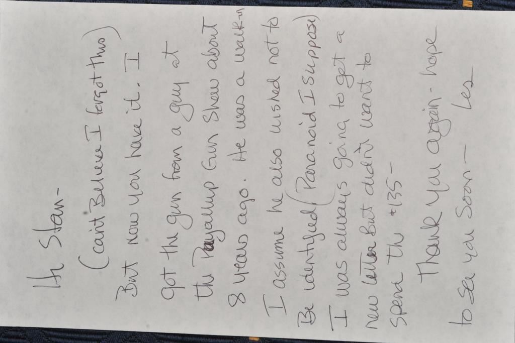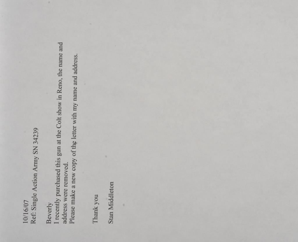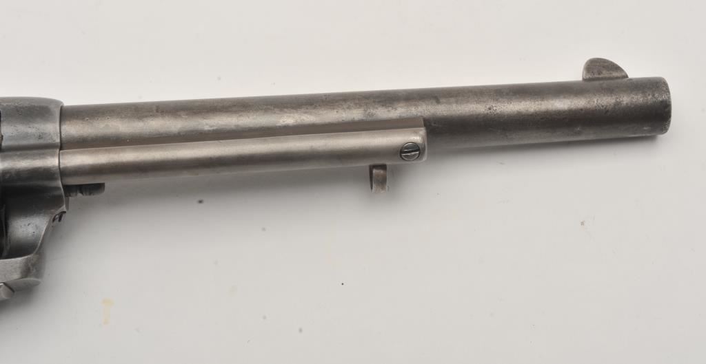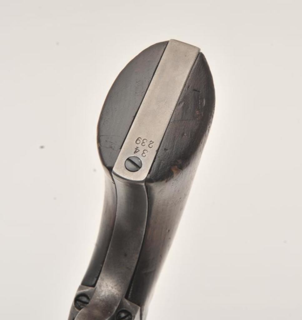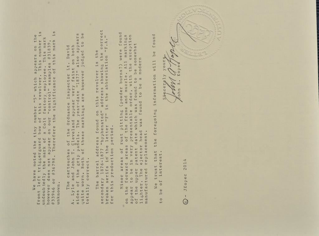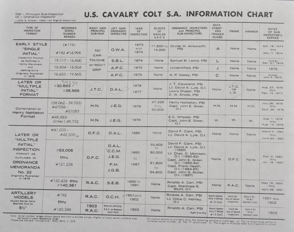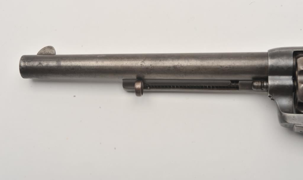 Colt U.S. Cavalry SAA revolver, .45 caliber, 7.5” barrel, dark patina to metal surfaces, wood grips, S/N 34239 (with J.T.C. inspection stamps); overall very good condition with a good bore, crisp action, very good markings and grips showing remnants of both inspectors’ cartouches on grips; accompanied by a Colt factory letter indicating .45 caliber, blue finish, barrel length and type of stocks “Not Listed”, sold to U.S. Government, delivered to the U.S. Government Inspector at the Colt plant on January 10, 1877 in a shipment of 200 guns. Also with this Colt is a Kopec letter presenting interesting information including his comment that “historically, we could not locate this revolver’s serial number in the National Archives records available to us. We do however note that the revolver #34262 (a closely related example) had belonged to ‘Troop C, 5th Cavalry’ as of August 17, 1886”. Also he notes “. . . assuming that this revolver had also been originally issued to the 5th Cavalry, we have checked some of the battle entries for this unit which