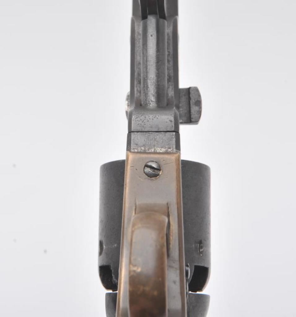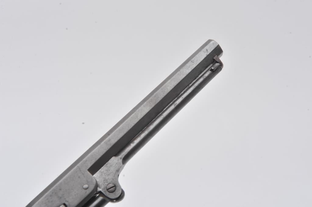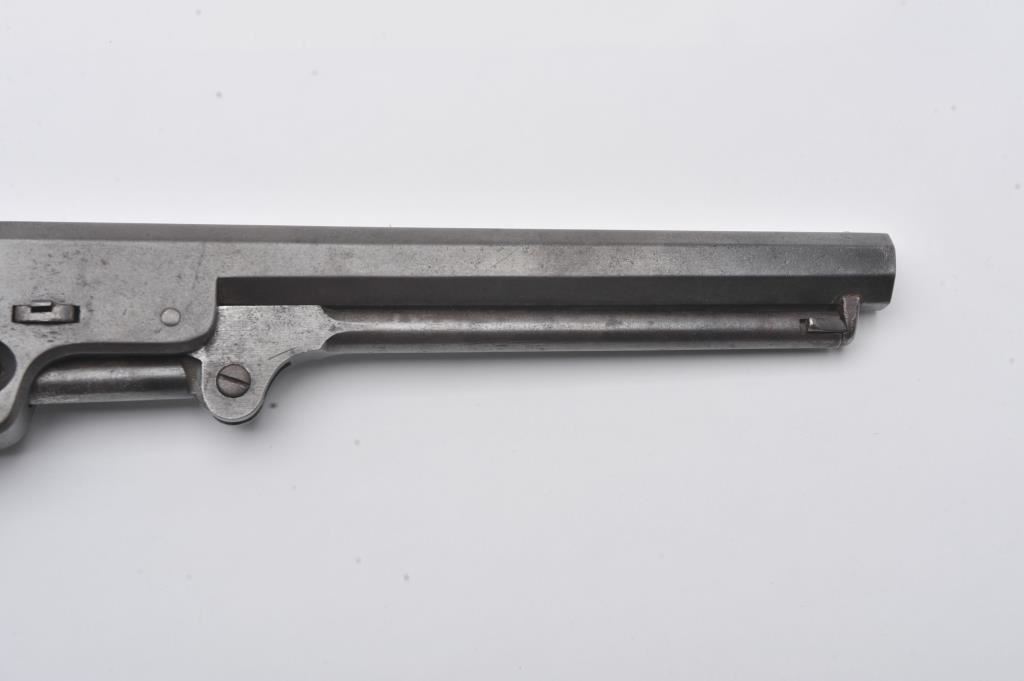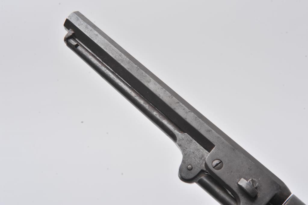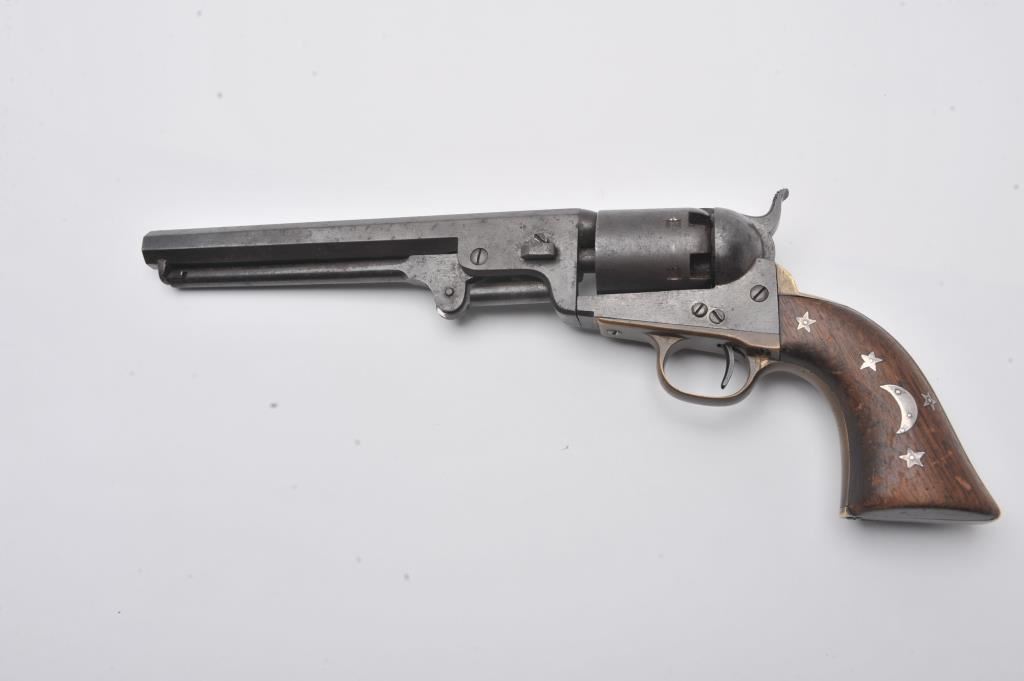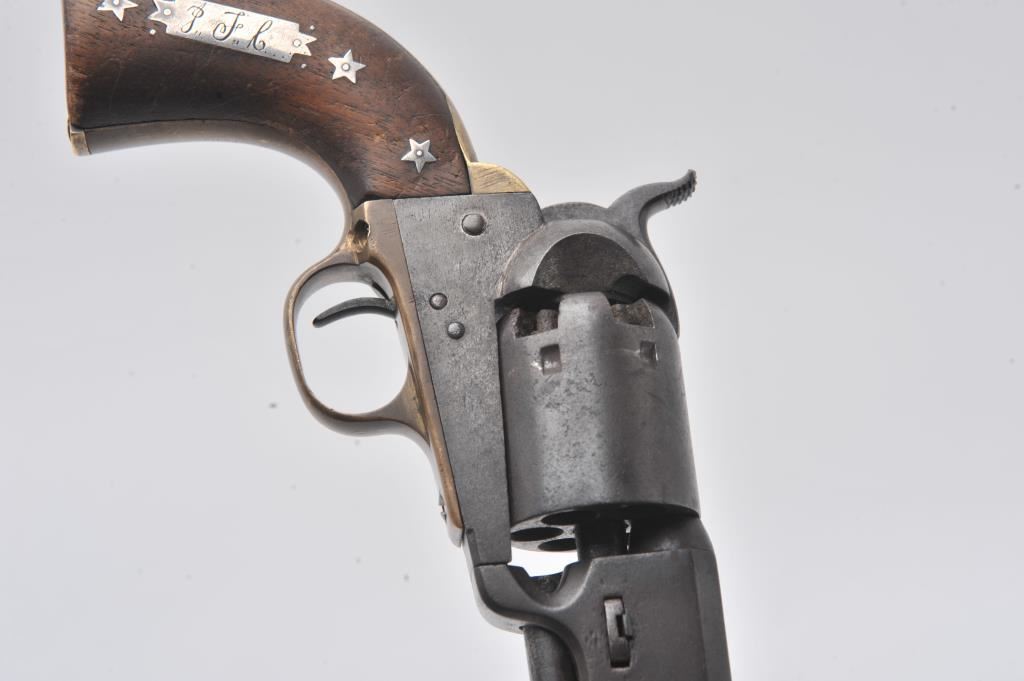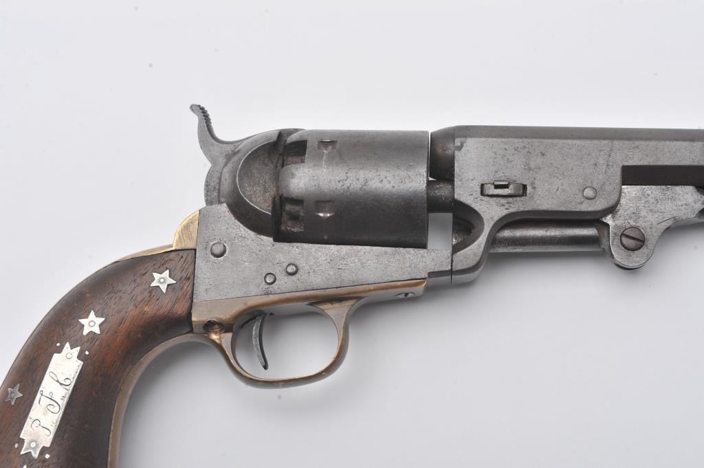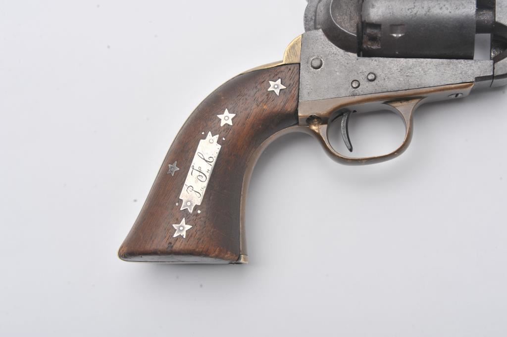 Rare and original confederate percussion revolver known as the Augusta Machine Works Colt 1851 style in .36 caliber, S/N 37 with period silver star and moon inlays and plaque engraved in script initials “J.F.C.”. Among the rarest of all confederate Civil War revolver with estimates of 100 being produced and about 20 known to collectors. Serial number 24 is inscribed “H. Canning” and carried aboard C.S.S. Shenandoah is the best known example along with another showing only cryptic “J” marking which has provenance to 1947 and pictured extensively in Bill Gary’s book on confederate revolver pages 46-48. Recently discovered in Northern California and possibly carried west after the Civil War. This subject revolver remains in very good original condition with smooth brown patina finish, minor light pitting and erosion. The straps have a taffy patina that is uncleaned and have right color found on C.S. brass. The grips are very good plus with minor nicks and scratches. The silver inlays are period with silver pins. The action is good and generally good overall. All major