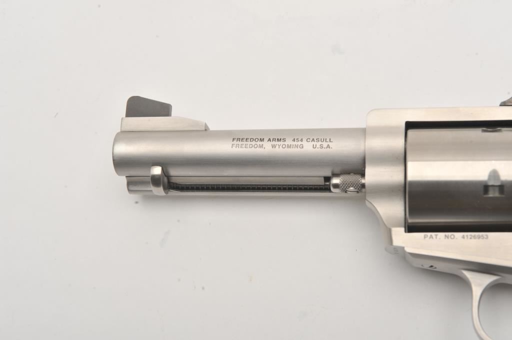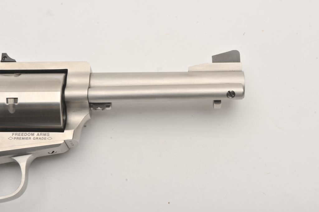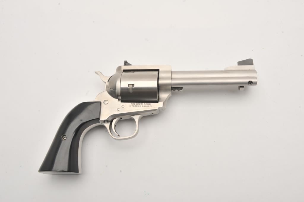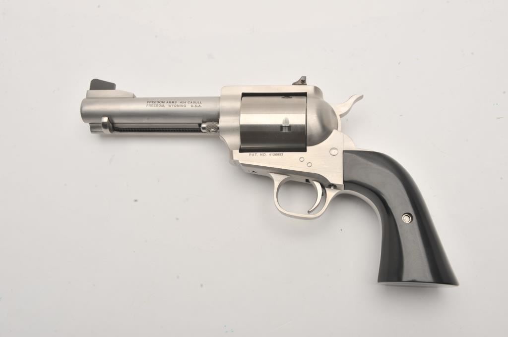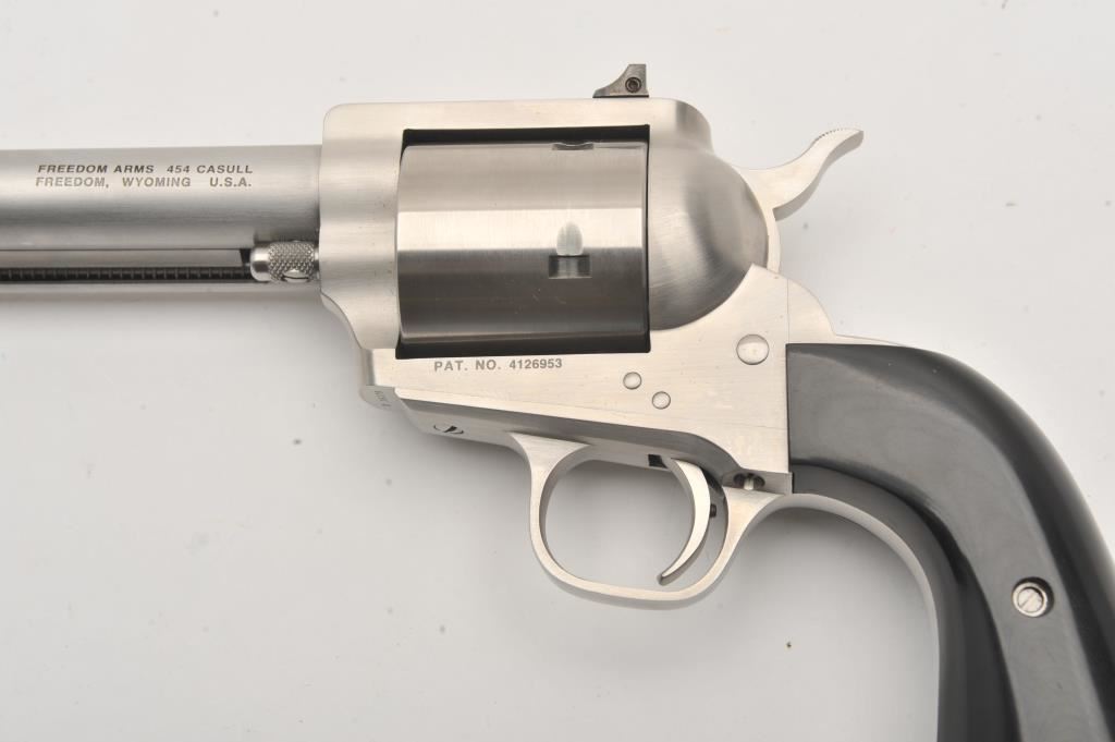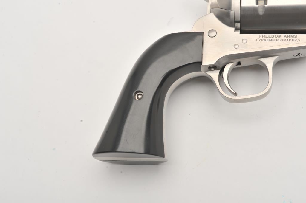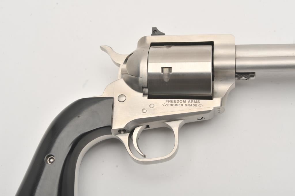 Freedom Arms 83 Premier Grade, #D16179, .454 Casull, 4 3/4" round barrel with recessed crown, stainless, black Micarta grips. Revolver is in fine condition overall, with excellent action, fine bore and grips, finish shows just minimal use and handling marks. Freedom Arms are exceptional quality revolvers, and among the best fit and finish available today. Est. $1750-3500