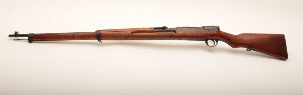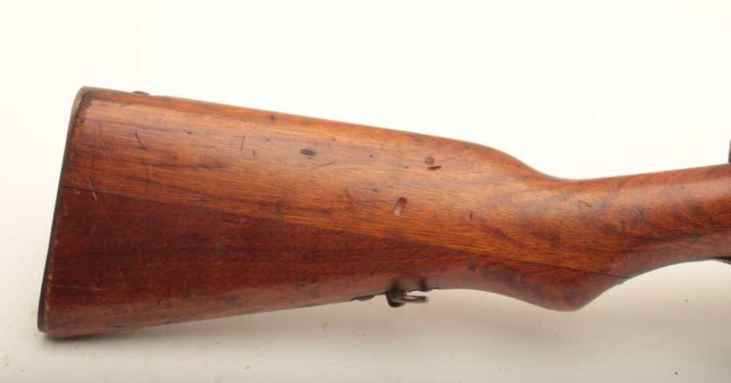 Arisaka Type 38 rifle, #52462, 6.5 Jap cal., 31 1/2" barrel with mum intact, blued finish, wood stock. Rifle is in good condition overal, retaining the majority of it's original blue finish. Stock is very good showing normal military use, but with no crack in the seam at the butt. Matching bolt. Bore is good, action is good. (C&R) Est. $200-400