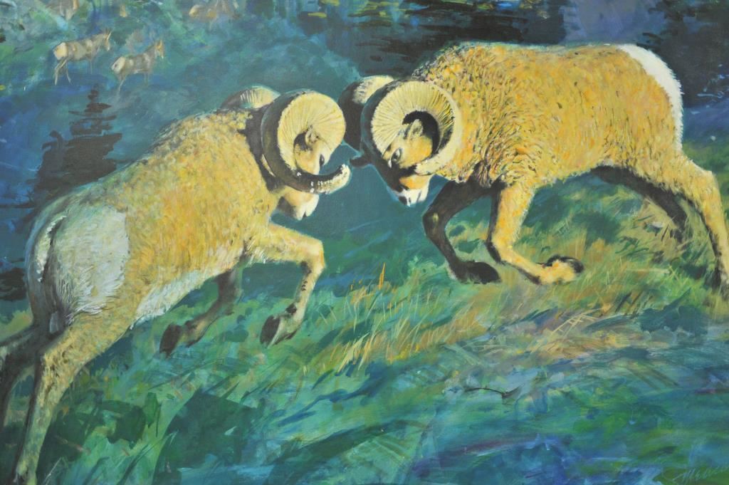 Large framed oil on board of Big Horn Sheep by William Medcalf (early 20th Century); approximately 38” x 47” overall and beautifully accomplished Est.: $1,500-$3,000.