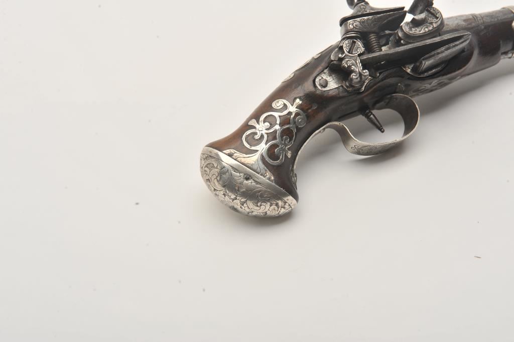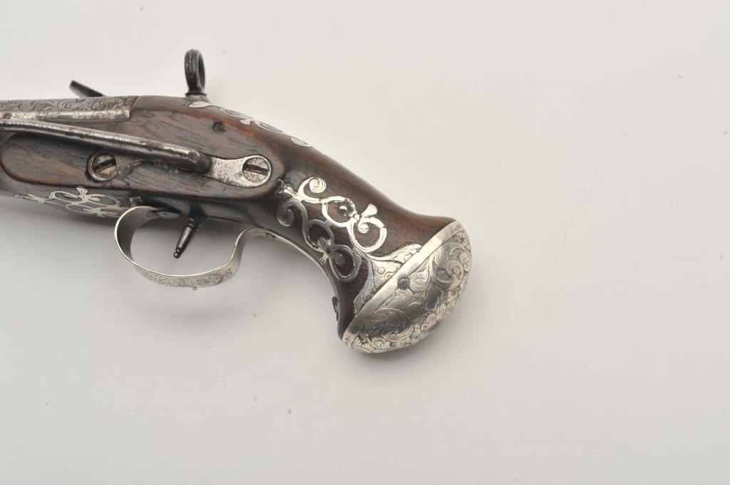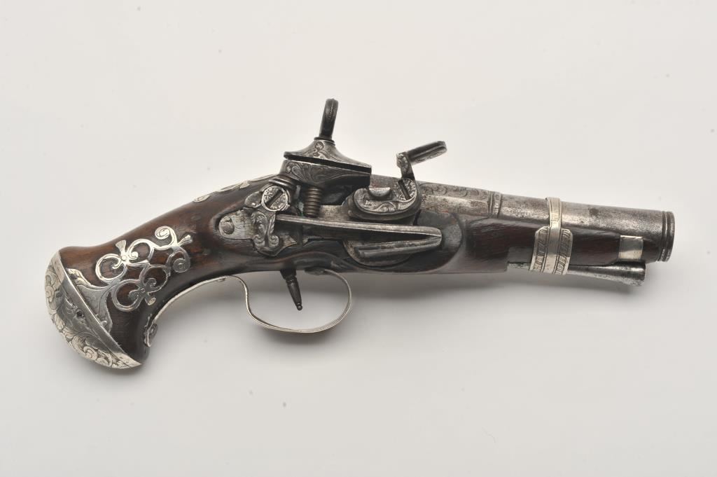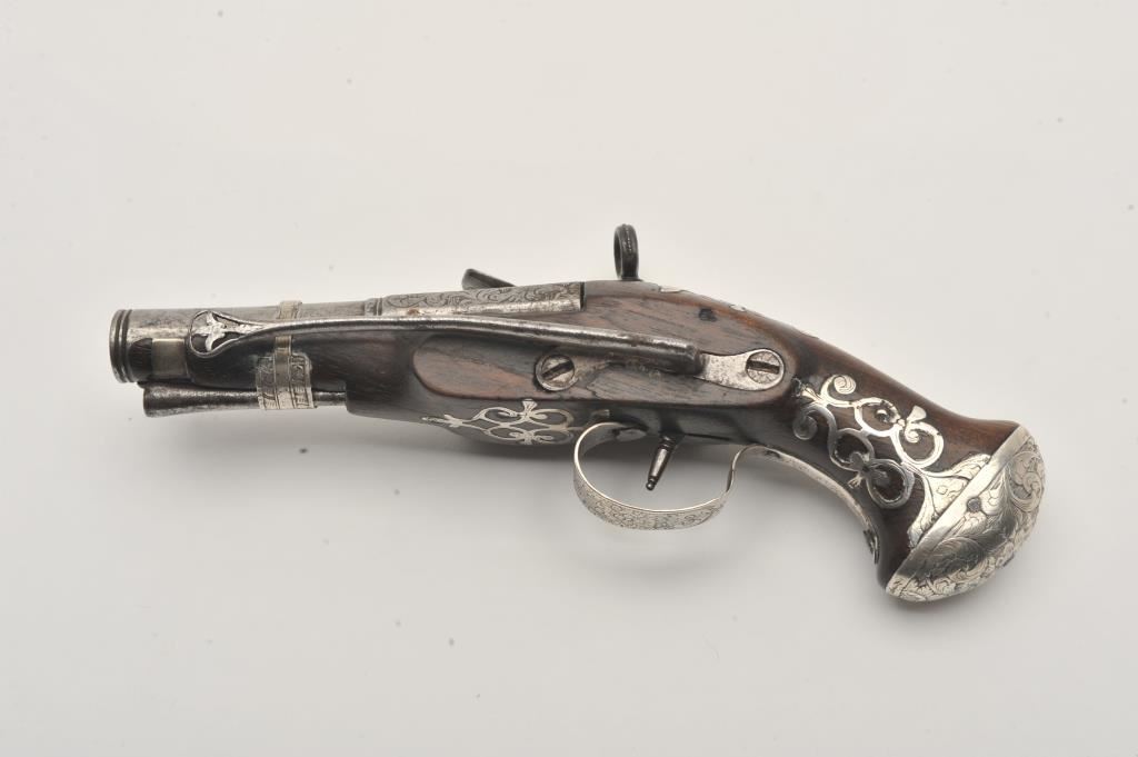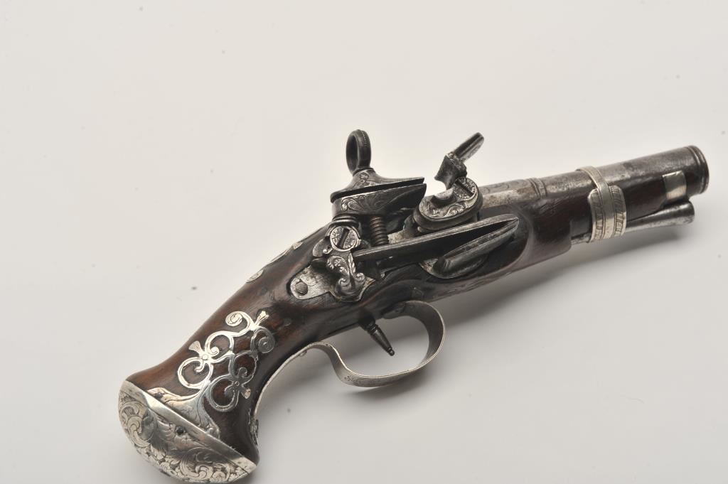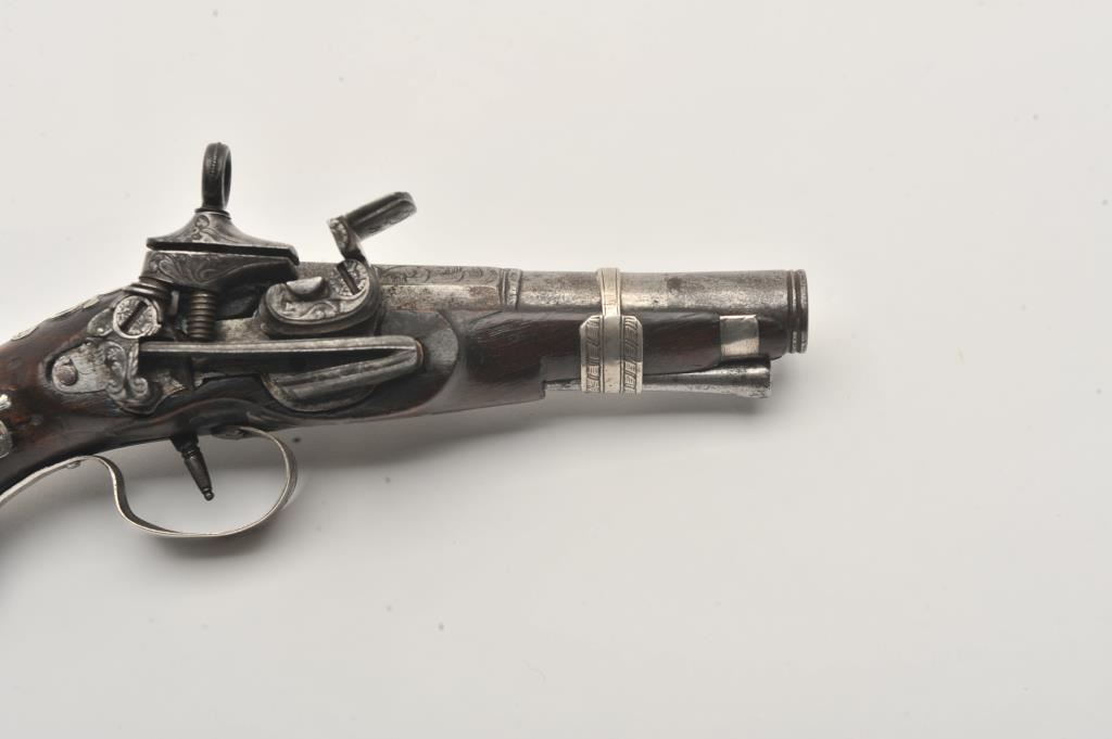 Fully silver mounted Spanish miquelet flintlock pistol possibly Ripol area of Spain but unmarked with no barrel maker’s proof. Measures 9” overall with a 4 ½” barrel of .60 caliber smoothbore. Lightly engraved with pierced silver inlays. Pierced steel original tempered belt hook retained. Late 18th to very early 19th century. Good condition overall with normal aging and minor imperfections. Very hard to find silver mounted miquelets and a life time collector has found only 4! (Antique) Est.: $1500-$3000