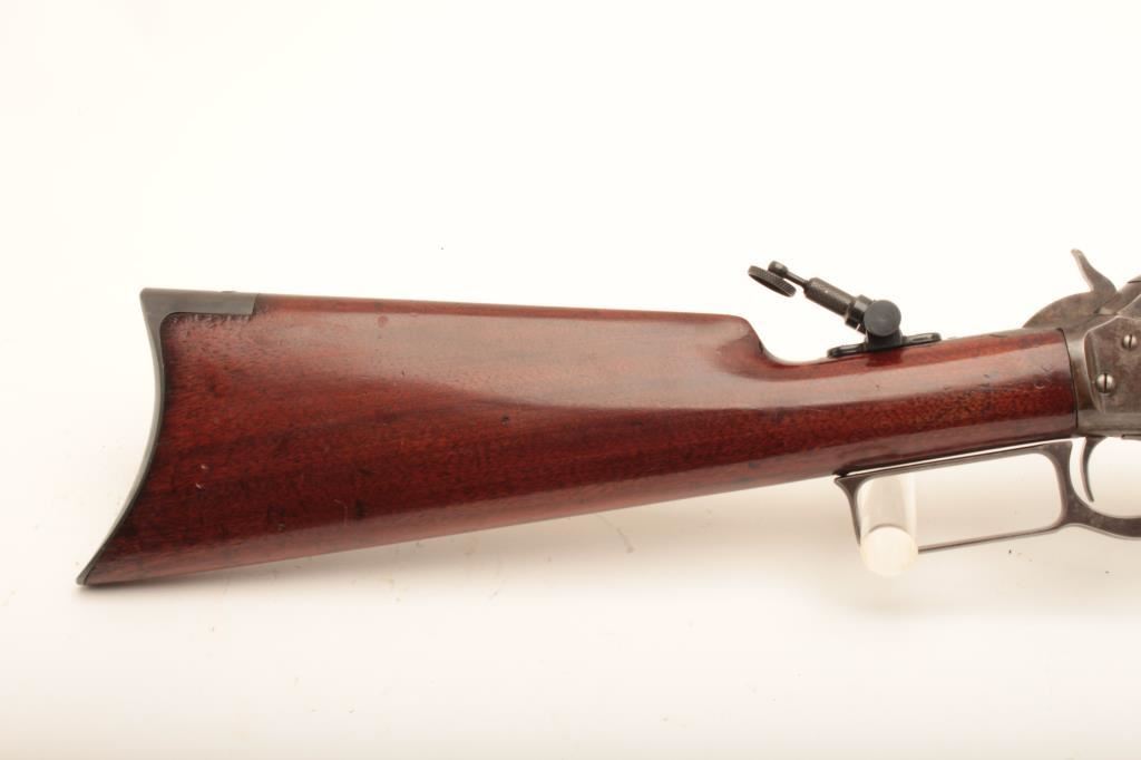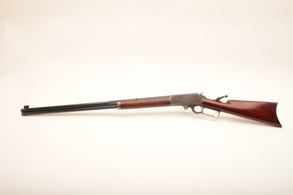Special order Marlin 1893 rifle, #115058, 32-40 cal., 28" half round, half octagon barrel, full mag, crescent butt, hooded front sight with Lyman style tang sight added. Rifle is in very good plus condition, barrel marked "for black powder" as a marketing ploy. Approximately 90% original blue remains on the barrel, traces of case color remains on the receiver. Wood is very good. (Antique) Est. $900-1800