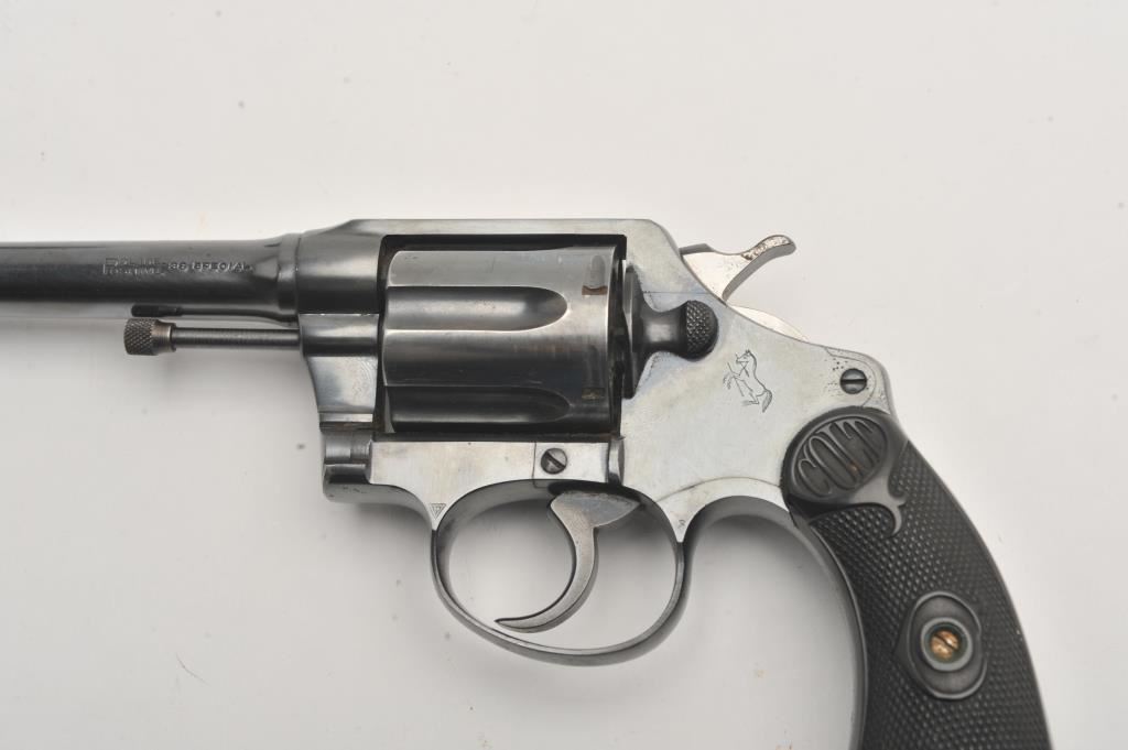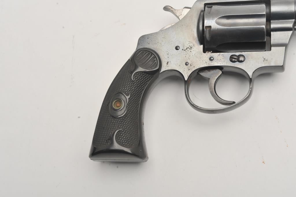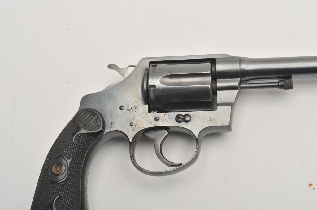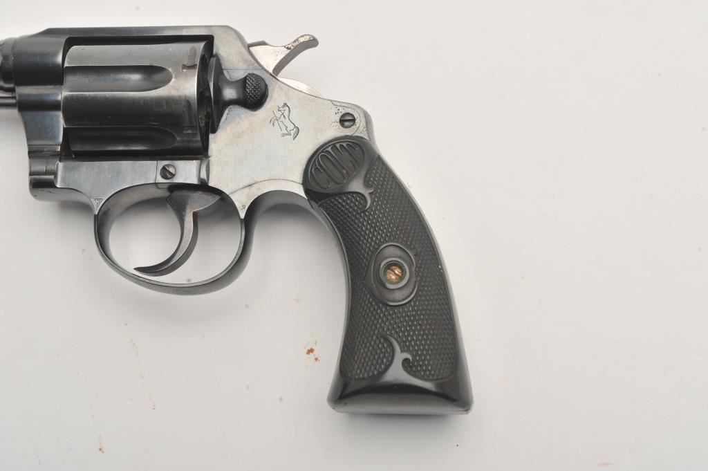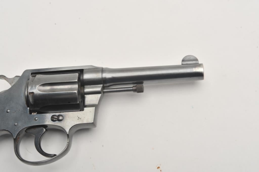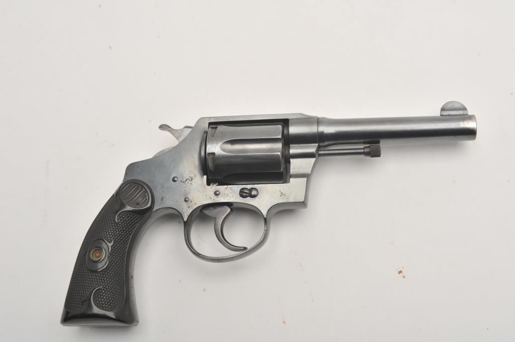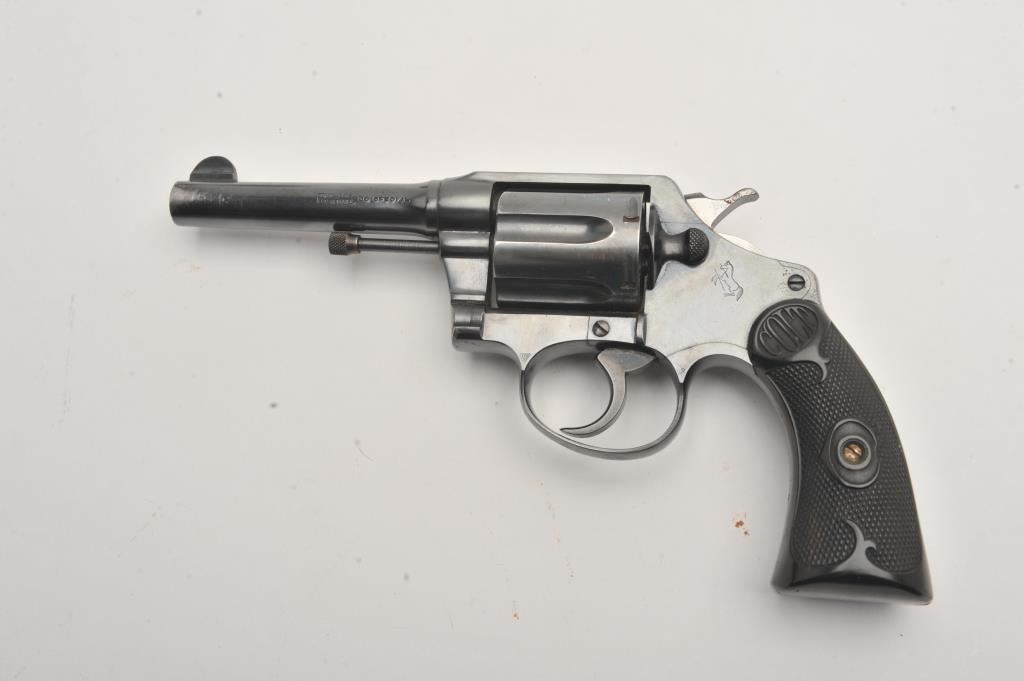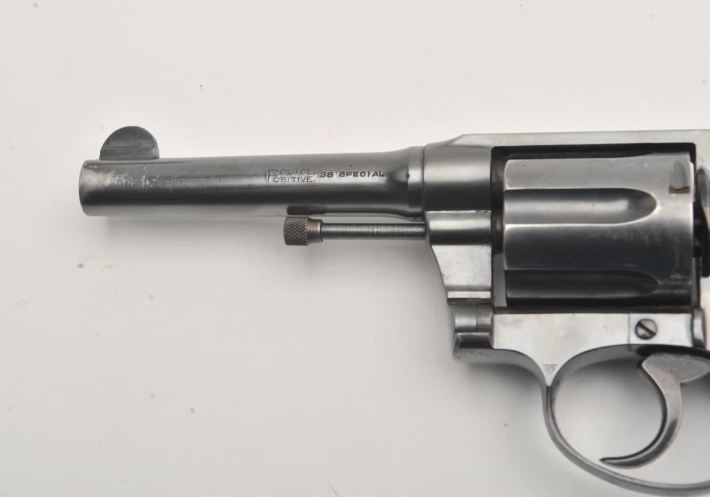 Colt Police Positive DA revolver, .38 Special caliber, 4” barrel, blued finish, checkered hard rubber grips, S/N 136851; overall very good to near fine with majority of blued finish remaining, some holster wear at muzzle, bore may clean to good, crisp action, sharp markings and good grips with slight small old hairline crack at bottom front left toe. (C&R/PPT). Est.: $200-$400.
