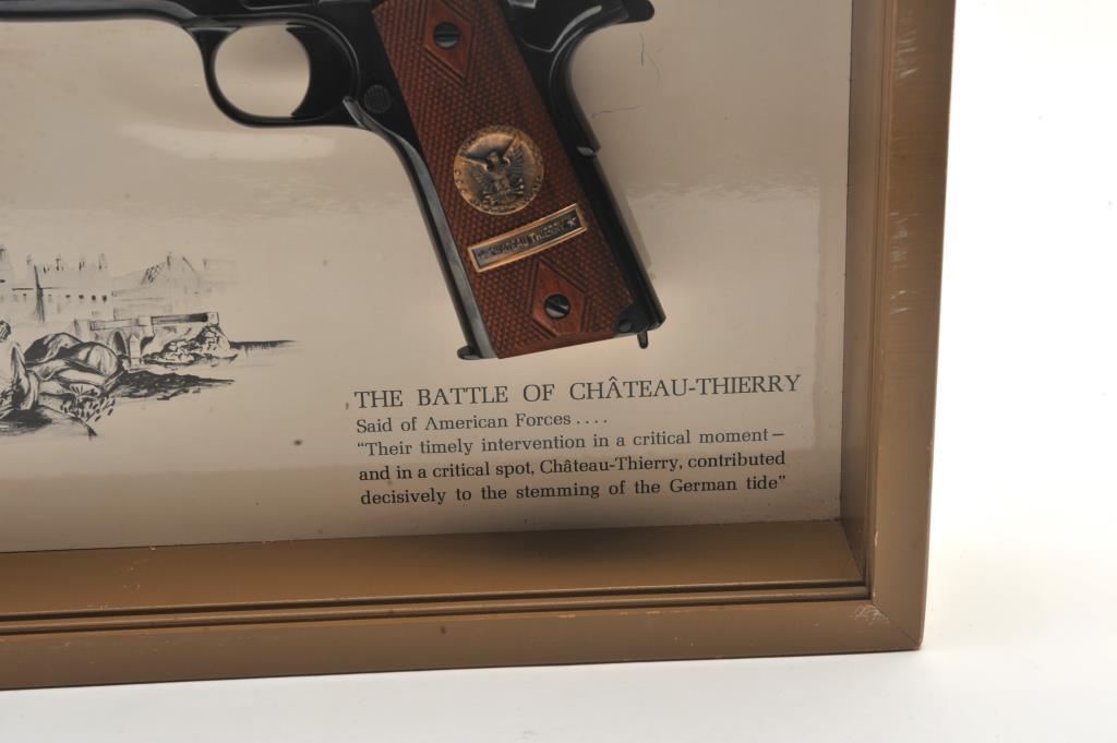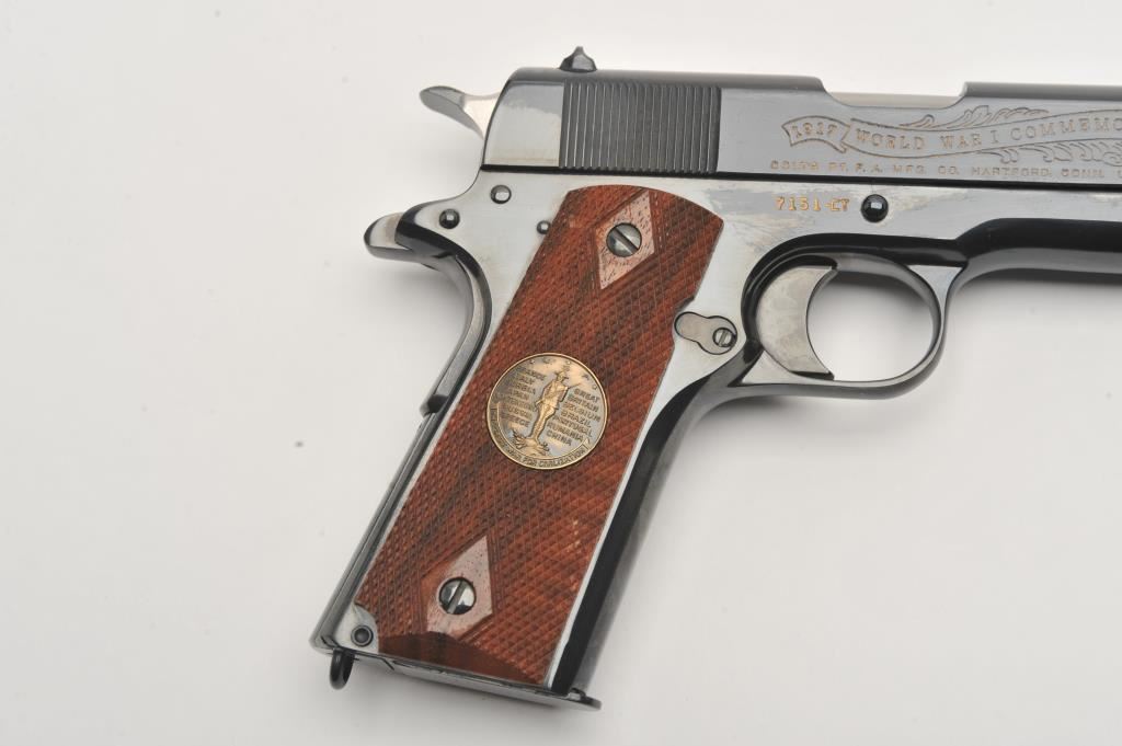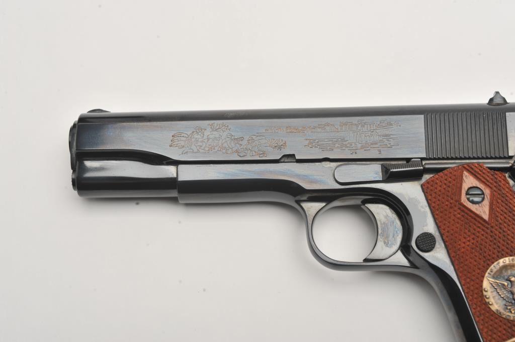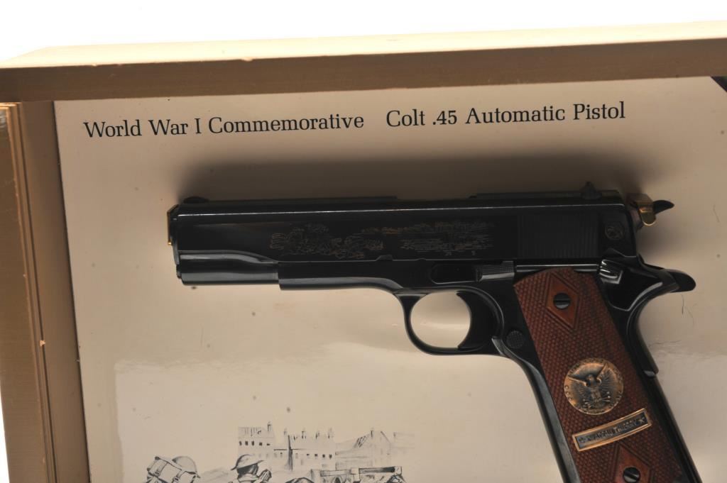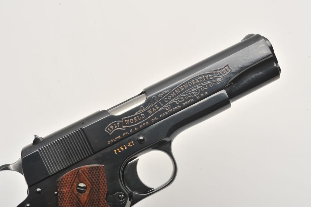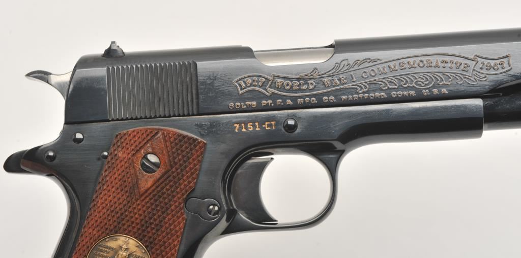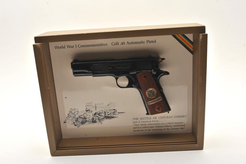 Colt WWI Commemorative .45 1911 Model pistol showing Chateau Thierry motifs and embellishments, S/N 7151CT. Excellent to mint in presentation Colt French style case along with the commemorative display case which shows marks and storage as normal. (C&R/No PPT) Est.: $800-$1600