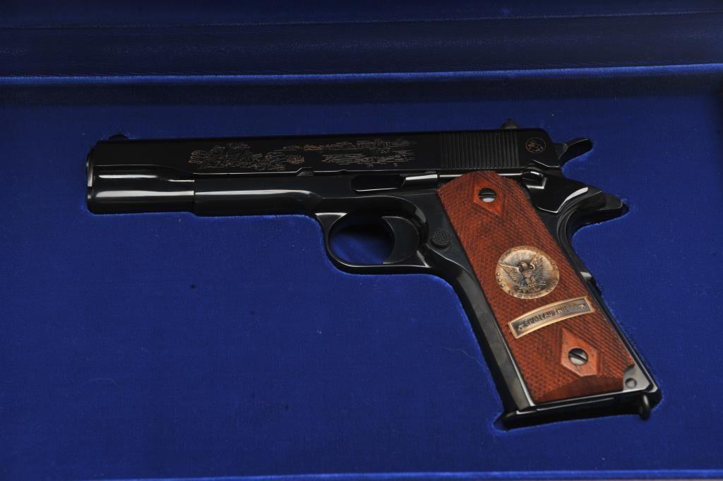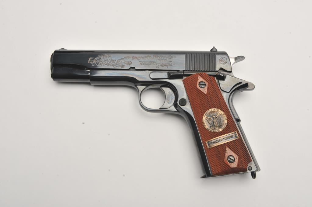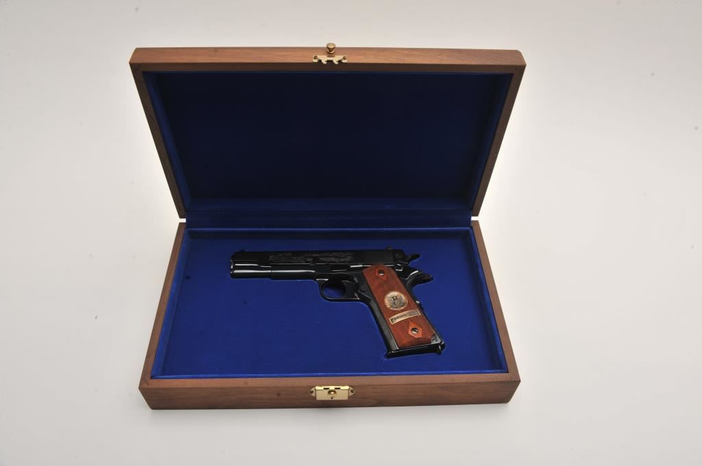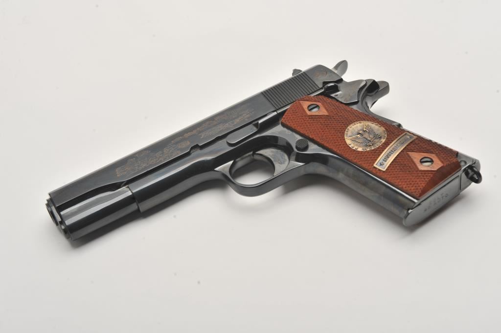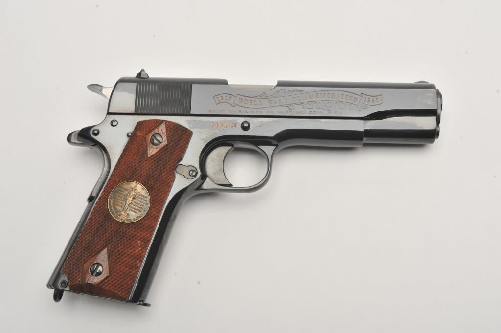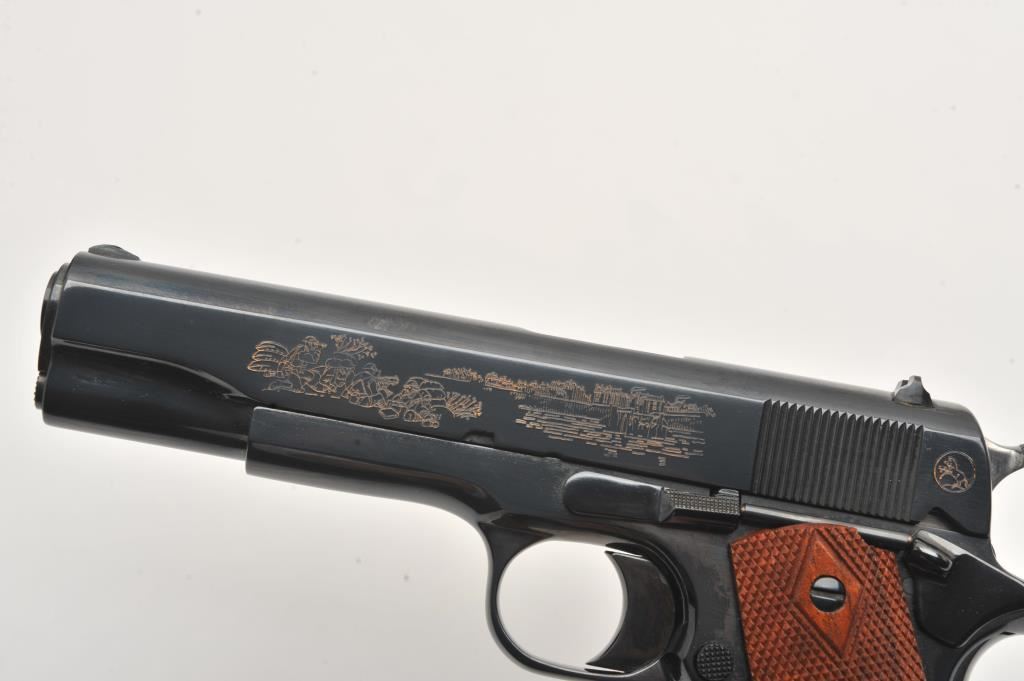 Colt WWI Commemorative .45 1911 Model pistol showing Chateau Thierry motifs and embellishments, S/N 7151CT. Excellent to mint in presentation Colt French style case along with the commemorative display case which shows marks and storage as normal. (C&R/No PPT) Est.: $800-$1600