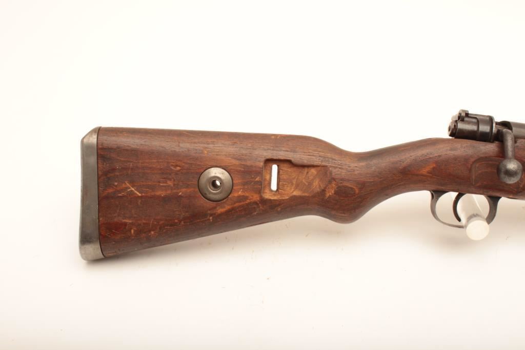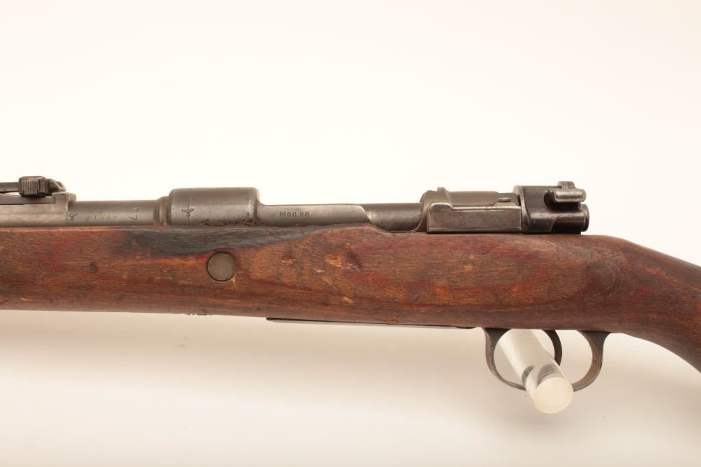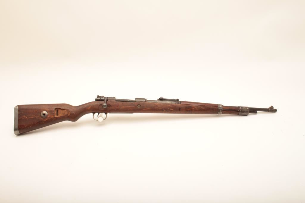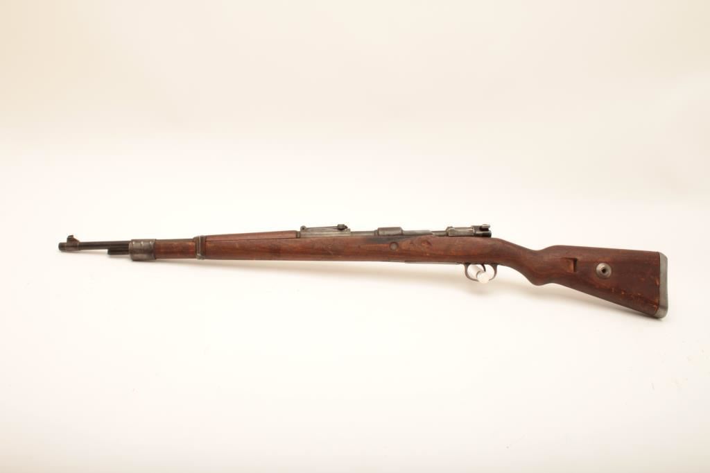 Mauser Model 98 bolt action rifle, marked on top of receiver “ar” and “44”, also with tag indicating Lot 5668 Ellis Props Auction – Day 5; converted to 30-06 blanks only; 24” barrel, military finish, wood stock, S/N 31929, also stamped “599” at breech of barrel and “EEEE 30 06”; gun is in overall un-cleaned good condition with a crisp action, good markings and clean bore; stock is overall good with scattered old mars and scratches from carry and storage(see Lots 304, 314, 328 for other Ellis Props “Movie Guns”). (C&R). Est.: $175-$350.