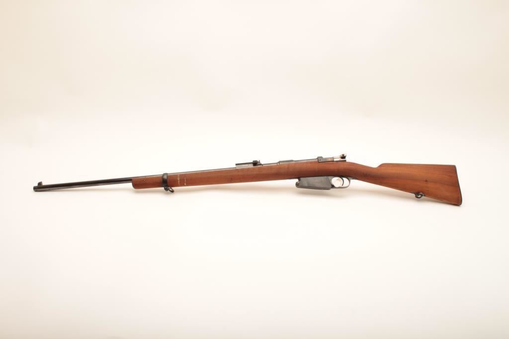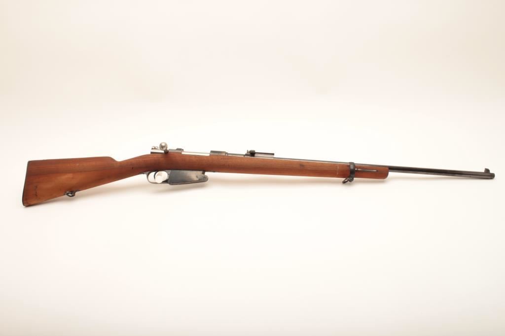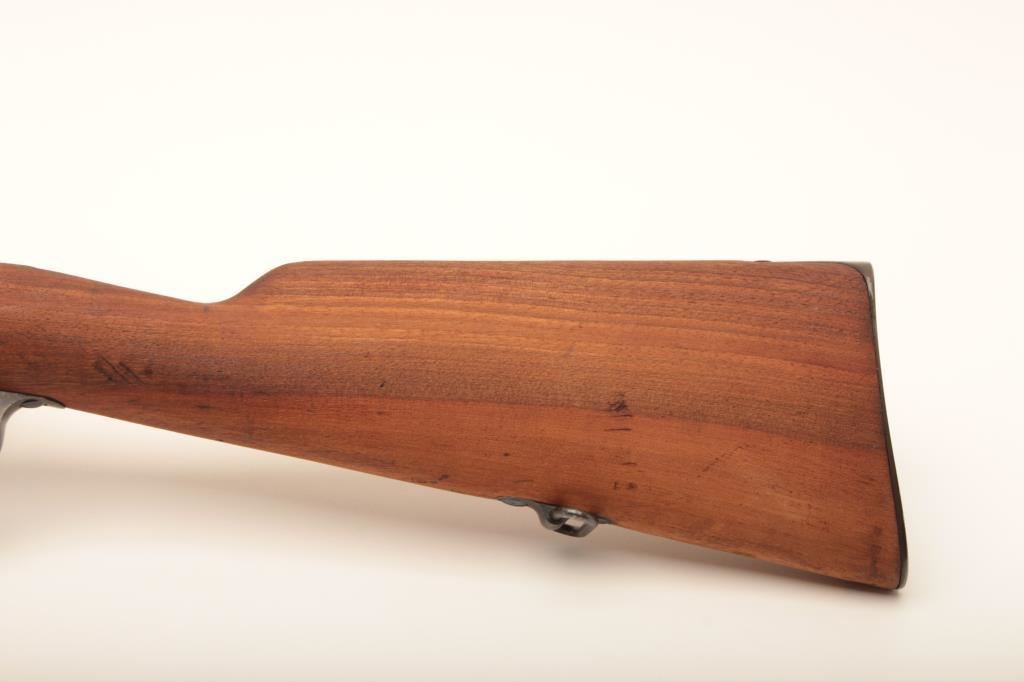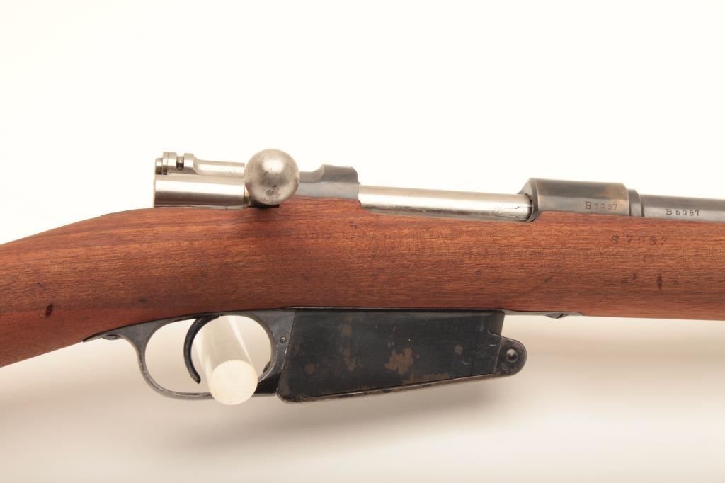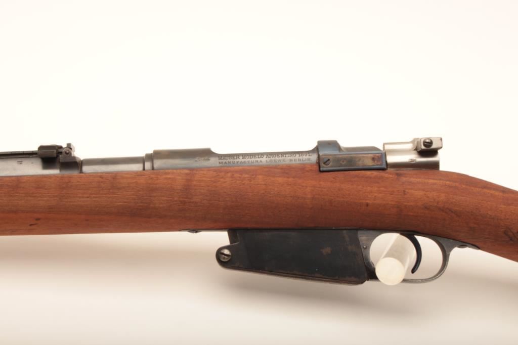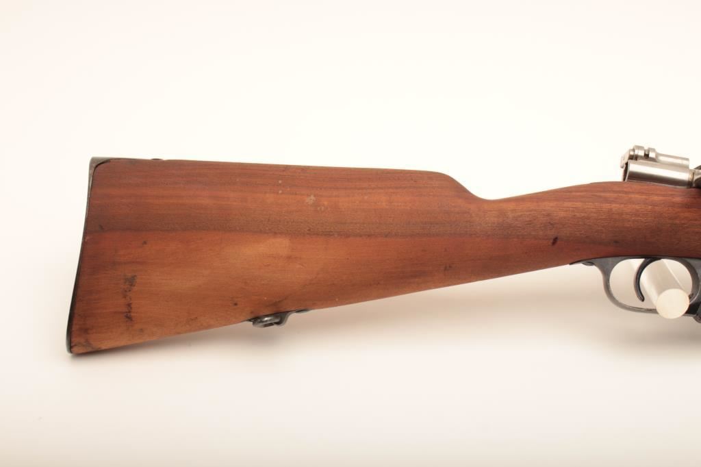 Argentine Mauser Model 1891, #B5087, 7.65 Mauser cal., 29 1/2" barrel, blued with sporterized stock. Rifle is in very good plus condition, as arsenal refinished, original stock has been cut down. Bore is bright, action is very good. Bolt is matching. (Antique) Est. $250-500