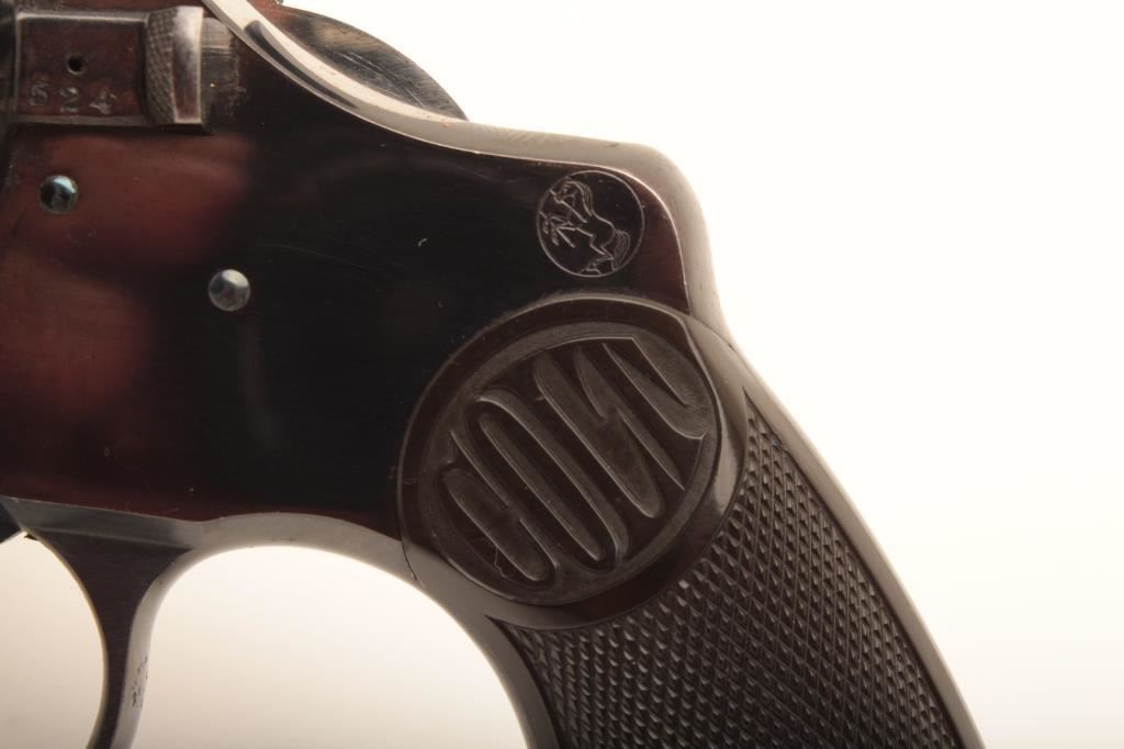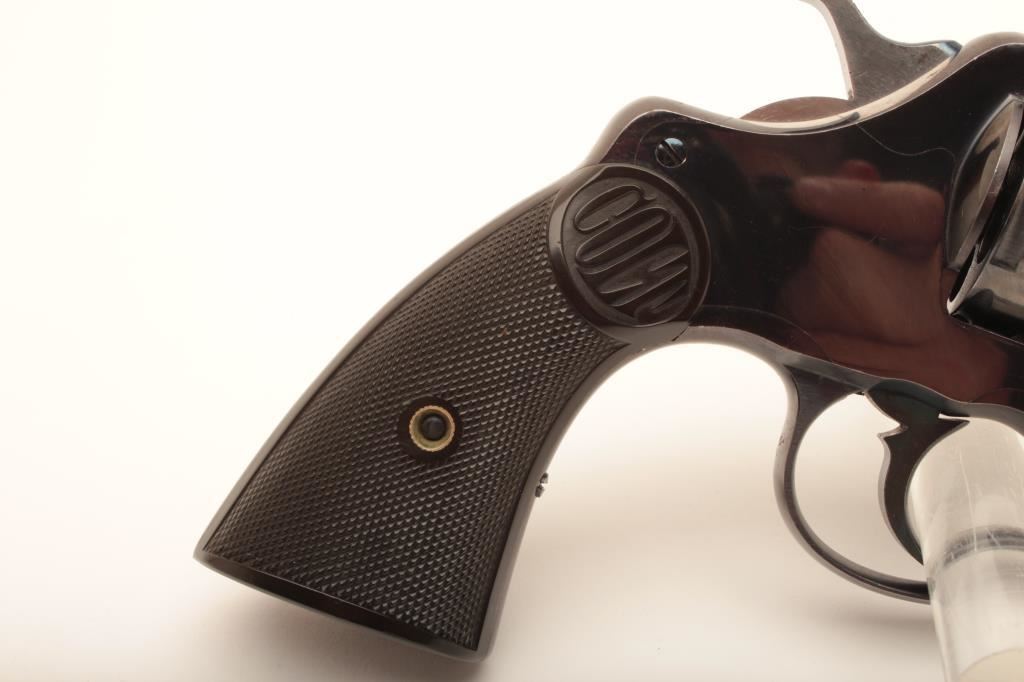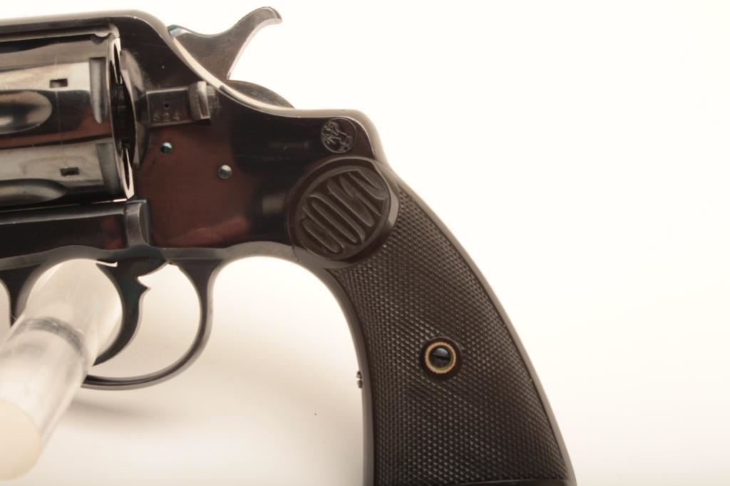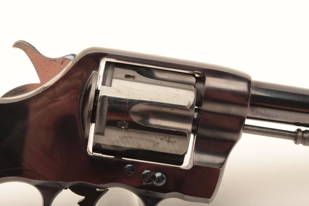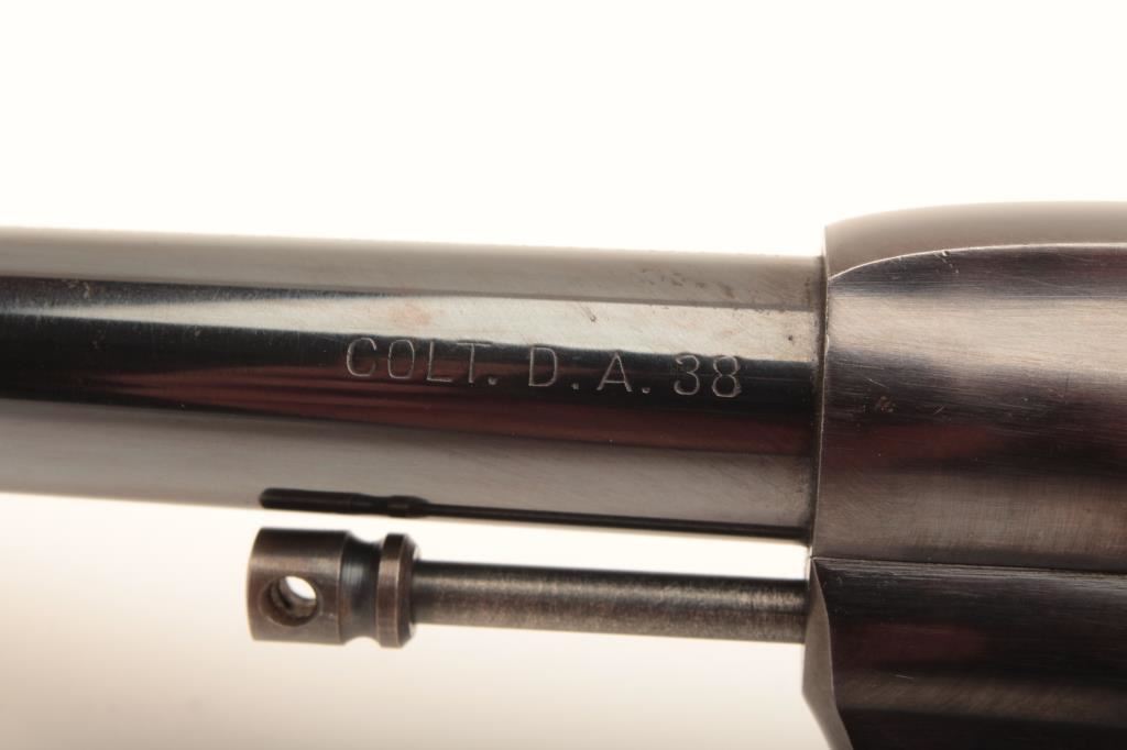 Stunning Colt Model 1903 .38 caliber Double Action revolver with bright original high polish finish, S/N 216429 made in 1903. This fine revolver shows 98%-99% brilliant original blue with very slight index and minuscule loss of finish. Bright original blue on trigger and back of hammer with bright original polish on sides of hammer. Excellent grips and pristine interior. Minor scratches on back strap. A strong 9.8 on a 1-10 scale and difficult to improve on this beautiful and early Colt. Pictured in “Colt and Their Collector’s”. C&R/PPT) Est.: $2500-$5000