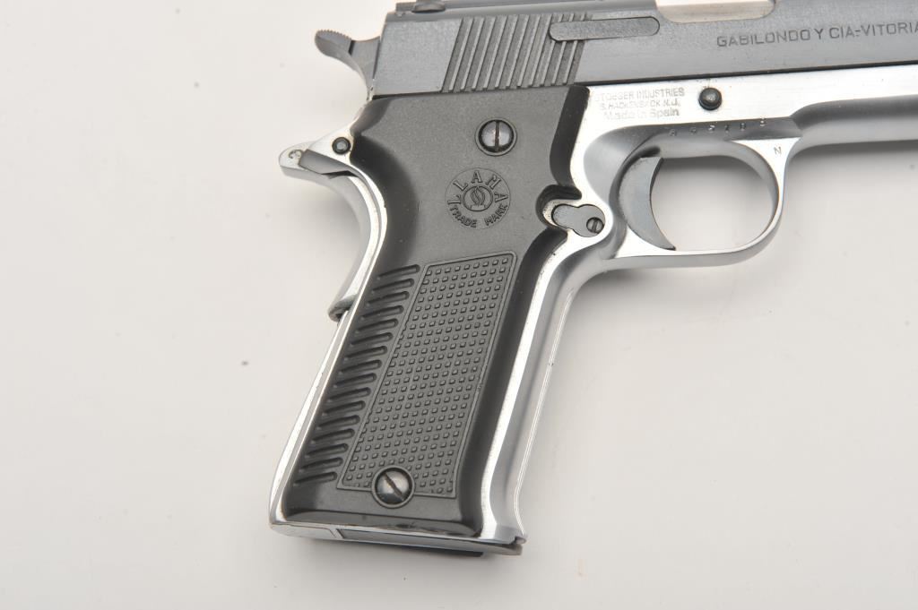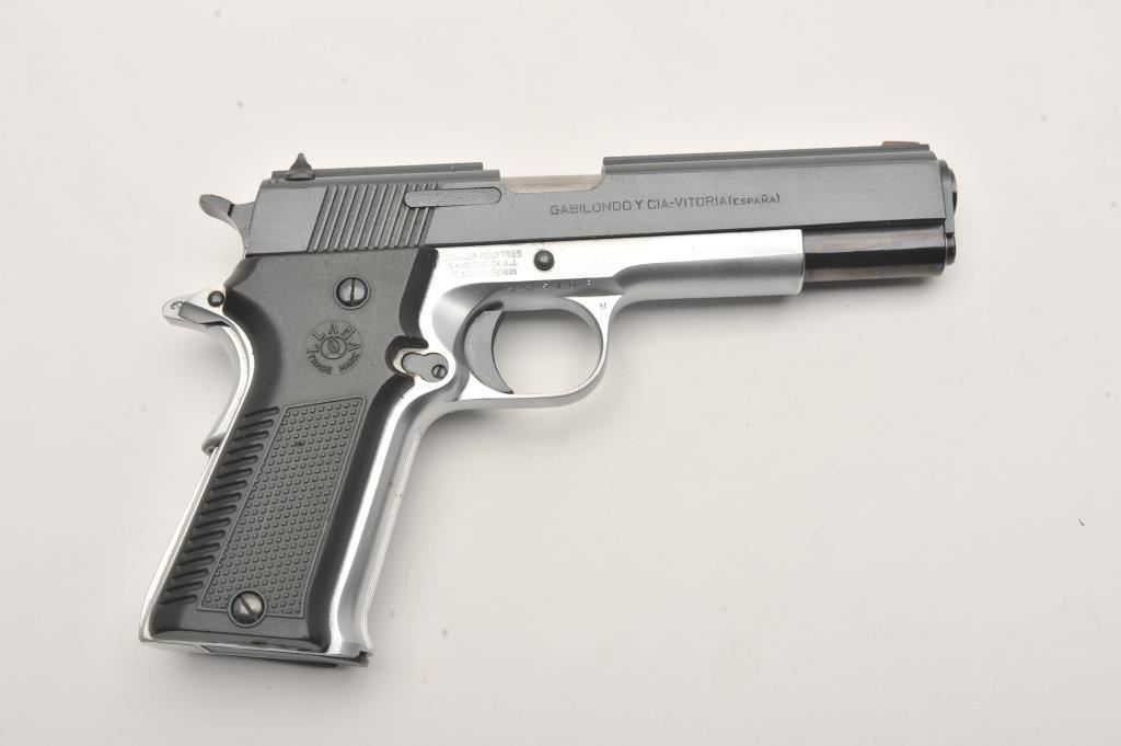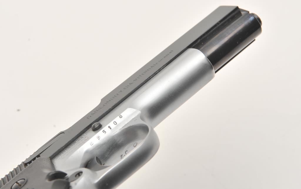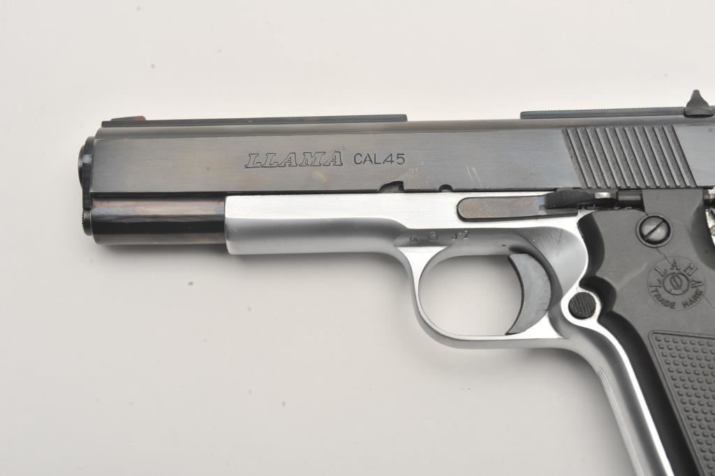 Llama Model IX-A semi-automatic pistol, .45 caliber, Serial #B95108. The pistol is in fine overall condition with a 5” barrel. The slide retains nearly all of its blue finish with wear at the muzzle and a couple of small scratches. The matte stainless steel frame has proofs on the left side and is import marked on the right. The checkered plastic grips are in good condition with a crack at the base of the left panel. The bore is good, the action is crisp and the markings are sharp. The lot includes one correct magazine and the factory plastic case with matching label. Est.: $350-$700. (Modern/PPT).