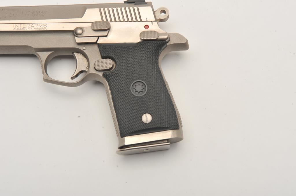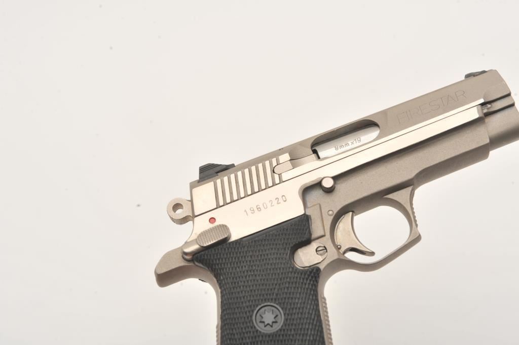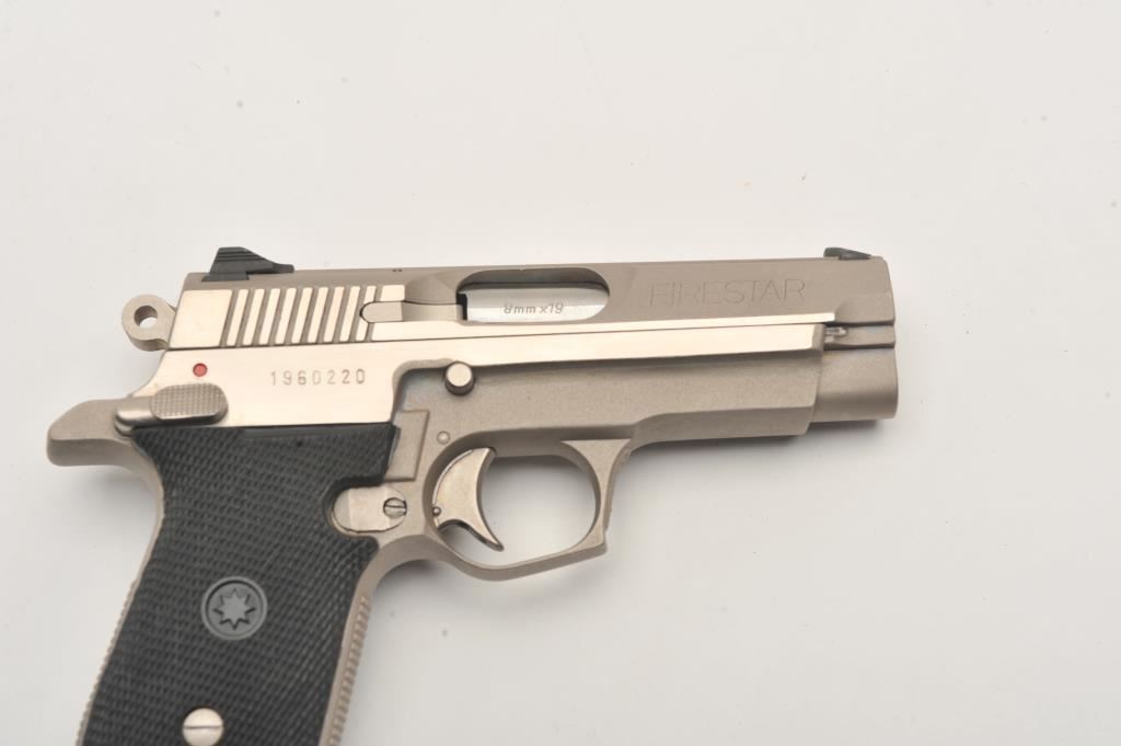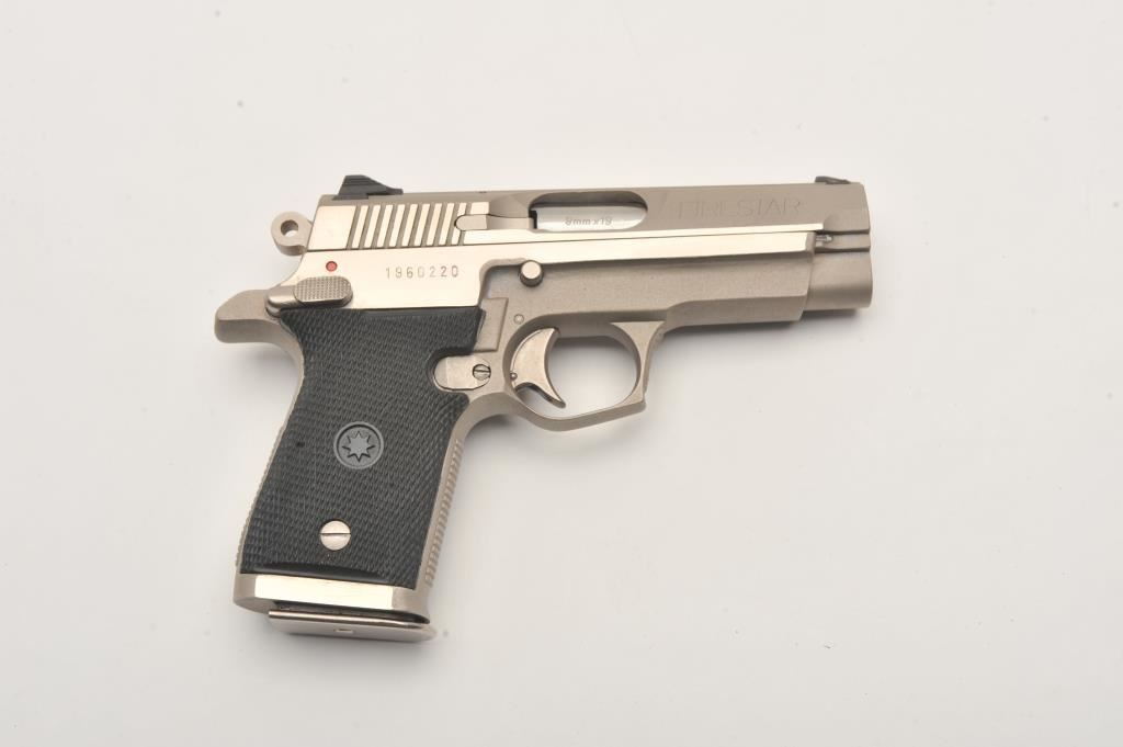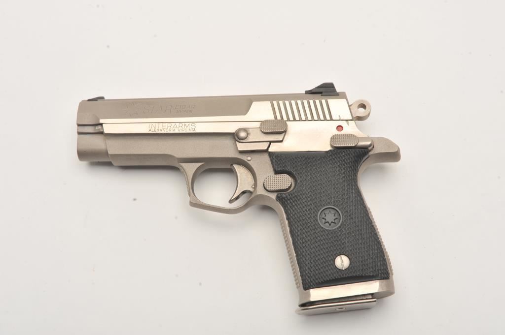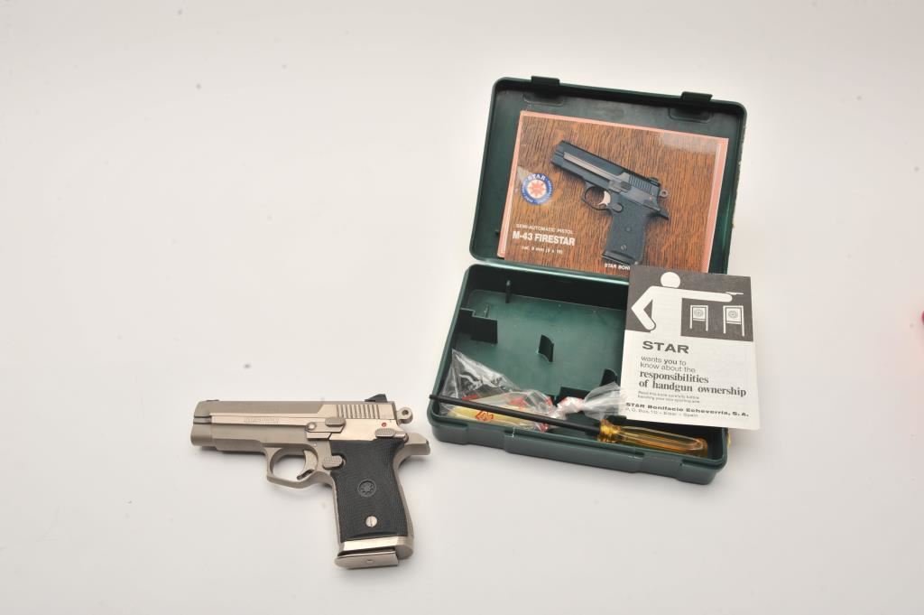Star Model 43 Firestar compact semi-automatic pistol, 9mm caliber, Serial #1960220. The pistol is in excellent overall condition in the factory plastic case with a 3 ¼” barrel. The pistol retains nearly all of its stainless steel finish with only storage marks. The checkered rubber grips are in very good condition showing little wear. The bore is very good, the action is crisp and the markings are sharp. The lot includes one correct magazine and the factory hard case. Est.: $275-$550. (Modern/PPT).