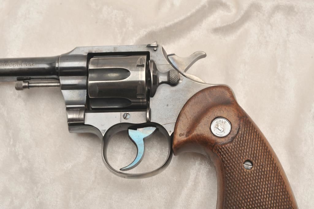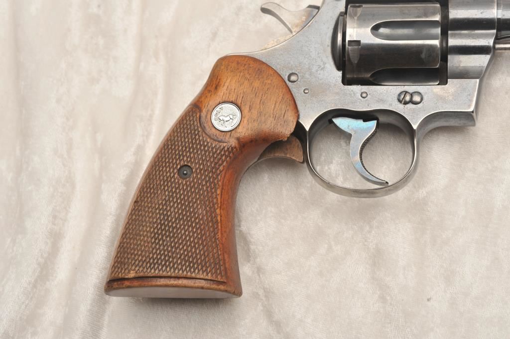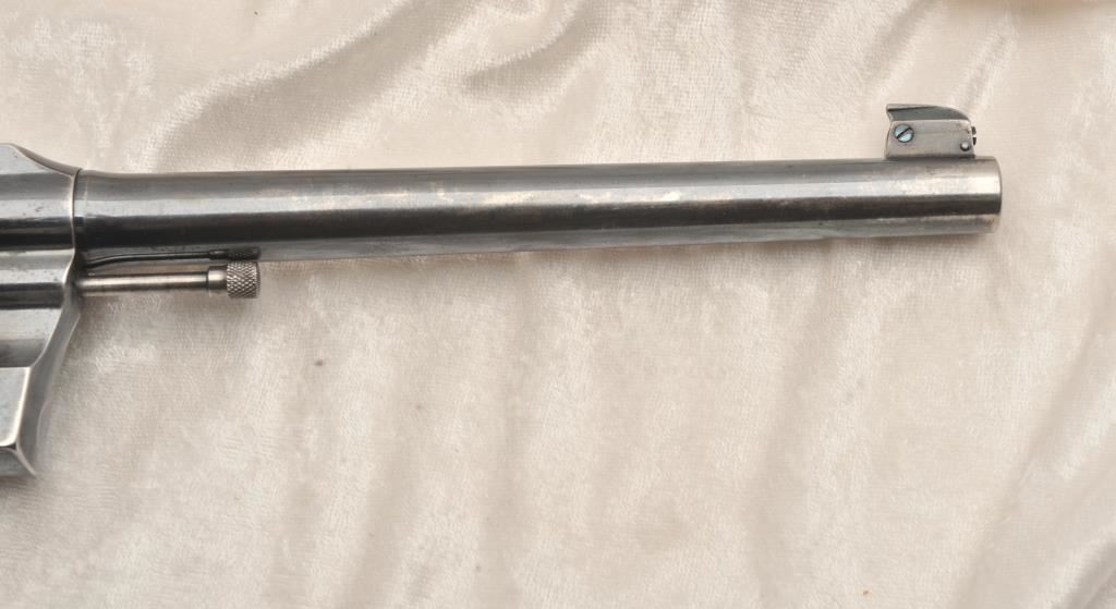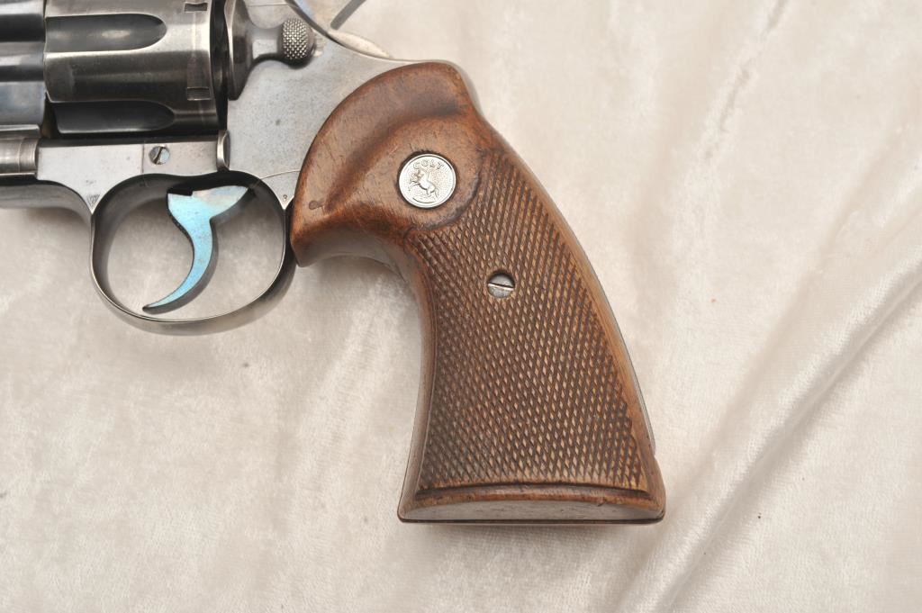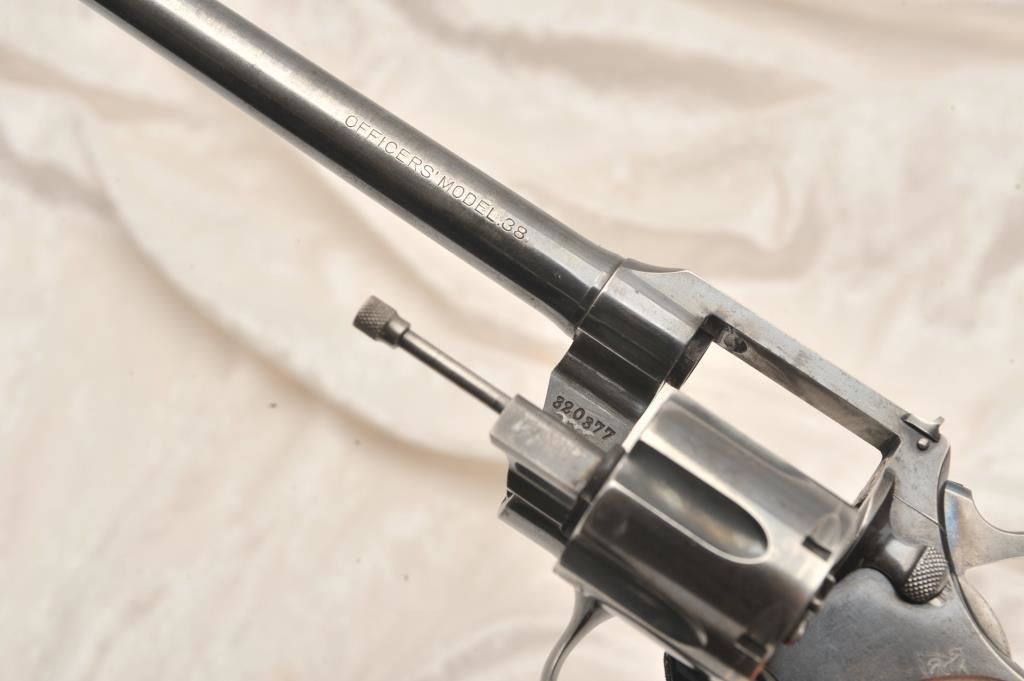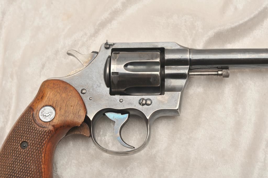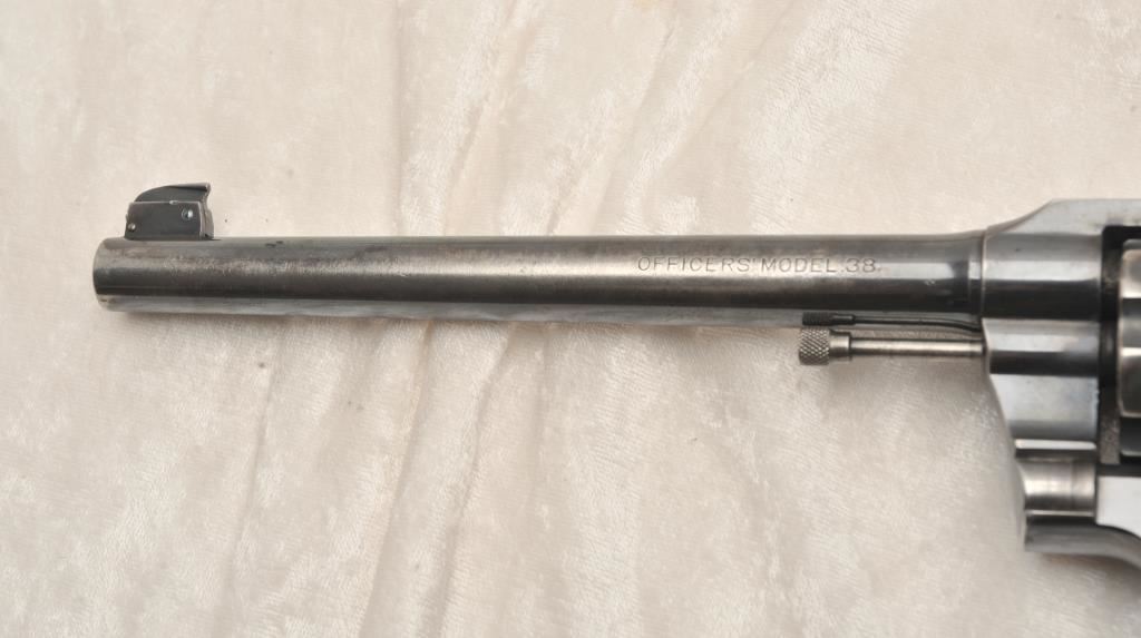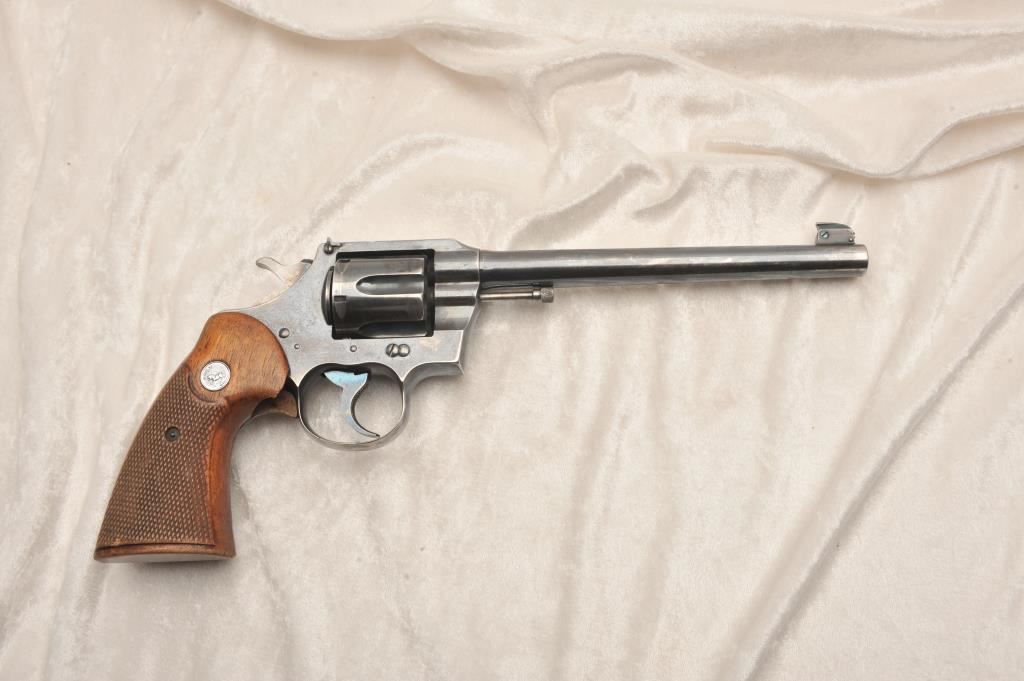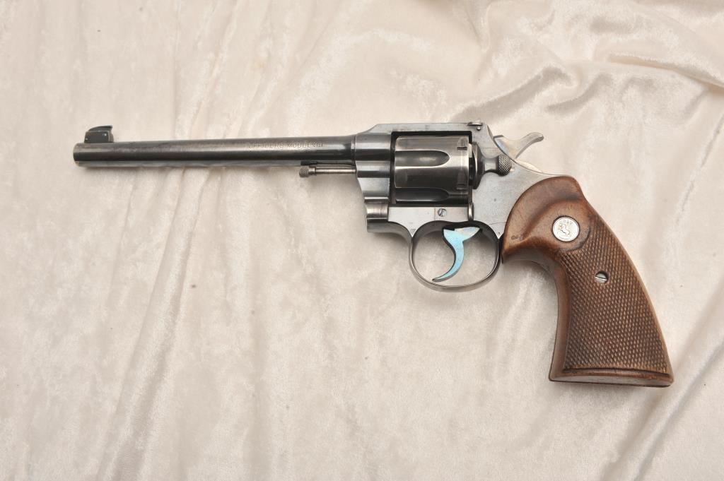 Colt Officers Model Target, #320377, .38 Spl cal., 7 1/2" barrel, blued finish, checkered medallion grips. Revolver is in good to very good condition overall, original blue is thinning, right grip panel is missing a large chip behind the trigger guard. Bore is good, action is good. (C&R) Est. $350-700